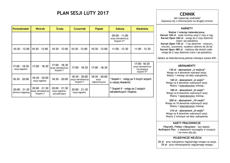 PLAN SESJI LUTY 2017 CENNIK Jak rozpocząć praktykę? Zapoznaj się z informacjami na drugiej stronie. Poniedziałek Wtorek Środa Czwartek Piątek Sobota Niedziela 09:00 – 11:00 sesja odrodzeńcza Stopień II** 10:30 – 12:00 10:30 – 12:00 10:30 – 12:00 10:30 – 12:00 10:30 – 12:00 11:00 – 12:30 11:00 – 12:30 KARNETY Ważne 1 miesiąc kalendarzowy. Karnet 160 zł – stałe terminy sesji 2 razy w tyg. Karnet Open 260 zł – wstęp do 2 razy dziennie (rano i po południu) Karnet Open 155 zł – 1 raz dziennie – emeryci, renciści, uczniowie, studenci dzienni do 26 lat Karnet Open 480 zł – rodzinny dla dwóch osób – wstęp do 2 razy dziennie (rano i po południu). Opłata za kalendarzową połowę miesiąca wynosi 60%. 17:00 – 18:30 sesja łagodna 17:00 – 18:30 17:00 – 18:30 17:00 – 18:30 17:00 – 18:30 sesja odrodzeńcza Stopień I* 18:30 – 20:00 18:30 – 20:00 18:30 – 20:00 18:30 – 20:00 18:30 – 20:00 20:00 – 21:30 20:00 – 21:30 20:00 – 21:30 sesja łagodna sesja odrodzeńcza zdrowy kręgosłup Stopień I* 17:00- 18:30 sesja odrodzeńcza Stopień I* sesja łagodna/ początkująca 20:00 – 21:30 sesja łagodna sesja regeneracyjna sesja odrodzeńcza wyciszająca stopień II** * Stopień I - wstęp po 5 innych sesjach w naszej Akademii. ** Stopień II - wstęp po 2 sesjach odrodzeńczych I Stopnia. ABONAMENTY 130 zł - abonament „4 wejścia” Wstęp na 4 dowolnie wybrane sesje. Ważny 1 miesiąc od daty wykupienia. 160 zł - abonament „6 wejść” Wstęp na 6 dowolnie wybranych sesji. Ważny 1 kalendarzowy miesiąc. 180 zł – abonament „8 wejść” Wstęp na 8 dowolnie wybranych sesji. Ważny 1 kalendarzowy miesiąc. 200 zł - abonament „10 wejść” Wstęp na 10 dowolnie wybranych sesji. Ważny 1 kalendarzowy miesiąc. 210 zł – abonament „8 wejść” Wstęp na 8 dowolnie wybranych sesji. Ważny 2 miesiące od daty wykupienia. KARTY PRACOWNICZE Fitprofit, Fitflex i Oksystem - bez dopłat. Multisport Plus - z dopłatami (szczegóły w recepcji i na www.ahj.pl). POJEDYNCZE WEJŚCIA 25 zł – przy wykupieniu regularnego wstępu na sesje. 35 zł – przy niewykupieniu regularnego wstępu. Jak rozpocząć praktykę jogi w Akademii? Zacznij w dowolnym momencie. Pierwszy raz przyjdź na: 1. Jednorazową specjalną "sesję łagodną" w środę o 20:00. Poznasz tam podstawowe techniki i zasady niezbędne w dalszej praktyce jogi. Ta sesja jest prowadzona specjalnie pod kątem osób początkujących. To zdecydowanie najlepszy sposób rozpoczęcia. 2. Jeśli nie możesz zacząć od w/w sesji, przyjdź na jedną ze zwykłych „sesji łagodnych”: w poniedziałek o 17:00, wtorek o 18:30 lub czwartek o 20:00. 3. Po jednorazowej pierwszej „sesji łagodnej” możesz ćwiczyć na dowolnie wybranych sesjach oprócz „sesji odrodzeńczych”. Zalecamy praktykę 2 – 3 razy w tygodniu lub nawet częściej. Jak się przygotować? - włóż strój niekrępujący ruchów; ćwicz boso (nie wkładaj skarpet) - przyjdź z pustym żołądkiem, duży posiłek zjedz 3—4 godziny wcześniej, przed sesją możesz wypić filiżankę płynu - nie musisz przynosić pomocy do ćwiczeń, na sali jest niezbędny sprzęt (oprócz maty do jogi, która nie jest niezbędna). Na pierwszą sesję zapraszamy 15 minut wcześniej w celu zapoznania się z regulaminem i dopełnienia formalności. Prosimy także o przyniesienie zdjęcia legitymacyjnego do Karty Uczestnika. ul. Wałowa 3, 00-211 Warszawa tel: 22 635 68 69 oraz 601 33 19 39 facebook.com/AkademiaHathaJogi Internet: www.ahj.pl, e-mail: [email protected] Konto: PKO BP nr 80 1020 1013 0000 0102 0102 3894 youtube.com/c/AkademiaHathaJogi