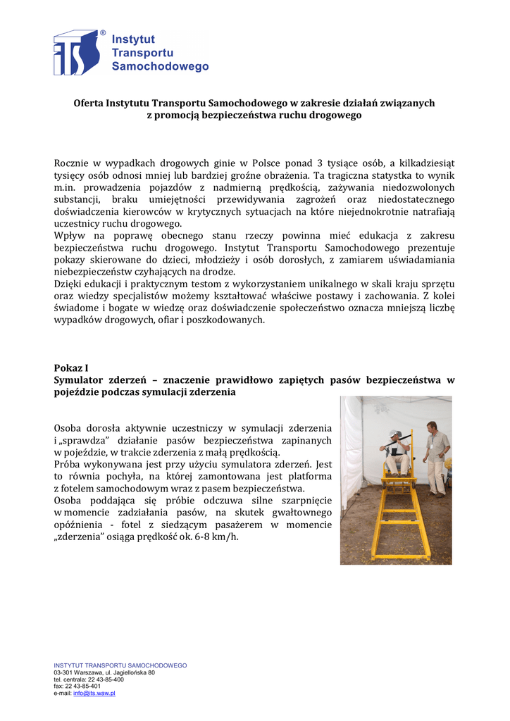 Oferta Instytutu Transportu Samochodowego w zakresie działań związanych z promocją bezpieczeństwa ruchu drogowego Rocznie w wypadkach drogowych ginie w Polsce ponad 3 tysiące osób, a kilkadziesiąt tysięcy osób odnosi mniej lub bardziej groźne obrażenia. Ta tragiczna statystka to wynik m.in. prowadzenia pojazdów z nadmierną prędkością, zażywania niedozwolonych substancji, braku umiejętności przewidywania zagrożeń oraz niedostatecznego doświadczenia kierowców w krytycznych sytuacjach na które niejednokrotnie natrafiają uczestnicy ruchu drogowego. Wpływ na poprawę obecnego stanu rzeczy powinna mieć edukacja z zakresu bezpieczeństwa ruchu drogowego. Instytut Transportu Samochodowego prezentuje pokazy skierowane do dzieci, młodzieży i osób dorosłych, z zamiarem uświadamiania niebezpieczeństw czyhających na drodze. Dzięki edukacji i praktycznym testom z wykorzystaniem unikalnego w skali kraju sprzętu oraz wiedzy specjalistów możemy kształtować właściwe postawy i zachowania. Z kolei świadome i bogate w wiedzę oraz doświadczenie społeczeństwo oznacza mniejszą liczbę wypadków drogowych, ofiar i poszkodowanych. Pokaz I Symulator zderzeń – znaczenie prawidłowo zapiętych pasów bezpieczeństwa w pojeździe podczas symulacji zderzenia Osoba dorosła aktywnie uczestniczy w symulacji zderzenia i „sprawdza” działanie pasów bezpieczeństwa zapinanych w pojeździe, w trakcie zderzenia z małą prędkością. Próba wykonywana jest przy użyciu symulatora zderzeń. Jest to równia pochyła, na której zamontowana jest platforma z fotelem samochodowym wraz z pasem bezpieczeństwa. Osoba poddająca się próbie odczuwa silne szarpnięcie w momencie zadziałania pasów, na skutek gwałtownego opóźnienia - fotel z siedzącym pasażerem w momencie „zderzenia” osiąga prędkość ok. 6-8 km/h. INSTYTUT TRANSPORTU SAMOCHODOWEGO 03-301 Warszawa, ul. Jagiellońska 80 tel. centrala: 22 43-85-400 fax: 22 43-85-401 e-mail: [email protected] W trakcie zderzenia zapięte pasy bezpieczeństwa i poduszki powietrzne chronią pasażerów w pojeździe. Pamiętajmy, że do zapinania pasów bezpieczeństwa zobligowani są wszyscy pasażerowie pojazdu. Jeśli dojdzie do zderzenia, niezapięci pasażerowie z tylnych siedzeń pojazdu mogą spowodować zmiażdżenie osób siedzących z przodu. Pełna symulacja, począwszy od zajęcia miejsca na fotelu i zapięcia pasów, trwa ok. 30 sekund. Pokaz II Symulator dachowania – znaczenie prawidłowo zapiętych pasów bezpieczeństwa w pojeździe podczas symulacji jego dachowania Próba ma charakter symulacji, w której pasażerowie sprawdzają działanie pasów bezpieczeństwa w trakcie pozorowanego dachowania pojazdu. Symulator dachowania bazuje na nadwoziu samochodu OPEL ASTRA IV zamocowanym na stelażu. Karoseria obraca się w osi poziomej. Prędkość obrotu i chwilowe postoje w określonych pozycjach reguluje specjalnie wyszkolony operator. Symulator obraca się znacznie wolniej niż ma to miejsce w rzeczywistości, dzięki temu doskonale obrazuje jak może zakończyć się zbyt szybka jazda i utrata panowania nad pojazdem. W trakcie symulacji dachowania wisząc głową w dół można doświadczyć, jak zachowują się w kabinie niezabezpieczone, luźne przedmioty (np. puste butelki, telefon komórkowy). Łatwo także wyobrazić sobie, co dzieje się z osobami niezabezpieczonymi pasami bezpieczeństwa w trakcie dachowania! Jedna symulacja (pełny obrót), w której mogą uczestniczyć maksymalnie dwie dorosłe osoby, trwa 30 sekund. Symulacja przeznaczona jest dla osób pełnoletnich, u których nie występują przeciwwskazania zdrowotne. INSTYTUT TRANSPORTU SAMOCHODOWEGO 03-301 Warszawa, ul. Jagiellońska 80 tel. centrala: 22 43-85-400 fax: 22 43-85-401 e-mail: [email protected] Pokaz III Demonstracja działania ALKOgogli ALKOgole służą do demonstracji upośledzenia ludzkich zmysłów występujących m.in. po spożyciu alkoholu (0,4-1,7 promila), co objawia się obniżeniem koncentracji, spowolnieniem reakcji, niemożnością prawidłowego określenia kierunków, zniekształceniem widzianego obrazu, zmianą w ocenie odległości, zmniejszeniem możliwości oceny sytuacji, podwójnym widzeniem i ogólnym brakiem koordynacji mięśniowej. W ALKOgoglach przeprowadzane są testy na trzeźwość, czyli np. spacer po prostej linii, rzut piłeczką do celu, podanie ręki, itp. Podczas każdej demonstracji, dostępne są następujące modele ALKOgogli: - model A dzienne (zakres 0,4-0,6 promila) - model B dzienne (zakres 0,8-1,5 promila) - model C nocne (zakres 0,6-0,8 promila) - model D nocne (zakres 1-1,7 promila) Pokaz IV Kącik dla Dzieci Dzieci biorą czynny udział w grach, zabawach, konkursach plastycznych, rozwiązują zagadki, rebusy, krzyżówki, pod okiem specjalistów z ITS. Najmłodsi uczestnicy imprezy otrzymują nagrody. Wszystkie prezentowane materiały są wysokiej jakości, mają stosowne certyfikaty. Instytut Transportu Samochodowego dysponuje również niżej wymienionymi urządzeniami pokazowymi. Oferty na poniższe urządzenia są ustalane indywidualnie. Pokaz V Urządzenie treningowe poprawiające czas reakcji Urządzenie poprawia czas reakcji, ćwiczy zręczność, koordynację wzrokowo-ruchową, mobilność. INSTYTUT TRANSPORTU SAMOCHODOWEGO 03-301 Warszawa, ul. Jagiellońska 80 tel. centrala: 22 43-85-400 fax: 22 43-85-401 e-mail: [email protected] Przeznaczone jest do użytku przez osoby w różnym wieku (dostępne różne programy). Może być wykorzystane np. w połączeniu z ALKOgoglami. Test reakcji polega na jak najszybszym wciskaniu zapalających się losowo przycisków z diodami LED, sterowanych przez wewnętrzny mikrokomputer. Osiągane wyniki są na bieżąco prezentowane na wyświetlaczu LCD. Pokaz VI Symulatora Wybuchu Poduszki Powietrznej Urządzenie obrazuje wybuch poduszki powietrznej, która otwiera się z przeciętną prędkością 320 km/h, co trwa 0,0025 sekundy. Poduszka