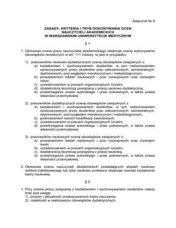 Załącznik Nr 9 ZASADY, KRYTERIA I TRYB DOKONYWANIA OCEN NAUCZYCIELI AKADEMICKICH W WARSZAWSKIM UNIWERSYTECIE MEDYCZNYM § 1. 1. Okresowa ocena pracy nauczyciela akademickiego obejmuje ocenę wykonywania obowiązków określonych w art. 111 Ustawy, to jest w przypadku: 1) pracowników naukowo-dydaktycznych ocenę obowiązków związanych z: a) kształceniem i wychowywaniem studentów, w tym nadzorowaniem opracowywanych przez studentów prac zaliczeniowych, semestralnych, dyplomowych, pod względem merytorycznym i metodologicznym, b) prowadzeniem badań naukowych i prac rozwojowych oraz rozwojem nauki, c) uczestniczeniem w pracach organizacyjnych Uczelni, d) działalnością leczniczą powiązaną z pracą naukowo-dydaktyczną, e) przestrzegania prawa autorskiego i praw pokrewnych, a także prawa własności przemysłowej. 2) pracowników dydaktycznych ocenę obowiązków związanych z: a) kształceniem i wychowywaniem studentów, w tym nadzorowaniem opracowywanych przez studentów prac zaliczeniowych, semestralnych, dyplomowych, pod względem merytorycznym i metodologicznym, b) podnoszeniem swoich kwalifikacji zawodowych, c) uczestniczeniem w pracach organizacyjnych Uczelni, d) przestrzegania prawa autorskiego i praw pokrewnych, a także prawa własności przemysłowej. 3) pracowników naukowych ocenę obowiązków związanych z: a) prowadzeniem badań naukowych i prac rozwojowych oraz rozwojem nauki, b) uczestniczeniem w pracach organizacyjnych Uczelni, c) działalnością leczniczą powiązaną z pracą naukową, d) przestrzegania prawa autorskiego i praw pokrewnych, a także prawa własności przemysłowej. 2. Okresowa ocena nauczycieli akademickich posiadających stopień naukowy doktora habilitowanego lub tytuł naukowy profesora obejmuje również kształcenie kadry naukowej. § 2. 1. Przy ocenie pracy związanej z kształceniem i wychowywaniem studentów należy brać pod uwagę: 1) poziom i aktualność przekazywanych treści nauczania, 2) rzetelność w realizowaniu obowiązków dydaktycznych, 3) sposób prowadzenia zajęć dydaktycznych, w tym umiejętność nawiązywania kontaktu ze studentami, 4) opracowywanie nowych programów, metod i treści nauczania, 5) publikacje dydaktyczne, w tym: podręczniki, skrypty, artykuły i referaty, 6) opiekę nad studentami realizującymi indywidualny program studiów, bądź wykonującymi prace licencjackie i magisterskie, 7) wyniki osiągnięte w kształceniu kadry naukowej przy ocenie osób z tytułem naukowym profesora lub stopniem naukowym doktora habilitowanego, 8) opiekę na kołami naukowymi, 9) opinię studentów i doktorantów dotyczącą wypełniania obowiązków dydaktycznych. 2. Przy ocenie działalności naukowej należy brać pod uwagę: 1) udział w badaniach naukowych własnych i zespołowych, 2) monografie, publikacje naukowe i popularno-naukowe, z uwzględnieniem rangi wydawnictw lub czasopism, w których się ukazały, 3) promotorstwo prac doktorskich, magisterskich i licencjackich, 4) recenzje prac doktorskich i habilitacyjnych, magisterskich i licencjackich, 5) udział w kolegiach redakcyjnych czasopism naukowych, 6) recenzje książek, prac, programów i artykułów naukowych, 7) udział w postępowaniach o nadanie stopnia naukowego lub tytułu naukowego profesora , 8) uczestnictwo w kongresach, konferencjach i sympozjach z uwzględnieniem rangi naukowej wydarzenia i charakteru uczestnictwa ocenianego w tym wydarzeniu, 9) uczestnictwo i funkcje pełnione w krajowych i międzynarodowych organizacjach i towarzystwach naukowych, 10) nagrody i wyróżnienia instytucji i towarzystw naukowych. 3. Przy ocenie działalności organizacyjnej w Uczelni należy brać pod uwagę: 1) sprawowanie funkcji organów jednoosobowych, 2) sprawowanie funkcji członków organów kolegialnych, 3) sprawowanie funkcji kierowniczych w jednostkach organizacyjnych Uczelni, 4) uczestniczenie w pracach komisji, rad i innych zespołów powoływanych w Uczelni, 5) uczestnictwo w wybieralnych organach przedstawicielskich szkolnictwa wyższego i ochrony zdrowia, 6) sprawowanie funkcji opiekuna grupy studenckiej lub roku specjalizacji, studiów doktoranckich, praktyk studenckich itp., 7) aktywność w pozyskiwaniu środków na badania ze źródeł zewnętrznych. 4. Przy ocenie działalności leczniczej powiązanej z pracą naukową i dydaktyczną, należy brać pod uwagę: 1) osiągnięcia związane ze organizacją lub rozwojem placówki medycznej, 2) wprowadzenie nowych metod diagnostycznych lub leczniczych, 3) wykonywanie zadań konsultanta krajowego lub wojewódzkiego, 4) zgłoszenia patentowe, 5) inne osiągnięcia związane z udzielaniem świadczeń zdrowotnych. § 3. 1. Skala ocen nauczycieli akademickich jest trzystopniowa, z zastrzeżeniem ust. 2: 1) ocena wyróżniająca, 2) ocena pozytywna, 3) ocena negatywna, 2. Skala ocen nauczycieli akademickich zatrudnionych na stanowiskach: profesora zwyczajnego i profesora nadzwyczajnego jest pięciostopniowa: 1) ocena wyróżniająca, 2) ocena pozytywna, 3) ocena standardowa, 4) ocena wystarczająca, 5) ocena negatywna. 3. Ocena wyróżniająca i negatywna wymagają pisemnego uzasadnienia dokonanego przez przełożonego i właściwą komisję oceniającą. § 4. 1. Oceny nauczycieli akademickich zatrudnionych w wydziałach dokonują wydziałowe komisje ds. oceny nauczycieli akademickich, o których mowa w § 57 ust. 1 pkt 13 Statutu, z zastrzeżeniem ust. 2. 2. Szczególne kompetencje Senackiej Komisji ds. Oceny Profesorów oraz Uczelnianej Komisji ds. Oceny Nauczycieli Akademickich, zwanych dalej razem z wydziałowymi komisjami ds. oceny nauczycieli akademickich „komisjami oceniającymi”, w zakresie przeprowadzania oceny nauczycieli akademickich określa załącznik Nr 8 do niniejszego Statutu. 3. Komisje oceniające są organami opiniodawczymi i doradczymi odpowiednio Rektora, Prorektora ds. Kadr i Dziekanów. 4. Za organizację, przebieg oraz prawidłowość dokonywanych ocen odpowiadają: 1) Dzi