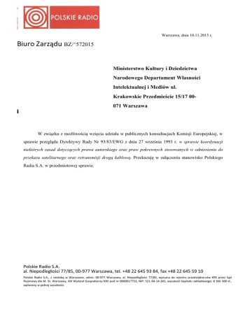 przekazu satelitarnego oraz retransmisji drogą kablową. Przekazuję w załączeniu stanowisko Polskiego