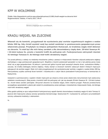 KPP W WOŁOMINIE Źródło: http://kppwolomin.policja.waw.pl/pw/aktualnosci/11081,Kradli-wegiel-na-zlecenie.html Wygenerowano: Sobota, 4 marca 2017, 04:47 Strona znajduje się w archiwum. KRADLI WĘGIEL NA ZLECENIE Włamali się do komórki, przygotowali do wyniesienia pięć worków wypełnionych węglem o wadze blisko 300 kg. Gdy chcieli wynieść swój łup zostali zamknięci w pomieszczeniu gospodarczym przez właściciela posesji. Przybyłym na miejsce policjantom tłumaczyli, że kradzieży węgla mieli dokonać na zlecenie. To miał być dla nich łatwy zarobek a dla zleceniodawcy ciepły dom. 20-letni Seweryn M. i 24-letni Łukasz Sz. prosto z komórki trafili do policyjnej celi. Funkcjonariusze zatrzymali również 41-letniego Tomasza O. do którego miał trafić skradziony węgiel. Tuż przed północą z soboty na niedzielę mieszkaniec jednej z posesji w miejscowości Karolew usłyszał podejrzane odgłosy dochodzące z jego pomieszczeń gospodarczych. Wspólnie z braćmi postanowił sprawdzić co też o tak później porze może dziać się w jego gospodarstwie. W jednym z pomszczeń gdzie trzymał opał zauważyli otwarte drzwi, uszkodzona kłódkę i zasuwę. Ze środka dobiegały dziwne odgłosy. Kiedy stanęli w drzwiach komórki zobaczyli dwóch młodych mężczyzn pakujących do worków węgiel. Obok nich stało przygotowanych do wyniesienia pięć worków z węglem o wadze blisko 300 kg. Pokrzywdzony szybko zamknął drzwi komórki i niezwłocznie o całym fakcie powiadomił funkcjonariuszy w komisariatu w Radzyminie. Uwięzieni w pomieszczeniu z opałem młodzi mężczyźni po otwarciu drzwi przez właściciela nieruchomości byli zaskoczony widokiem mundurowych. Obaj prosto z komórki trafili do policyjnej celi. Jak się okazało 20-letni Seweryn M. i 24-letni Łukasz Sz. chcieli łatwo zarobić pieniądze. Otrzymali zlecenie na kradzież węgla, które chętnie przyjęli. Podczas przesłuchania szczegółowo opowiedzieli o planie jaki został im przedstawiony przez jednego z mieszkańców miejscowości Kozły, do którego miał trafić skradziony węgiel. Kilka godzin później w ręce radzymińskich funkcjonariuszy wpadł również zleceniodawca kradzieży węgla 41-letni Tomasz O. Jeszcze dziś mężczyzna usłyszy zarzuty sprawstwa kierowniczego. Sewerynowi M. i Łukaszowi Sz. policjanci już przedstawili zarzuty usiłowania kradzieży z włamaniem. ts. Ocena: 0/5 (0) Tweetnij