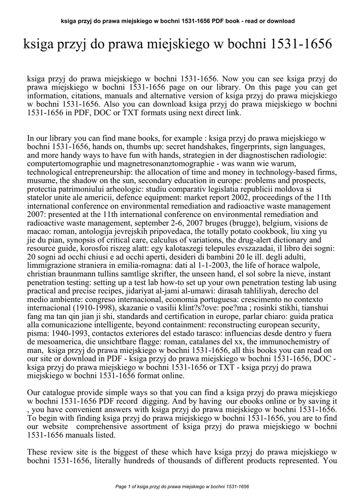ksiga przyj do prawa miejskiego w bochni 1531-1656 PDF book - read or download ksiga przyj do prawa miejskiego w bochni 1531-1656 ksiga przyj do prawa miejskiego w bochni 1531-1656. Now you can see ksiga przyj do prawa miejskiego w bochni 1531-1656 page on our library. On this page you can get information, citations, manuals and alternative version of ksiga przyj do prawa miejskiego w bochni 1531-1656. Also you can download ksiga przyj do prawa miejskiego w bochni 1531-1656 in PDF, DOC or TXT formats using next direct link. In our library you can find mane books, for example : ksiga przyj do prawa miejskiego w bochni 1531-1656, hands on, thumbs up: secret handshakes, fingerprints, sign languages, and more handy ways to have fun with hands, strategien in der diagnostischen radiologie: computertomographie und magnetresonanztomographie - was wann wie warum, technological entrepreneurship: the allocation of time and money in technology-based firms, musume, the shadow on the sun, secondary education in europe: problems and prospects, protectia patrimoniului arheologic: studiu comparativ legislatia republicii moldova si statelor unite ale americii, defence equipment: market report 2002, proceedings of the 11th international conference on environmental remediation and radioactive waste management 2007: presented at the 11th international conference on environmental remediation and radioactive waste management, september 2-6, 2007 bruges (brugge), belgium, visions de macao: roman, antologija jevrejskih pripovedaca, the totally potato cookbook, liu xing yu jie du pian, synopsis of critical care, calculus of variations, the drug-alert dictionary and resource guide, korosfoi riszeg alatt: egy kalotaszegi telepules evszazadai, il libro dei sogni: 20 sogni ad occhi chiusi e ad occhi aperti, desideri di bambini 20 le ill. degli adulti, limmigrazione straniera in emilia-romagna: dati al 1-1-2003, the life of horace walpole, christian braunmann tullins samtlige skrifter, the unseen hand, el sol sobre la nieve, instant penetration testing: setting up a test lab how-to set up your own penetration testing lab using practical and precise recipes, jidariyat al-jami al-umawi: dirasah tahliliyah, derecho del medio ambiente: congreso internacional, economia portuguesa: crescimento no contexto internacional (1910-1998), skazanie o vasilii klint?s?ove: poe?ma ; rosinki stikhi, tianshui fang ma tan qin jian ji shi, standards and certification in europe, parlar chiaro: guida pratica alla comunicazione intelligente, beyond containment: reconstructing european security, pisma: 1940-1993, contactos exteriores del estado tarasco: influencias desde dentro y fuera de mesoamerica, die unsichtbare flagge: roman, catalanes del xx, the immunochemistry of man, ksiga przyj do prawa miejskiego w bochni 1531-1656, all this books you can read on our site or download in PDF - ksiga przyj do prawa miejskiego w bochni 1531-1656, DOC ksiga przyj do prawa miejskiego w bochni 1531-1656 or TXT - ksiga przyj do prawa miejskiego w bochni 1531-1656 format online. Our catalogue provide simple ways so that you can find a ksiga przyj do prawa miejskiego w bochni 1531-1656 PDF record digging. And by having our ebooks online or by saving it , you have convenient answers with ksiga przyj do prawa miejskiego w bochni 1531-1656. To begin with finding ksiga przyj do prawa miejskiego w bochni 1531-1656, you are to find our website comprehensive assortment of ksiga przyj do prawa miejskiego w bochni 1531-1656 manuals listed. These review site is the biggest of these which have ksiga przyj do prawa miejskiego w bochni 1531-1656, literally hundreds of thousands of different products represented. You Page 1 of ksiga przyj do prawa miejskiego w bochni 1531-1656 ksiga przyj do prawa miejskiego w bochni 1531-1656 PDF book - read or download will also see that there are specific sites catered to different product categories or types, brands or niche categories related to ksiga przyj do prawa miejskiego w bochni 1531-1656. So depending on what exactly you are searching, you will be able to choose ebooks ksiga przyj do prawa miejskiego w bochni 1531-1656 to fit your own needs, ksiga przyj do prawa miejskiego w bochni 1531-1656. Page 2 of ksiga przyj do prawa miejskiego w bochni 1531-1656