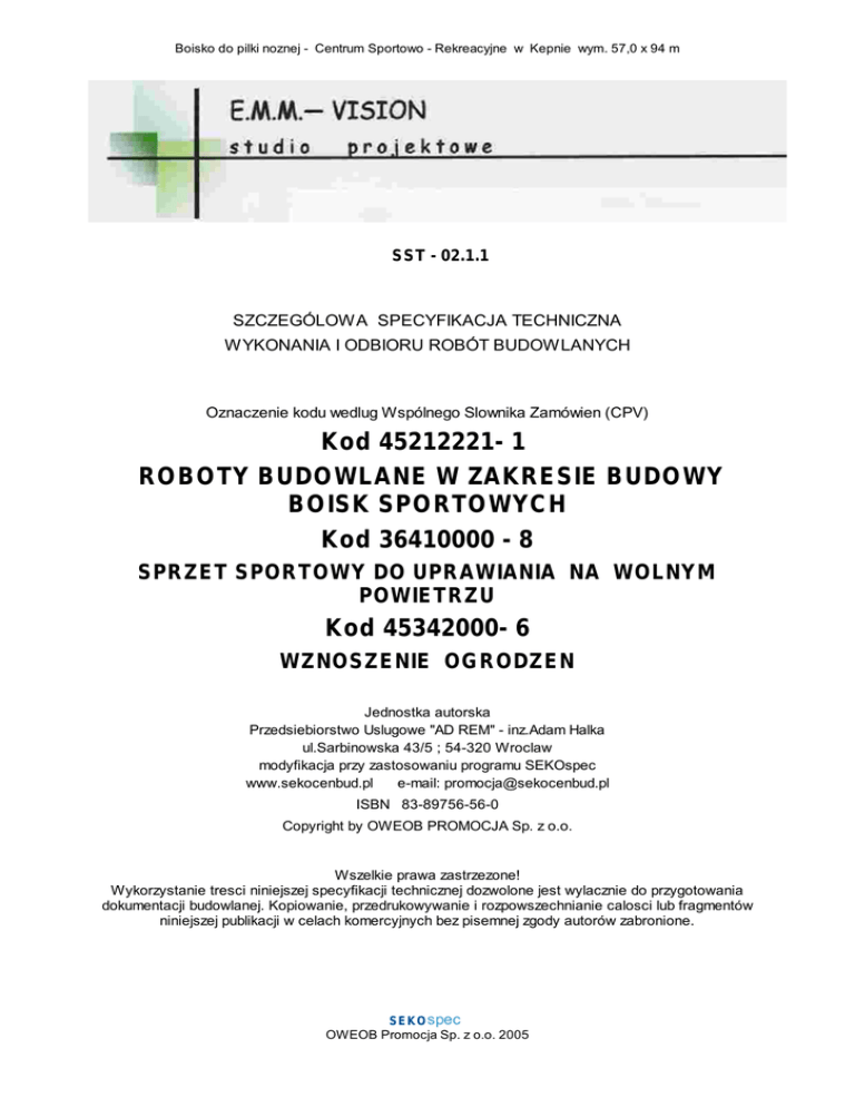 Boisko do pilki noznej - Centrum Sportowo - Rekreacyjne w Kepnie wym. 57,0 x 94 m SST - 02.1.1 SZCZEGÓLOWA SPECYFIKACJA TECHNICZNA WYKONANIA I ODBIORU ROBÓT BUDOWLANYCH Oznaczenie kodu wedlug Wspólnego Slownika Zamówien (CPV) Kod 45212221- 1 ROBOTY BUDOWLANE W ZAKRESIE BUDOWY BOISK SPORTOWYCH Kod 36410000 - 8 SPRZET SPORTOWY DO UPRAWIANIA NA WOLNYM POWIETRZU Kod 45342000- 6 WZNOSZENIE OGRODZEN Jednostka autorska Przedsiebiorstwo Uslugowe "AD REM" - inz.Adam Halka ul.Sarbinowska 43/5 ; 54-320 Wroclaw modyfikacja przy zastosowaniu programu SEKOspec www.sekocenbud.pl e-mail: [email protected] ISBN 83-89756-56-0 Copyright by OWEOB PROMOCJA Sp. z o.o. Wszelkie prawa zastrzezone! Wykorzystanie tresci niniejszej specyfikacji technicznej dozwolone jest wylacznie do przygotowania dokumentacji budowlanej. Kopiowanie, przedrukowywanie i rozpowszechnianie calosci lub fragmentów niniejszej publikacji w celach komercyjnych bez pisemnej zgody autorów zabronione. SEKOspec OWEOB Promocja Sp. z o.o. 2005 Boisko do pilki noznej - Centrum Sportowo - Rekreacyjne w Kepnie wym. 57,0 x 94 m Wroclaw 2008 SPIS TRESCI 1. WSTEP ......................................................................................................... 3 1.1. Przedmiot ST ............................................................................................. 3 1.2. Zakres stosowania ST ............................................................................... 3 1.3. Zakres robót objetych ST ........................................................................... 3 1.4. Okreslenia podstawowe ............................................................................. 3 1.5. Ogólne wymagania dotyczace robót ........................................................... 3 2. MATERIALY .................................................................................................. 4 3. SPRZET ........................................................................................................ 6 4. TRANSPORT ................................................................................................. 6 5. WYKONANIE ROBÓT ................................................................................... 6 6. KONTROLA JAKOSCI ROBÓT ...................................................................... 7 7. OBMIAR ROBÓT ........................................................................................... 7 8. ODBIÓR ROBÓT ........................................................................................... 7 9. PODSTAWA PLATNOSCI ............................................................................. 7 10. PRZEPISY ZWIAZANE ............................................................................... 7 Najwazniejsze oznaczenia i skróty: ST – Specyfikacja Techniczna SST – Szczególowa Specyfikacja Techniczna ITB – Instytut Techniki Budowlanej SEKOspec OWEOB Promocja Sp. z o.o. 2005 Boisko do pilki noznej - Centrum Sportowo - Rekreacyjne w Kepnie wym. 57,0 x 94 m 1. W STEP 1.1. Przedm iot SST Przedmiotem niniejszej standardowej specyfikacji technicznej (SST) sa wymagania dotyczace wykonania i odbioru podbudowy i nawierzchni bioska ze "sztucznej trawy" oraz dostawy i montazu wyposazenia sportowego i ogrodzenia obiektu ,w ramach przedsiewziecia inwestycyjnego pn.: Budowa boisk a do pilk i noznej o wym iarac h 57,0 x 94,0 m Rekreacyjnego w Kepnie ul. W alki Mlodych 7-9 na terenie Centrum Sportowo - 1.2. Zak res s tosowania SST Specyfikacja techniczna (SST) stanowi dokument przetargowy i kontraktowy przy zlecaniu i realizacji robót wymienionych w pkt. 1.1. Odstepstwa od wymagan podanych w niniejszej specyfikacji moga miec miejsce tylko w przypadkach malych prostych robót i konstrukcji drugorzednych o niewielkim znaczeniu, dla których istnieje pewnosc, ze podstawowe wymagania beda spelnione przy zastosowaniu metod wykonania na podstawie doswiadczenia i przy przestrzeganiu zasad sztuki budowlanej. 1.3. Zak res robót objetyc h SST Zakres robót obejmuje budowe nawierzchni boiska wielofunkcyjnego ze sztucznej trawy do gry w pilke reczne , koszykówke i siatkówke . Ustalenia zawarte w niniejszej specyfikacji dotycza zasad prowadzenia robót zwiazanych z wykonywaniem podbudowy ,nawierzchni bioska oraz dostawy i montazu wyposazenia sportowego , ogrodzenia z siatki na slupkach z rur wys.4,0 m z brama i 2 - ma furtkami i specjalnego o wys. 5,0 m - ogrodzenia ( pilkochwytu) za bramkami a wiec: ü warstw podbudowy i nawierzchni ze "sztucznej trawy", ü montazu obrzezy, ü montazu ogrodzenia oraz pilkochwytów ü dostawe i montaz wyposazenia sportowego ü oraz kontrola jakosci robót i materialów 1.4. Ok res lenia pods tawowe Okreslenia podane w niniejszej Specyfikacji sa zgodne z odpowiednimi normami oraz okresleniami podanymi w SST-00.00 Kod CPV 45000000-7 „Wymagania ogólne”. Kons trukc ja nawierzchni. Uklad warstw nawierzchni i podbudowy wraz ze sposobem ich polaczenia , tu: przeznaczony dla bois k sportowyc h Sztuc zna trawa : nawierzchnia sportowa z wlókien polipropylenowych przeznaczona dla uprawiania dyscypliny sportowej - pilka nozna Ogrodzenie bois ka o wys. 4,0m z brama szer.2,50 i 2 -ma furtkami szer.1,10 m, ogrodzenie o wys. 5,0 m ( typ jak dla kortów tenisowych ) pilkochwyt- Sprzet s portowy do m ontazu na boisk u - slupki , bramki , siatki , wieszaki , tuleje do mocowania konstrukcji , konstrukcje mocujace , krzeselka ( fotele) dla kibiców i zawodników Pozostale okreslenia podstawowe sa zgodne z obowiazujacymi, odpowiednimi polskimi normami i z definicjami podanymi w specyfikacji technicznej „Wymagania ogólne" punkt 1.4. SEKOspec OWEOB Promocja Sp. z o.o. 2005 Boisko do pilki noznej - Centrum Sportowo - Rekreacyjne w Kepnie wym. 57,0 x 94 m 1.5. Ogólne wym agania dotyczac e robót Wykonawca robót jest odpowiedzialny za jakosc ich wykonania oraz za zgodnosc z dokumentacja projektowa, ST i poleceniami Inspektora nadzoru. Ogólne wymagania dotyczace robót podano w SST