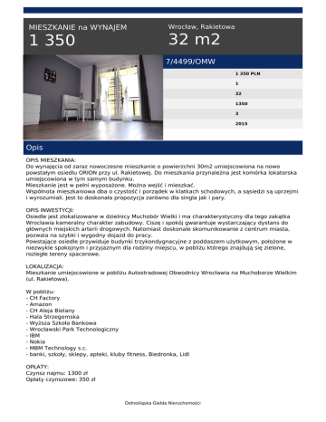 MIESZKANIE na WYNAJEM 1 350 Wrocław, Rakietowa 32 m2 7/4499/OMW 1 350 PLN 1 32 1350 3 2015 Opis OPIS MIESZKANIA: Do wynajęcia od zaraz nowoczesne mieszkanie o powierzchni 30m2 umiejscowiona na nowo powstałym osiedlu ORION przy ul. Rakietowej. Do mieszkania przynależna jest komórka lokatorska umiejscowiona w tym samym budynku. Mieszkanie jest w pełni wyposażone. Można wejść i mieszkać. Wspólnota mieszkaniowa dba o czystość i porządek w klatkach schodowych, a sąsiedzi są uprzejmi i wyrozumiali. Jest to doskonała propozycja zarówno dla singla jak i pary. OPIS INWESTYCJI: Osiedle jest zlokalizowane w dzielnicy Muchobór Wielki i ma charakterystyczny dla tego zakątka Wrocławia kameralny charakter zabudowy. Ciszę i spokój gwarantuje wystarczający dystans do głównych miejskich arterii drogowych. Natomiast doskonale skomunikowanie z centrum miasta, pozwala na szybki i wygodny dojazd do pracy. Powstające osiedle przywiduje budynki trzykondygnacyjne z poddaszem użytkowym, położone w niezwykle spokojnym i przyjaznym dla rodziny miejscu, w pobliżu którego znajdują się zielone, rozległe tereny spacerowe. LOKALIZACJA: Mieszkanie umiejscowione w pobliżu Autostradowej Obwodnicy Wrocławia na Muchoborze Wielkim (ul. Rakietowa). W pobliżu: - CH Factory - Amazon - CH Aleja Bielany - Hala Strzegomska - Wyższa Szkoła Bankowa - Wrocławski Park Technologiczny - IBM - Nokia - MBM Technology s.c. - banki, szkoły, sklepy, apteki, kluby fitness, Biedronka, Lidl OPŁATY: Czynsz najmu: 1300 zł Opłaty czynszowe: 350 zł Dolnośląska Giełda Nieruchomości Kaucja: 1300 zł Dolnośląska Giełda Nieruchomości tel. 713073939 email: [email protected] Dolnośląska Giełda Nieruchomości Powered by TCPDF (www.tcpdf.org)