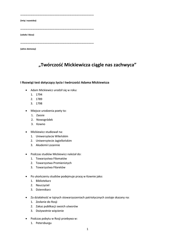 ……………………………………………………………………………… (imię i nazwisko) ……………………………………………………………………………… (szkoła i klasa) ……………………………………………………………………………… (adres domowy) „Twórczość Mickiewicza ciągle nas zachwyca” I Rozwiąż test dotyczący życia i twórczości Adama Mickiewicza Adam Mickiewicz urodził się w roku: 1. 1794 2. 1789 3. 1798 Miejsce urodzenia poety to: 1. Zaosie 2. Nowogródek 3. Kowno Mickiewicz studiował na: 1. Uniwersytecie Wileńskim 2. Uniwersytecie Jagiellońskim 3. Akademii Lozannie Podczas studiów Mickiewicz należał do: 1. Towarzystwa Filomatów 2. Towarzystwa Promienistych 3. Towarzystwa Filaretów Po ukończeniu studiów podejmuje pracę w Kownie jako: 1. Bibliotekarz 2. Nauczyciel 3. Dziennikarz Za działalność w tajnych stowarzyszeniach patriotycznych zostaje skazany na: 1. Zesłanie do Rosji 2. Zakaz publikacji swoich utworów 3. Dożywotnie więzienie Podczas pobytu w Rosji przebywa w: 1. Petersburgu 1 2. Odessie 3. Moskwie Dokąd odbył wielką podróż na południe, która zaowocowała m.in. słynnymi sonetami? 1. Nad Morze Czarne 2. Nad Morze Kaspijskie 3. Nad Morze Śródziemne W którym z niżej wymienionych miast był Mickiewicz po opuszczeniu Rosji? 1. Berlin 2. Praga 3. Warszawa Z kim z wielkich pisarzy tamtego okresu zetknął się podczas podróży po świeci? 1. Aleksander Puszkin 2. Johann Wolfgang Goethe 3. George Gordon Noel Byron, lord Byron „III cz. Dziadów” powstała po upadku jednego z największych i najtragiczniejszych naszych powstań narodowych. Było to: 1. Powstanie kościuszkowskie 2. Powstanie listopadowe 3. Powstanie styczniowe Przebywając na emigracji w Paryżu Mickiewicz napisał poemat, jedno z najwybitniejszych swoich dzieł, zwany dzisiaj epopeją narodową. Był to: 1. Konrad Wallenrod 2. Księgi Narodu i Pielgrzymstwa Polskiego 3. Pan Tadeusz Która z wymienionych kobiet została żoną Mickiewicza? 1. Maryla Wereszczakówna 2. Karolina Sobańska 3. Celina Szymanowska Ile dzieci miał Adam Mickiewicz? 1. 2 2. 5 3. 6 Mickiewicz wykładał na Uniwersytetach 1. Na Akademii w Lozannie 2. W Paryżu w College de France 3. Na Sorbonie Osoba – mesjanista, przywódca religijny, który w 40-tych latach wywarł ogromny wpływ na poetę to: 1. Juliusz słowacki 2. Andrzej Towiański 3. Napoleon Bonaparte 2 Jaką nie pisarską działalność podjął Mickiewicz we Włoszech podczas Wiosny Ludów, licząc na wojnę tego kraju z Austrią, a w dalszej konsekwencji odzyskanie niepodległości przez Polskę? 1. Tworzenie legionu polskiego 2. Zawiązanie organizacji spiskowej polskich emigrantów 3. Był emisariuszem Jaki tytuł nosiła międzynarodowa gazeta wydawana w przez kilka miesięcy w Paryżu (1849/1850), której redaktorem był Adam Mickiewicz? 1. Trybuna Ludu 2. Trybuna Ludów 3. Głos Narodów W jakim zawodzie pracował z nominacji francuskiego ministra oświecenia w latach w ostatnich swego życia? 1. Muzealnika 2. Nauczyciela 3. Bibliotekarza Gdzie zmarł Adam Mickiewicz? 1. W Paryżu 2. W Konstantynopolu 3. W Dreźnie Gdzie znajdują się prochy poety? 1. Na warszawskich Powązkach 2. W krypcie na Wawelu 3. Na paryskim cmentarzu Montmorency Muzeum gromadzące pamiątki po Adamie Mickiewiczu znajduje się w: 1. Paryżu 2. Warszawie 3. Stambule II. Obok tytułu utworu Adama Mickiewicza napisz jaki to gatunek literacki (są to: bajka, ballada, dramat, epopeja, hymn, liryki, oda, pieśń, powieść poetycka, sonet). 1. Oda do młodości ……………………………………………………………. 2. Osioł i pies ……………………………………………………………. 3. Pan Tadeusz ………………………………………………………...... 4. Lilije ……………………………………………………………. 5. Dziady ……………………………………………………………. 3 III. 6. Żegluga …………………………………………………………... 7. Polały się łzy ………………………………………………………... 8. Grażyna …………………………………………………………... 9. Pieśni filaretów …………………………………………………………… 10. Na dzień Zwiastowania NMP ……………………………………………………………. Z jakiego utworu to cytat? 1. Polak, chociaż stąd między narodami słynny, Że bardziej niźli życie kocha kraj rodzinny... ………………………………………………………………… 2. Nie tylko między krzyżowymi roty Wsławił orężem młodociane lata, Zdobią go wielkie chrześcijańskie cnoty, Ubóstwo, skromność i pogarda świata. ………………………………………………………………. 3. Tam żył Mieszek, kum Leszka, i kum Mieszka Leszek, Z tych, co to: gdzie ty, tam ja , - co moje, to twoje. Mówili o nich, że gdy znaleźli orzeszek, Ziarnko dzielili na dwoje… …………………………………………………………………. 4. Powiedz raczej: Na wierzchu. Nasz naród jak lawa, Z wierzchu zimna i twarda, sucha i plugawa, Lecz wewnętrznego ognia sto lat nie wyziębi, Plwajmy na tą skorupę i zstąpmy do głębi. …………………………………………………………………… 5. Zdarza się wprawdzie, że sąsiad sąsiada, Z którym nieprzyjaźń toczył od lat wielu, Uściska wreszcie, gniewne serce składa, Jeden drugiego łowiąc przyjacielu. ………………………………………………………………… 6. Synu Zbawicielu któryś umęczony i ukrzyżowany, Zmartwychwstał i królujesz w chwale. Zbudź z martwych Ojczyznę naszą. 4 Matko Boska, którą Ojcowie nasi, Nazwali królową Polski i Litwy Zbaw Polskę i Litwę …………………………………………………………