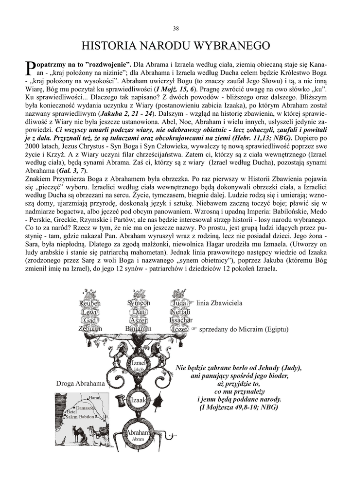 38 HISTORIA NARODU WYBRANEGO P opatrzmy na to ”rozdwojenie”. Dla Abrama i Izraela według ciała, ziemią obiecaną staje się Kanaan - „kraj położony na nizinie”; dla Abrahama i Izraela według Ducha celem będzie Królestwo Boga - „kraj położony na wysokości”. Abraham uwierzył Bogu (to znaczy zaufał Jego Słowu) i tą, a nie inną Wiarę, Bóg mu poczytał ku sprawiedliwości (I Mojż. 15, 6). Pragnę zwrócić uwagę na owo słówko „ku”. Ku sprawiedliwości... Dlaczego tak napisano? Z dwóch powodów - bliższego oraz dalszego. Bliższym była konieczność wydania uczynku z Wiary (postanowieniu zabicia Izaaka), po którym Abraham został nazwany sprawiedliwym (Jakuba 2, 21 - 24). Dalszym - wzgląd na historię zbawienia, w której sprawiedliwość z Wiary nie była jeszcze ustanowiona. Abel, Noe, Abraham i wielu innych, usłyszeli jedynie zapowiedzi. Ci wszyscy umarli podczas wiary, nie odebrawszy obietnic - lecz zobaczyli, zaufali i powitali je z dala. Przyznali też, że są tułaczami oraz obcokrajowcami na ziemi (Hebr. 11,13; NBG). Dopiero po 2000 latach, Jezus Chrystus - Syn Boga i Syn Człowieka, wywalczy tę nową sprawiedliwość poprzez swe życie i Krzyż. A z Wiary uczyni filar chrześcijaństwa. Zatem ci, którzy są z ciała wewnętrznego (Izrael według ciała), będą synami Abrama. Zaś ci, którzy są z wiary (Izrael według Ducha), pozostają synami Abrahama (Gal. 3, 7). Znakiem Przymierza Boga z Abrahamem była obrzezka. Po raz pierwszy w Historii Zbawienia pojawia się „pieczęć” wyboru. Izraelici według ciała wewnętrznego będą dokonywali obrzezki ciała, a Izraelici według Ducha są obrzezani na sercu. Życie, tymczasem, biegnie dalej. Ludzie rodzą się i umierają; wznoszą domy, ujarzmiają przyrodę, doskonalą język i sztukę. Niebawem zaczną toczyć boje; pławić się w nadmiarze bogactwa, albo jęczeć pod obcym panowaniem. Wzrosną i upadną Imperia: Babilońskie, Medo - Perskie, Greckie, Rzymskie i Partów; ale nas będzie interesował strzęp historii - losy narodu wybranego. Co to za naród? Rzecz w tym, że nie ma on jeszcze nazwy. Po prostu, jest grupą ludzi idących przez pustynię - tam, gdzie nakazał Pan. Abraham wyruszył wraz z rodziną, lecz nie posiadał dzieci. Jego żona Sara, była niepłodną. Dlatego za zgodą małżonki, niewolnica Hagar urodziła mu Izmaela. (Utworzy on ludy arabskie i stanie się patriarchą mahometan). Jednak linia prawowitego następcy wiedzie od Izaaka (zrodzonego przez Sarę z woli Boga i nazwanego „synem obietnicy”), poprzez Jakuba (któremu Bóg zmienił imię na Izrael), do jego 12 synów - patriarchów i dziedziców 12 pokoleń Izraela.