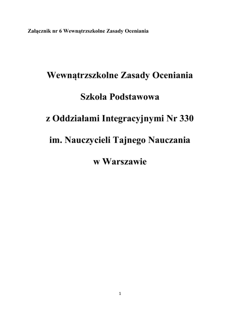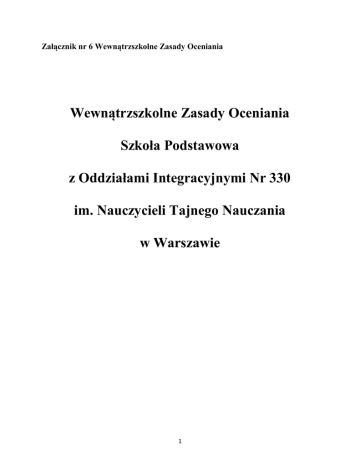 Załącznik nr 6 Wewnątrzszkolne Zasady Oceniania Wewnątrzszkolne Zasady Oceniania Szkoła Podstawowa z Oddziałami Integracyjnymi Nr 330 im. Nauczycieli Tajnego Nauczania w Warszawie 1 Spis treści §1 Wstęp i zasady ogólne ..................................................................................... 4 §3 Ocenianie w klasach I-III ................................................................................. 6 § 4 Ocenianie w klasach specjalnych ................................................................... 9 § 5 Ocenianie w klasach IV-VI .......................................................................... 12 § 6 Formy sprawdzania wiedzy .......................................................................... 14 § 7 Specjalne potrzeby edukacyjne .................................................................... 16 § 8 Sprawdzian weryfikujący ............................................................................. 16 § 9 Ocena zachowania ........................................................................................ 17 § 10 Tryb odwoławczy od oceny zachowania .................................................. 27 § 11 Dokumentowanie i informowanie o ocenach ............................................. 27 § 12 Klasyfikacja śródroczna i roczna ............................................................... 28 § 13 Promocja do klasy programowo wyższej ................................................... 29 § 14 Egzamin klasyfikacyjny ............................................................................. 30 § 15 Egzamin poprawkowy ................................................................................ 31 § 16 Tryb odwoławczy od oceny śródrocznej i rocznej..................................... 32 § 17 Nagrody i sankcje ....................................................................................... 34 § 18 Przeniesienie ucznia ................................................................................... 35 § 19 Tryb odwoławczy od zastosowanych konsekwencji ................................. 36 § 20 Postanowienia końcowe ............................................................................. 36 ZAŁĄCZNIK NR 1 Przedmiotowe Zasady Oceniania .......................................... ZAŁĄCZNIK NR 1 a Przedmiotowe Zasady Oceniania Języka Polskiego w klasie IV, V, VI w SP 330 ......................................................................... ZAŁĄCZNIK NR 1 b Przedmiotowe Zasady Ocenienia z Matematyki w klasie IV, V, VI w SP 330 ......................................................................... ZAŁĄCZNIK NR 1 c Przedmiotowe Zasady Oceniania – Język angielski ........... ZAŁĄCZNIK NR 1 d Przedmiotowe Zasady Oceniania z Przyrody w klasie IV, V, VI w SP 330 w roku szkolnym 2013/2014 .......................... ZAŁĄCZNIK NR 1 e Przedmiotowe Zasady Oceniania z Historii w klasie IV, V, VI w SP 330 ......................................................................... ZAŁĄCZNIK NR 1 f Przedmiotowe Zasady Oceniania z Informatyki (klasa VI) i Zajęć Komputerowych (klasa IV, V) – 20013 / 2014................................. ZAŁĄCZNIK NR 1 g Przedmiotowe Zasady Oceniania z Muzyki rok szkolny 2013/2014 klasa IV i V ............................................................. ZAŁĄCZNIK NR 1 h Przedmiotowe Zasady Oceniania Plastyki i Zajęć technicznych .................................................................................................. ZAŁĄCZNIK NR 1 i Przedmiotowe Zasady Oceniania z Wychowania Fizycznego rok szkolny 2013/2014 .................................................................................. 2 ZAŁĄCZNIK NR 1 j Wymagania edukacyjne z religii w Szkole Podstawowej z Oddziałami Integracyjnymi nr 330 w Warszawie ...................................... ZAŁĄCZNIK NR 2 Karty Ocen Zachowania ........................................................ ZAŁĄCZNIK NR 2 a Karta rejestracji bieżących ocen z zachowania klas I-III ... ZAŁĄCZNIK NR 2 b Karta oceny zachowania ucznia klas IV-VI ....................... ZAŁĄCZNIK NR 3 Karta samooceny zachowania klas IV-VI ............................. ZAŁĄCZNIK NR 4 Karta oceny zespołu klasowego klas IV-VI .......................... Załącznik nr 7 Regulamin Szkoły ........................................................................... Załącznik nr 8 Regulamin Współpracy Rodziców i Szkoły ................................... 3 §1 Wstęp i zasady ogólne 1. Szkolne zasady oceniania określają warunki i sposób oceniania, klasyfikowania i promowania uczniów oraz przeprowadzania sprawdzianów wiadomości i umiejętności uczniów w Szkole Podstawowej z Oddziałami Integracyjnymi Nr 330 im. Nauczycieli Tajnego Nauczania w Warszawie. 2. Ocenianiu podlegają: a) osiągnięcia edukacyjne ucznia, b) zachowanie ucznia. 3. Ocenianie wewnątrzszkolne osiągnięć edukacyjnych ucznia polega na rozpoznawaniu przez nauczycieli poziomu i postępów w opanowaniu przez ucznia wiadomości i umiejętności w stosunku do wymagań edukacyjnych wynikających z podstawy programowej, określonej w odrębnych przepisach i realizowanych w szkole programów nauczania, uwzględniających tę podstawę. 4. Ocenianie zachowania ucznia polega na rozpoznawaniu przez wychowawcę klasy, nauczycieli, specjalistów, pracowników administracji i obsługi oraz uczniów danej klasy stopnia respektowania przez ucznia zasad współżycia społecznego i norm etycznych. 5. Ocenianie wewnątrzszkolne ma na celu: a) informowanie ucznia o poziomie jego osiągnięć edukacyjnych i jego zachowaniu oraz o postępach w tym zakresie, b) udzielanie uczniowi pomocy w samodzielnym planowaniu swojego rozwoju, c) motywowanie ucznia do dalszych postępów w nauce i zachowaniu, d) dostarczenie rodzicom (prawnym opiekunom) i nauczycielom informacji o postępach, trudnościach w nauce, zachowaniu oraz specjalnych uzdolnieniach ucznia, e) u