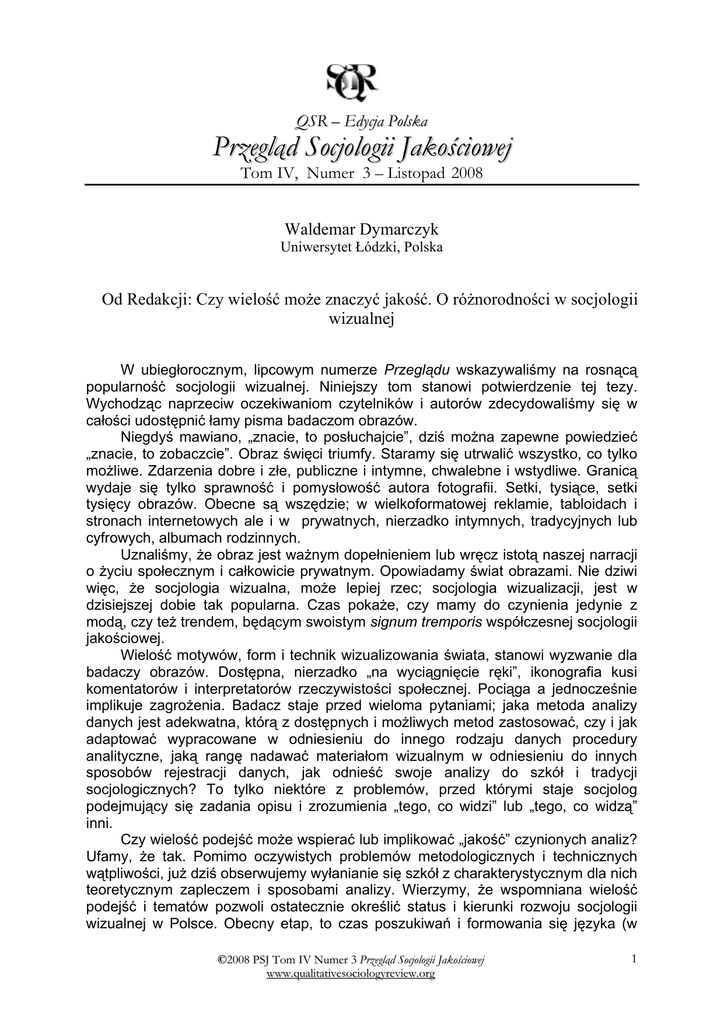 QSR – Edycja Polska Przegląd Socjologii Jakościowej Tom IV, Numer 3 – Listopad 2008 Waldemar Dymarczyk Uniwersytet Łódzki, Polska Od Redakcji: Czy wielość może znaczyć jakość. O różnorodności w socjologii wizualnej W ubiegłorocznym, lipcowym numerze Przeglądu wskazywaliśmy na rosnącą popularność socjologii wizualnej. Niniejszy tom stanowi potwierdzenie tej tezy. Wychodząc naprzeciw oczekiwaniom czytelników i autorów zdecydowaliśmy się w całości udostępnić łamy pisma badaczom obrazów. Niegdyś mawiano, „znacie, to posłuchajcie”, dziś można zapewne powiedzieć „znacie, to zobaczcie”. Obraz święci triumfy. Staramy się utrwalić wszystko, co tylko możliwe. Zdarzenia dobre i złe, publiczne i intymne, chwalebne i wstydliwe. Granicą wydaje się tylko sprawność i pomysłowość autora fotografii. Setki, tysiące, setki tysięcy obrazów. Obecne są wszędzie; w wielkoformatowej reklamie, tabloidach i stronach internetowych ale i w prywatnych, nierzadko intymnych, tradycyjnych lub cyfrowych, albumach rodzinnych. Uznaliśmy, że obraz jest ważnym dopełnieniem lub wręcz istotą naszej narracji o życiu społecznym i całkowicie prywatnym. Opowiadamy świat obrazami. Nie dziwi więc, że socjologia wizualna, może lepiej rzec; socjologia wizualizacji, jest w dzisiejszej dobie tak popularna. Czas pokaże, czy mamy do czynienia jedynie z modą, czy też trendem, będącym swoistym signum tremporis współczesnej socjologii jakościowej. Wielość motywów, form i technik wizualizowania świata, stanowi wyzwanie dla badaczy obrazów. Dostępna, nierzadko „na wyciągnięcie ręki”, ikonografia kusi komentatorów i interpretatorów rzeczywistości społecznej. Pociąga a jednocześnie implikuje zagrożenia. Badacz staje przed wieloma pytaniami; jaka metoda analizy danych jest adekwatna, którą z dostępnych i możliwych metod zastosować, czy i jak adaptować wypracowane w odniesieniu do innego rodzaju danych procedury analityczne, jaką rangę nadawać materiałom wizualnym w odniesieniu do innych sposobów rejestracji danych, jak odnieść swoje analizy do szkół i tradycji socjologicznych? To tylko niektóre z problemów, przed którymi staje socjolog podejmujący się zadania opisu i zrozumienia „tego, co widzi” lub „tego, co widzą” inni. Czy wielość podejść może wspierać lub implikować „jakość” czynionych analiz? Ufamy, że tak. Pomimo oczywistych problemów metodologicznych i technicznych wątpliwości, już dziś obserwujemy wyłanianie się szkół z charakterystycznym dla nich teoretycznym zapleczem i sposobami analizy. Wierzymy, że wspomniana wielość podejść i tematów pozwoli ostatecznie określić status i kierunki rozwoju socjologii wizualnej w Polsce. Obecny etap, to czas poszukiwań i formowania się języka (w ©2008 PSJ Tom IV Numer 3 Przegląd Socjologii Jakościowej www.qualitativesociologyreview.org 1 zasadzie języków) dyscypliny. Jedni czerpią garściami z dokonań „wielkich poprzedników”, inni poszukują własnego, adekwatnego słownika i sposobów analizy wizualnych przedstawień. Tak więc, w obecnym numerze Przeglądu stawiamy na wielość tematów i podejść analitycznych nie rezygnując, jak sądzimy, z jakości zaprezentowanych tekstów. Dobrym wstępem do lektury tekstów rodzimych autorów jest artykuł znanego i cenionego socjologa Bernta Schnettlera. Zatrudniony w berlińskim Technische Universität Autor może poszczycić się kilkudziesięcioma publikacjami z dziedziny socjologii wizualnej, jest bliskim współpracownikiem prof. Huberta Knoblaucha. Artykuł do obecnego numeru Przeglądu zawdzięczamy życzliwości Sozialer Sinn, gdzie został pierwotnie opublikowany oraz wnikliwemu tłumaczeniu Agnieszki Reuter. W prezentowanym tekście Schnettler zastanawia się nad rolą i wpływem wizualizacji na współczesne formy wytwarzania wiedzy. Kreśli zadania wizualnej socjologii wiedzy, zaznacza obszary działania i wskazuje problemy, przed którymi stają socjolodzy- epistemologowie. Opublikowany w obecnym Przeglądzie artykuł Bernta Schnettlera, to efekt realizowanego przez Zespół PSJ projektu tłumaczeniowego, mającego na celu przybliżenie polskim czytelnikom, dorobku światowej socjologii jakościowej. Przedsięwzięcie to zainicjował spolszczony (tł. Dominika Byczkowska) tekst Roberta Prusa „Picie jako działanie. Analiza interakcjonistyczna” (Przegląd Socjologii Jakościowej, Tom III Numer 2), niebawem zaś ukaże się tłumaczenie artykułu Barneya Glasera i Judith Holton „Remodeling Grounded Theory” (Forum Qualitative Sozialforschung/ Forum: Qualitative Social Research [On-line Journal] 5(Art. 4 – May). Zapraszamy Szanownych Czytelników do wzięcia udziału w powyższym projekcie. Wierzymy, że dzięki Państwa pomysłom i inicjatywie biblioteka tłumaczeń będzie uzupełniana o kolejne wartościowe pozycje z dziedziny socjologii jakościowej. Tekst, autorstwa Magdaleny Piejko „Skarby pamięci. Socjologiczna analiza fotografii rodzinnej”, jest przykładem twórczej adaptacji teorii Maurcea Halbwachsa i Ervinga Goffmana, służącej zrozumieniu fenomenu tworzenia i re-konstrukcji intymnych prezentacji zbiorowości, jakimi są albumy rodzinne. Badaczka pokazuje, że zazwyczaj, nie są to raz na zawsze zamknięte zbiory fotografii, lecz podlegające permanentnym zmianom prezentacje, mające na celu uprawomocnienie aktualnie obowiązującej wizji rodzinnej historii. Idealizacje, na potrzeby której dokonywana jest re-konstrukcja zbiorów same w sobie stają się punktem odniesienia dla członków rodziny, by przy ich pomocy mogli tworzyć i umacniać grupową tożsamość. Kolejny artykuł, poznańskiego socjologa Maciej Frąckowiaka „Zjawisko ‘fotografii fotografii’, czyli interpretacja zdjęć, które same siebie komentują” inspirowany był twórczością Thomasa Strutha. Autor tego eseistycznego w swej formie tekstu, przenosi czytelnika w