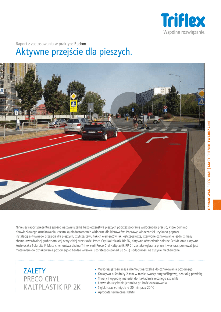 Raport z zastosowania w praktyce Radom OZNAKOWANIE POZIOME | MASY CHEMOUTWARDZALNE Aktywne przejście dla pieszych. Niniejszy raport prezentuje sposób na zwiększenie bezpieczeństwa pieszych poprzez poprawę widoczności przejść, które pomimo obowiązkowego oznakowania, często są niedostatecznie widoczne dla kierowców. Poprawę widoczności uzyskano poprzez instalację aktywnego przejścia dla pieszych, czyli zestawu takich elementów jak: ostrzegawcze, czerwone oznakowanie jezdni z masy chemoutwardzalnej gruboziarnistej o wysokiej szorstkości Preco Cryl Kaltplastik RP 2K, aktywne oświetlenie solarne SeeMe oraz aktywne kocie oczka SolarLite F. Masa chemoutwardzalna Triflex serii Preco Cryl Kaltplastik RP 2K została wybrana przez Inwestora, ponieważ jest materiałem do oznakowania poziomego o bardzo wysokiej szorstkości (ponad 80 SRT) i odporności na zużycie mechaniczne. ZALETY PRECO CRYL KALTPLASTIK RP 2K • • • • • • W ysokiej jakości masa chemoutwardzalna do oznakowania poziomego Kruszywo o średnicy 2 mm w masie tworzy antypoślizgową, szorstką powłokę Trwały i wygodny materiał do nakładania ręcznego szpachlą Łatwa do uzyskania jednolita grubość oznakowania Szybki czas schnięcia < 20 min przy 20 °C Aprobata techniczna IBDiM Wymagania względem oznakowania: Trwałość i odporność na zużycie Bardzo dobra widoczność w różnych warunkach pogodowych Szorstka, antypoślizgowa powłoka Ostrzegawczy odcień czerwony komunikacyjny (RAL 3020) Szybkie i jak najmniej uciążliwe dla ruchu pojazdów wykonanie prac • Estetyczny wygląd • • • • • 1 Poszczególne etapy wykonania: Przed nałożeniem masy, podłoże musi zostać oczyszczone i oklejone taśmą. Na zdjęciu nakładanie szpachlą masy gruboziarnistej Preco Cryl Kaltplastik RP 2K. Zużycie ok. 4,00 kg/m². 2 Instalacja aktywnych PEO SolarLite z diodami LED przy użyciu masy chemoutwardzalnej Triflex Cryl R 238, zużycie ok. 1 kg/1 kocie oczko. 3 Odnowa przejścia dla pieszych – masa gruboziarnista dzięki większej gęstości, znakomicie sprawdza się przy wykonywaniu oznakowania poziomego szpachlą. Oznakowanie na przejściu jest widoczne i trwałe. 4 Aktywne przejście jest znakomicie widoczne dla kierowców, a przez to bardziej bezpieczne dla pieszych. 1 2 3 4 Zadanie Inwestor Zakres System oznakowania Termin prac Wykonawca International Triflex GmbH & Co. KG Karlstrasse 59 32423 Minden | Niemcy Fon +49 571 38780-0 [email protected] www.triflex.com Instalacja aktywnego przejścia dla pieszych w Radomiu Fundacja PZU 1300 m² (cały projekt) Masa chemoutwardzalna gruboziarnista Preco Cryl Kaltplastik RP 2K 2015 Lunaro Polska Triflex Polska ul. Rzymowskiego 53 02-697 Warszawa Fon +48 22 5480156 [email protected] www.triflex.pl 019 Przejścia dla pieszych Radom PL A4 10/2015 Opis zadania