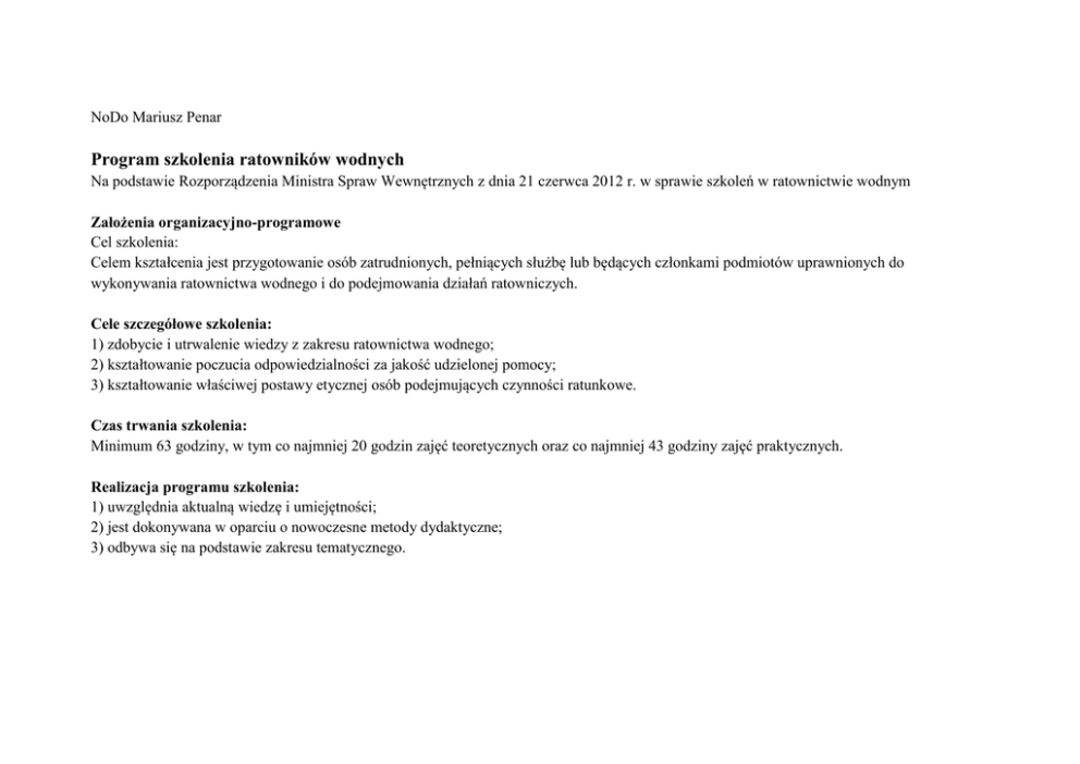 NoDo Mariusz Penar Program szkolenia ratowników wodnych Na podstawie Rozporządzenia Ministra Spraw Wewnętrznych z dnia 21 czerwca 2012 r. w sprawie szkoleń w ratownictwie wodnym Założenia organizacyjno-programowe Cel szkolenia: Celem kształcenia jest przygotowanie osób zatrudnionych, pełniących służbę lub będących członkami podmiotów uprawnionych do wykonywania ratownictwa wodnego i do podejmowania działań ratowniczych. Cele szczegółowe szkolenia: 1) zdobycie i utrwalenie wiedzy z zakresu ratownictwa wodnego; 2) kształtowanie poczucia odpowiedzialności za jakość udzielonej pomocy; 3) kształtowanie właściwej postawy etycznej osób podejmujących czynności ratunkowe. Czas trwania szkolenia: Minimum 63 godziny, w tym co najmniej 20 godzin zajęć teoretycznych oraz co najmniej 43 godziny zajęć praktycznych. Realizacja programu szkolenia: 1) uwzględnia aktualną wiedzę i umiejętności; 2) jest dokonywana w oparciu o nowoczesne metody dydaktyczne; 3) odbywa się na podstawie zakresu tematycznego. Zakres tematyczny szkolenia Lp. Zagadnienie Treść Cel szkolenia Liczba godzin szkolenia. Metoda realizacji Wykłady 1 2 Organizacja ratownictwa wodnego – podstawy prawne Organizacja pracy ratowników Prawne podstawy funkcjonowania ratownictwa wodnego w Polsce Ratownictwo wodne w pozostałych systemach ratowniczych w Polsce Odpowiedzialność prawna ratownika Obowiązki i uprawnienia ratowników wodnych. Dokumentacja działań ratowniczych Specyfika ratownictwa wodnego w zależności od obszarów wodnych (morze, jeziora, rzeki, pływalnie, aquaparki, inne) Szczególna specyfika ratownictwa wodnego (w czasie powodzi, na terenie bagiennym, lodzie, wodzie szybko płynącej, w kontakcie z budowlami i obiektami hydrotechnicznymi) Zaplanowanie działań ratowniczych, w tym sił i środków na danym akwenie. W wyniku realizacji uczestnik szkolenia powinien posiadać wiadomości dotyczące: – podstaw prawnych funkcjonowania ratownictwa wodnego w Rzeczypospolitej Polskiej, – organizacji ratownictwa wodnego w pozostałych systemach ratowniczych funkcjonujących na terenie Rzeczypospolitej Polskiej, – prawnych aspektów pracy ratownika wodnego (kodeks karny, kodeks wykroczeń, kodeks cywilny, kodeks pracy). W wyniku realizacji uczestnik szkolenia powinien posiadać wiadomości dotyczące: – obowiązków i uprawnień ratowników wodnych, – specyfiki ratownictwa wodnego na wyznaczonych obszarach wodnych, – specyfiki działania ratownika wodnego na poszczególnych obszarach wodnych (lód, cieki, powódź, miejsca bagniste), – hydrologii i meteorologii, – dokumentacji działań ratowniczych oraz powinien posiadać umiejętność praktycznego stosowania wiedzy w działaniach ratowniczych. Ćwiczenia 1 1 2 2 2 2 1 1 Lp . Zagadnienie Treść Cel szkolenia Liczba godzin szkolenia. Metoda realizacji Wykłady 3 4 Sprzęt wykorzystyw any w ratownictwie wodnym Pływanie i techniki ratownictwa wodnego Indywidualny i zespołowy sprzęt ratowniczy Ratowniczy sprzęt pływający Prace bosmańskie Prowadzenie akcji ratunkowych Style i techniki pływackie stosowane w ratownictwie wodnym Skoki ratownicze i inne sposoby bezpiecznego wejścia do wody Pływanie pod wodą i nurkowanie Opanowanie osoby tonącej pasywnej Opanowanie osoby aktywnej Holowanie poszkodowanego Ewakuacja poszkodowanego z wody i na lądzie Samoratownictwo W wyniku realizacji uczestnik szkolenia powinien posiadać wiedzę dotyczącą: – sprzętu ratowniczego i pływającego wykorzystywanego w ratownictwie wodnym i jego zastosowania, – podstawowych prac bosmańskich, – prowadzenia akcji ratunkowych z wykorzystaniem sprzętu do ratownictwa wodnego oraz powinien posiadać umiejętność posługiwania się tym sprzętem w działaniach ratowniczych. W wyniku realizacji uczestnik szkolenia powinien posiadać umiejętności: – pływania stosowanego w ratownictwie wodnym, – samoratownictwa, – wykonania skoków ratunkowych i innych sposobów bezpiecznego wejścia do wody, – pływania pod wodą i nurkowania, – holowania osoby zagrożonej, co najmniej trzema sposobami, – ewakuacji z wody i na lądzie, – opanowania osoby tonącej pasywnej i ułożenia jej w pozycji do holowania, – postępowania z osobą tonącą aktywną. RAZEM Ćwiczenia 4 2 2 1 1 10 7 1 2 1 1 2 1 3 6 2 3 0,5 1 20 43 0,5 63 Wskazówki metodyczne Uczestnik szkolenia powinien umieć poprawnie wykonać każdą czynność, która była przedmiotem szkolenia.