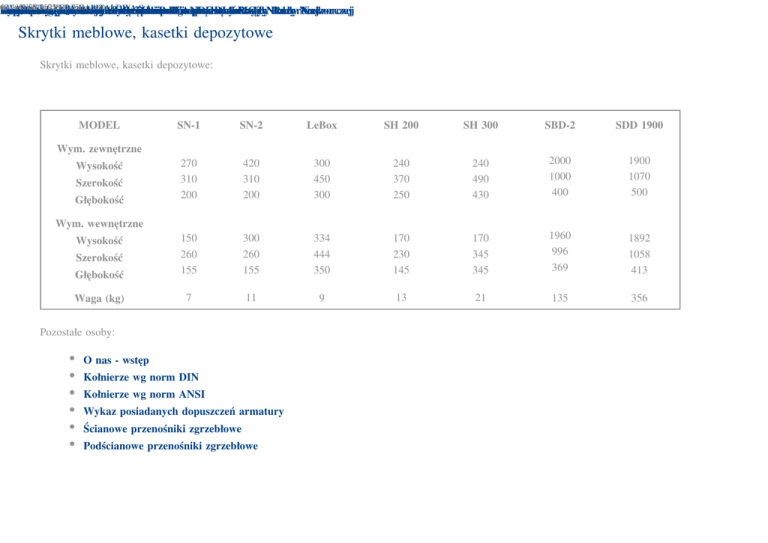 40-611 tel. fax +48Katowice, 32 3593800-05 3593806 ul. Fabryczna 15 GWARANT GRUPA KAPITAŁOWA S.A. Proponowane Reduktory Typoszereg Dane Parametry Przykładowy Keywords Description Prof. dr techniczne hab. techniczne klasyczne planetarne produkowanych banner Nikodem Andrzej Janusz zestawy układu trójfazowych A.silników Strumiński Szlązak Strzępka mechanicznego zawieszeń zespołów marki - Przewodniczący -- Wiceprzewodniczący Wiceprzewodniczący ANDORIA-MOT prądotwórczych Rady Nadzorczej Rady Rady Nadzorczej Nadzorczej Skrytki meblowe, kasetki depozytowe Skrytki meblowe, kasetki depozytowe: MODEL SN-1 SN-2 LeBox SH 200 SH 300 SBD-2 SDD 1900 270 310 200 420 310 200 300 450 300 240 370 250 240 490 430 2000 1000 400 1900 1070 500 Głębokość 150 260 155 300 260 155 334 444 350 170 230 145 170 345 345 1960 996 369 1892 1058 413 Waga (kg) 7 11 9 13 21 135 356 Wym. zewnętrzne Wysokość Szerokość Głębokość Wym. wewnętrzne Wysokość Szerokość Pozostałe osoby: O nas - wstęp Kołnierze wg norm DIN Kołnierze wg norm ANSI Wykaz posiadanych dopuszczeń armatury Ścianowe przenośniki zgrzebłowe Podścianowe przenośniki zgrzebłowe