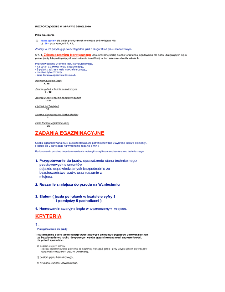 ROZPORZĄDZENIE W SPRAWIE SZKOLENIA Plan nauczania 2) liczba godzin dla zajęć praktycznych nie może być mniejsza niż: b) 20 - przy kategorii A, A1, Znaczy to, że przysługuje wam 20 godzin jazd z czego 10 na placu manewrowym. § 7. 1 . Zakres egzaminu teoretycznego, dopuszczalną liczbę błędów oraz czas jego trwania dla osób ubiegających się o prawo jazdy lub podlegających sprawdzeniu kwalifikacji w tym zakresie określa tabela 1. Przeprowadzany w formie testu komputerowego, - 12 pytań z zakresu testu zasadniczego, - 6 pytań z zakresu testu specjalistycznego, - możliwe tylko 2 błedy, - czas trwania egzaminu 25 minut. Kategoria prawa jazdy A, A1 Zakres pytań w teście zasadniczym 1 - 12 Zakres pytań w teście specjalistycznym 1-6 Łączna liczba pytań 18 Łączna dopuszczalna liczba błędów 2 Czas trwania egzaminu (min) 25 ZADANIA EGAZMINACYJNE Osoba egzaminowana musi zaprezentować, że potrafi sprawdzić 2 wybrane losowo elementy . ( losuję się 2 karty,czas na wykonanie zadania 5 min): Po losowaniu przchodzimy do omawiania motocykla czyli sparawdzenie stanu technicznego. 1. Przygotowanie do jazdy, sprawdzenia stanu technicznego podstawowych elementów pojazdu odpowiedzialnych bezpośrednio za bezpieczeństwo jazdy, oraz ruszanie z miejsca. 2. Ruszanie z miejsca do przodu na Wzniesieniu 3. Slalom ( jazda po łukach w kształcie cyfry 8 i pomiędzy 5 pachołkami ) 4. Hamowanie awaryjne bądz w wyznaczonym miejscu. KRYTERIA 1. Przygotowanie do jazdy 1) sprawdzenie stanu technicznego podstawowych elementów pojazdów opowiedzialnych za bezpieczeństwo ruchu drogowego - osoba egzaminowana musi zaprezentować, że potrafi sprawdzić: a) poziom oleju w silniku (osoba egzaminowana powinna co najmniej wskazać gdzie i przy użyciu jakich przyrządów sprawdza się poziom oleju w pojeździe), c) poziom płynu hamulcowego, e) działanie sygnału dźwiękowego, f) działanie świateł zewnętrznych pojazdu, - odpowiednio jeżeli występuje, 1. 2. 3. 4. 5. działanie świateł pozycyjnych działanie świateł mijania działanie świateł drogowych działanie świateł hamowania "STOP" działanie świateł kierunkowskazów 5) dodatkowo dla kategorii A, A1: a) sprawdzenie stanu łańcucha (w przypadku jeżeli pojazd jest w niego wyposażony) b) zdjęcie z podpórki i przemieszczenie go na odległość 5 m bez pomocy silnika, c) podparcie motocykla na podpórce, Podczas przeprowadzania nie ma konieczności zakładania Kasku ale gdy zaczynamy juz jazdę mie możmy wsiąść bez ZAPNIĘTEGO kasku. Za zapinanie kasku na motocyklu gdy na nim siedzicie jesteście Oblani 3) upewnienie się o możliwości jazdy, - wykluczenie prawdopodobieństwa spowodowania zagrożenia w ruchu drogowym, - ocena sytuacji wokół pojazdu. 4) płynne ruszenie, - opuszczenie dźwigni hamulca awaryjnego, - łagodne puszczenie sprzęgła, zwiększenie obrotów silnika. 2. Ruszanie z miejsca do przodu na Wzniesieniu Osoba egzaminowana zatrzymuje się na wzniesieniu. Przy ruszaniu pojazd nie powinien cofnąć się wiecej niż 0,2 m. Silnik nie powinien zgasnąć. Przy ruszaniu pojazd nie powinien cofnąć się więcej niż 0,2 m, ( 20 cm ) a silnik nie powinien zgasnąć - osoba egzaminowana w trakcie wykonywania tego manewru po zatrzymaniu pojazdu na wzniesieniu zaciąga hamulec awaryjny ( trzyma nożny), a następnie rusza do przodu zwalniając go, 3. Slalom (jazda po łukach w kształcie cyfry 8 i pomiędzy 5 pachołkami) bez podpierania się nogami, najeżdżania na linie, potrącania pachołków, upewnianie się o możliwości skręcenia. 3) w czasie wykonania zadania: a) możliwa jedna korekta toru jazdy, b) pojazd nie może: - wyjechać poza określony obszar wjazdu, ( ósemki ) - naruszyć (najechać kołem lub wyjechać obrysem pojazdu nad linię) linii ograniczających stanowisko, - potrącić pachołków lub tyczek, Oblane Korekta Oblane 4. Hamowanie awaryjne bądz w wyznaczonym miejscu. Hamowanie od prędkości co najmniej 50 km/h do zatrzymania w wyznaczonym miejscu (manewr może być wykonany na placu manewrowym ośrodka egzaminowania) Hamowanie wykonywane w sytuacjach awaryjnych - obowiązkowo w zakresie kategorii A1 i A prawa jazdy, w przypadku pozostałych kategorii nieobowiązkowe: - w przypadku kategorii A i A1 hamowanie awaryjne musi być wykonane przy prędkości minimum 50 km/h przy użyciu przedniego i tylnego hamulca motocykla, - manewr może być wykonany na placu manewrowym ośrodka egzaminowania.