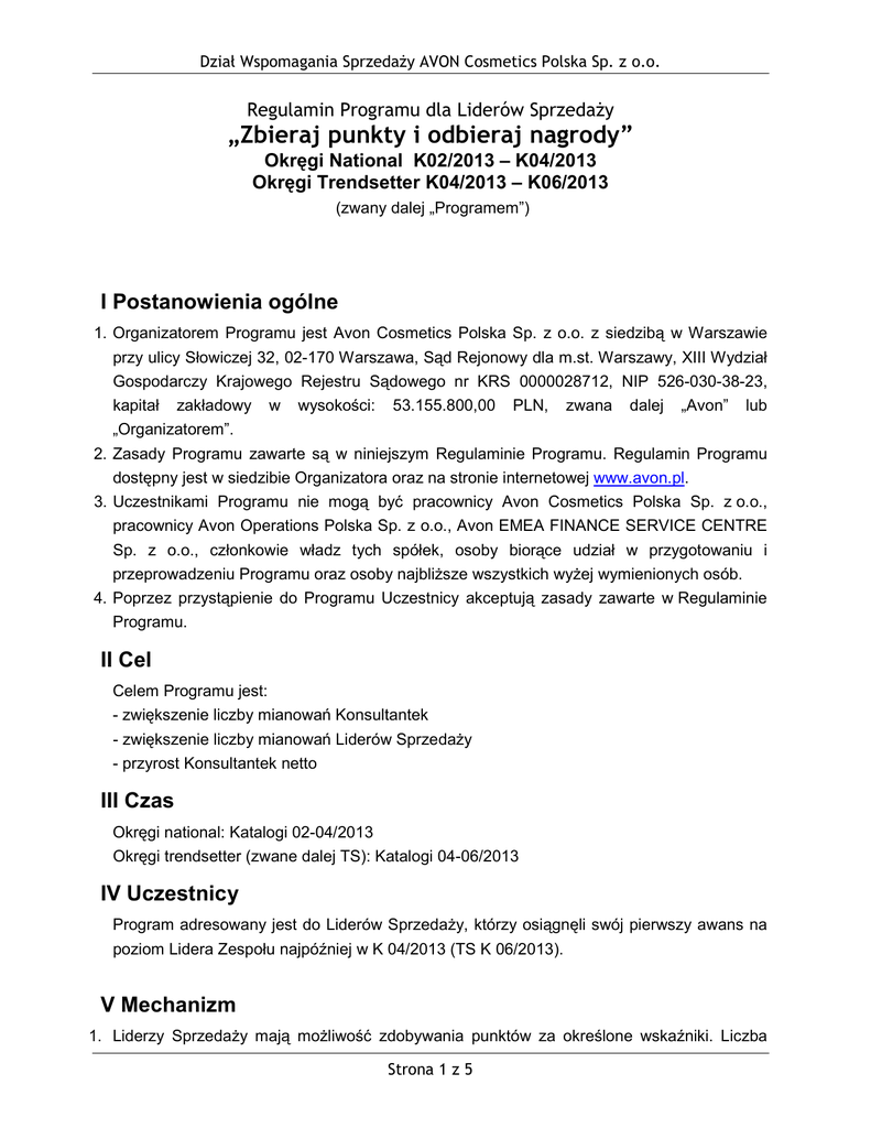 Dział Wspomagania Sprzedaży AVON Cosmetics Polska Sp. z o.o. Regulamin Programu dla Liderów Sprzedaży „Zbieraj punkty i odbieraj nagrody” Okręgi National K02/2013 – K04/2013 Okręgi Trendsetter K04/2013 – K06/2013 (zwany dalej „Programem”) I Postanowienia ogólne 1. Organizatorem Programu jest Avon Cosmetics Polska Sp. z o.o. z siedzibą w Warszawie przy ulicy Słowiczej 32, 02-170 Warszawa, Sąd Rejonowy dla m.st. Warszawy, XIII Wydział Gospodarczy Krajowego Rejestru Sądowego nr KRS 0000028712, NIP 526-030-38-23, kapitał zakładowy w wysokości: 53.155.800,00 PLN, zwana dalej „Avon” lub „Organizatorem”. 2. Zasady Programu zawarte są w niniejszym Regulaminie Programu. Regulamin Programu dostępny jest w siedzibie Organizatora oraz na stronie internetowej www.avon.pl. 3. Uczestnikami Programu nie mogą być pracownicy Avon Cosmetics Polska Sp. z o.o., pracownicy Avon Operations Polska Sp. z o.o., Avon EMEA FINANCE SERVICE CENTRE Sp. z o.o., członkowie władz tych spółek, osoby biorące udział w przygotowaniu i przeprowadzeniu Programu oraz osoby najbliższe wszystkich wyżej wymienionych osób. 4. Poprzez przystąpienie do Programu Uczestnicy akceptują zasady zawarte w Regulaminie Programu. II Cel Celem Programu jest: - zwiększenie liczby mianowań Konsultantek - zwiększenie liczby mianowań Liderów Sprzedaży - przyrost Konsultantek netto III Czas Okręgi national: Katalogi 02-04/2013 Okręgi trendsetter (zwane dalej TS): Katalogi 04-06/2013 IV Uczestnicy Program adresowany jest do Liderów Sprzedaży, którzy osiągnęli swój pierwszy awans na poziom Lidera Zespołu najpóźniej w K 04/2013 (TS K 06/2013). V Mechanizm 1. Liderzy Sprzedaży mają możliwość zdobywania punktów za określone wskaźniki. Liczba Strona 1 z 5 Dział Wspomagania Sprzedaży AVON Cosmetics Polska Sp. z o.o. punktów jaką można uzyskać za poszczególne wskaźniki została pokazana w poniższej tabeli: Tabela nr 1 Za co można otrzymać punkty? Mianowanie KK 150+ Liczba punktów Kiedy naliczane? 5 Na zakończenie każdego katalogu trwania Programu Mianowanie Lidera Sprzedaży z min. 5 50 Na zakończenie każdego katalogu trwania Programu 10 Na zakończenie programu** mianowaniami KK 150+ Przyrost Konsultantek netto (mianowania 150zł +reinstalacje 50 zł+ usunięcia)* * Punkty za Przyrost Konsultantek nie będą naliczane Nowym Liderom, którzy podpisali umowę Lidera Sprzedaży i osiągnęli pierwszy awans na poziom min. LZ w katalogach trwania Programu ** Punkty za Przyrost Konsultantek Netto zostaną doliczone do ogólnej liczby punktów na zakończenie Programu 2. W Programie liczone będą: a. Łączna liczba mianowań Konsultantek 150+ w czasie trwania Programu; b. Łączna liczba mianowań Liderów Sprzedaży z min.5 zamianowanymi Konsultantkami 150+ w czasie trwania Programu (uzyskanie przez Lidera mianowanego poziomu min. Lidera Zespołu w trakcie trwania Programu nie jest warunkiem koniecznym do przyznania punktów Liderowi Nadrzędnemu). c. Przyrost Konsultantek netto w czasie trwania Programu, który będzie liczony wg poniższego wzoru: Przyrost Konsultantek netto w czasie trwania Programu = (suma mianowań Konsultantek 150+ w czasie trwania Programu + suma reinstalacji 50+ w czasie trwania Programu – suma usunięć w czasie trwania Programu). d. % zaległych płatności Konsultantek z G1 aktywnych w czasie trwania Programu, które będą liczone wg poniższego wzoru: % zaległych płatności Konsultantek = łączna kwota zaległości Konsultantek z G1 aktywnych w czasie trwania Programu / łączna kwota należności za zamówienia Konsultantek z G1 aktywnych w czasie trwania Programu. e. Wymagalne płatności własne Lidera Zespołu za sprzedaż w czasie trwania Programu. f. Poziom min. Lidera Zespołu na zakończenie katalogu, za który Lider będzie odbierał nagrody. g. Konsultantki transferowane w katalogu 04/2013 nie będą uwzględnione Liderowi Sprzedaży w wynikach końcowych Programu. Strona 2 z 5 Dział Wspomagania Sprzedaży AVON Cosmetics Polska Sp. z o.o. VI Nagrody 1. Nagrody w Programie są różne w zależności od liczby punktów, które uzyska Lider w czasie trwania Programu: Tabela nr 2 Łączna minimalna liczba punktów wymagana do Bonus Nagroda otrzymania nagrody Bonus 1 50 Zestaw nowości* Bonus 2 80 Zestaw nowości + 250 zł Bonus 3 130 Zestaw nowości + 250 zł + 750 zł Bonus 4 200 Zestaw nowości + 250 zł + 750 zł + 1 000 zł *Skład zestawu nowości: Tabela nr 3 LP 1 2 3 4 5 6 7 8 Nazwa Produktu Serum antycellulitowe o podwójnym działaniu Woda toaletowa Summer White Sunset 50ML Szminka Ultra Color Reach Matta Kiss Błyszczyk "promienny uśmiech" GLEAMING PINK Serum wyrównujące koloryt skóry z serii ANEW CLINICAL Krem wyrównujący koloryt skóry z serii ANEW CLINICAL ANEW CLINICAL PHARMA CRM 30ML V2 Woda perfumowana Only Imagine 50ml Łączna wartość zestawu Cena regularna produktu 41 zł 41 zł 26 zł 26 zł 92 zł 66 zł 66 zł 80 zł 438 zł 2. Nagrody będą przyznawane Liderom w czasie trwania Programu po uzyskaniu odpowiedniej liczby punktów. Przykłady przyznania nagrody zostały opisane w tabeli nr 4. 3. Brak poziomu min. LZ na zakończenie katalogów 02 i/lub 03/2013 , za które przyznawane będą nagrody nie powoduje utraty dotychczas zebranych punktów. Punkty zostaną doliczone do punktów zdobytych w kolejnym katalogu. Tabela nr 4 (okręgach trendsetter Program trwa w K04-06/2013) L Licz S Nagroda Katalog Licz Suma Nagro- Katalog Licz Suma Nagro- Katalog ba przyznania/ ba pkt. da przyznania/ ba pkt. da przyznania/ pkt. odebrania pkt. K02+ odebrania pkt. K02+ odebrania w nagrody w K03 nagrody w K03+ nagrody K02 (poziom min. K03 (poziom min. K04 K04 (poziom min. LZ w K02) A 20 brak brak LZ w K03) 10 30 brak brak LZ w K04) 50 80 Zestaw nowości + bonus Strona 3 z 5 K06 Dział Wspomagania Sprzedaży AVON Cosmetics Polska Sp. z o.o. 250 zł B 50 Zestaw K04 20 70 Brak brak 60 130 nowości bonus K06 250 zł + 750