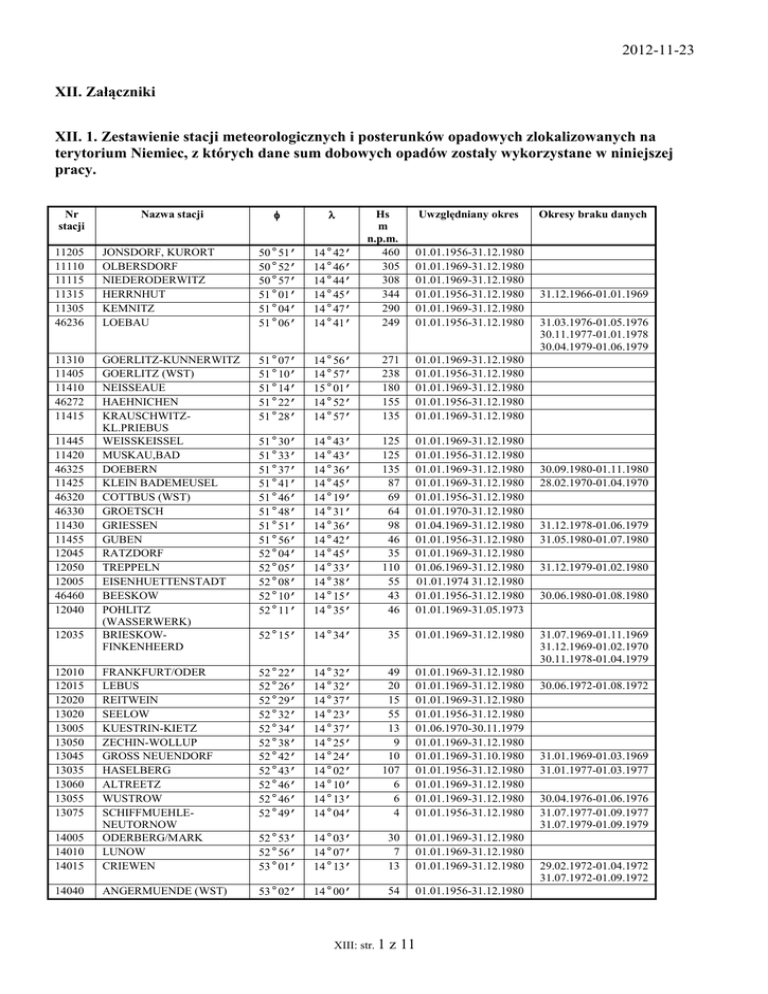 2012-11-23 XII. Załączniki XII. 1. Zestawienie stacji meteorologicznych i posterunków opadowych zlokalizowanych na terytorium Niemiec, z których dane sum dobowych opadów zostały wykorzystane w niniejszej pracy. Nr stacji 11205 11110 11115 11315 11305 46236 JONSDORF, KURORT OLBERSDORF NIEDERODERWITZ HERRNHUT KEMNITZ LOEBAU 50°51’ 50°52’ 50°57’ 51°01’ 51°04’ 51°06’ 14°42’ 14°46’ 14°44’ 14°45’ 14°47’ 14°41’ Hs m n.p.m. 460 305 308 344 290 249 11310 11405 11410 46272 11415 GOERLITZ-KUNNERWITZ GOERLITZ (WST) NEISSEAUE HAEHNICHEN KRAUSCHWITZKL.PRIEBUS WEISSKEISSEL MUSKAU,BAD DOEBERN KLEIN BADEMEUSEL COTTBUS (WST) GROETSCH GRIESSEN GUBEN RATZDORF TREPPELN EISENHUETTENSTADT BEESKOW POHLITZ (WASSERWERK) BRIESKOWFINKENHEERD 51°07’ 51°10’ 51°14’ 51°22’ 51°28’ 14°56’ 14°57’ 15°01’ 14°52’ 14°57’ 271 238 180 155 135 01.01.1969-31.12.1980 01.01.1956-31.12.1980 01.01.1969-31.12.1980 01.01.1956-31.12.1980 01.01.1969-31.12.1980 51°30’ 51°33’ 51°37’ 51°41’ 51°46’ 51°48’ 51°51’ 51°56’ 52°04’ 52°05’ 52°08’ 52°10’ 52°11’ 14°43’ 14°43’ 14°36’ 14°45’ 14°19’ 14°31’ 14°36’ 14°42’ 14°45’ 14°33’ 14°38’ 14°15’ 14°35’ 125 125 135 87 69 64 98 46 35 110 55 43 46 01.01.1969-31.12.1980 01.01.1956-31.12.1980 01.01.1969-31.12.1980 01.01.1969-31.12.1980 01.01.1956-31.12.1980 01.01.1970-31.12.1980 01.04.1969-31.12.1980 01.01.1956-31.12.1980 01.01.1969-31.12.1980 01.06.1969-31.12.1980 01.01.1974 31.12.1980 01.01.1956-31.12.1980 01.01.1969-31.05.1973 52°15’ 14°34’ 35 01.01.1969-31.12.1980 52°22’ 52°26’ 52°29’ 52°32’ 52°34’ 52°38’ 52°42’ 52°43’ 52°46’ 52°46’ 52°49’ 14°32’ 14°32’ 14°37’ 14°23’ 14°37’ 14°25’ 14°24’ 14°02’ 14°10’ 14°13’ 14°04’ 49 20 15 55 13 9 10 107 6 6 4 01.01.1969-31.12.1980 01.01.1969-31.12.1980 01.01.1969-31.12.1980 01.01.1956-31.12.1980 01.06.1970-30.11.1979 01.01.1969-31.12.1980 01.01.1969-31.10.1980 01.01.1956-31.12.1980 01.01.1969-31.12.1980 01.01.1969-31.12.1980 01.01.1956-31.12.1980 14005 14010 14015 FRANKFURT/ODER LEBUS REITWEIN SEELOW KUESTRIN-KIETZ ZECHIN-WOLLUP GROSS NEUENDORF HASELBERG ALTREETZ WUSTROW SCHIFFMUEHLENEUTORNOW ODERBERG/MARK LUNOW CRIEWEN 52°53’ 52°56’ 53°01’ 14°03’ 14°07’ 14°13’ 30 7 13 01.01.1969-31.12.1980 01.01.1969-31.12.1980 01.01.1969-31.12.1980 14040 ANGERMUENDE (WST) 53°02’ 14°00’ 54 01.01.1956-31.12.1980 11445 11420 46325 11425 46320 46330 11430 11455 12045 12050 12005 46460 12040 12035 12010 12015 12020 13020 13005 13050 13045 13035 13060 13055 13075 Nazwa stacji XIII: str. 1 Uwzględniany okres z 11 01.01.1956-31.12.1980 01.01.1969-31.12.1980 01.01.1969-31.12.1980 01.01.1956-31.12.1980 01.01.1969-31.12.1980 01.01.1956-31.12.1980 Okresy braku danych 31.12.1966-01.01.1969 31.03.1976-01.05.1976 30.11.1977-01.01.1978 30.04.1979-01.06.1979 30.09.1980-01.11.1980 28.02.1970-01.04.1970 31.12.1978-01.06.1979 31.05.1980-01.07.1980 31.12.1979-01.02.1980 30.06.1980-01.08.1980 31.07.1969-01.11.1969 31.12.1969-01.02.1970 30.11.1978-01.04.1979 30.06.1972-01.08.1972 31.01.1969-01.03.1969 31.01.1977-01.03.1977 30.04.1976-01.06.1976 31.07.1977-01.09.1977 31.07.1979-01.09.1979 29.02.1972-01.04.1972 31.07.1972-01.09.1972 2012-11-23 Nr stacji Nazwa stacji 14020 14035 15005 15010 21215 21220 21205 21310 20010 20005 20205 20510 SCHWEDT/ODER VIERRADEN CASEKOW TANTOW PENKUN GRAMBOW ROTHENKLEMPENOW TORGELOW AHLBECK UECKERMUENDE (MNS) USEDOM MELLENTHIN 53°04’ 53°06’ 53°13’ 53°16’ 53°18’ 53°25’ 53°31’ 53°38’ 53°40’ 53°45’ 53°52’ 53°55’ 14°20’ 14°19’ 14°13’ 14°21’ 14°14’ 14°20’ 14°12’ 14°01’ 14°11’ 14°04’ 13°55’ 14°00’ Hs m n.p.m. 6 4 26 31 32 39 14 10 5 1 2 18 22005 SEEBAD HERINGSDORF 53°57’ 14°10’ 10 Uwzględniany okres Okresy braku danych 01.01.1969-30.11.1980 01.01.1969-31.12.1980 01.01.1956 31.12.1980 01.01.1956-31.12.1980 01.01.1956-31.12.1980 01.01.1956-31.12.1980 01.01.1956-31.12.1980 01.01.1956-31.12.1980 01.01.1956-31.12.1980 01.01.1956-31.12.1980 01.01.1956-31.12.1980 01.01.1969-31.12.1980 30.09.1971-01.11.1971 31.10.1978-01.05.1979 31.10.1978-01.01.1979 01.01.1956-31.12.1980 31.12.1972-01.04.1973 31.01.1969-01.08.1969 31.03.1975-01.08.1975 31.12.1968-01.01.1970 XII.2. Opis zawartości załączonego dysku DVD XII.2.1. Wstęp Jednym z zadań projektu badawczego PBZ-KBN-086/P04/2003: „Ekstremalne zdarzenia meteorologiczne i hydrologiczne w Polsce (ocena zdarzeń oraz prognozowanie ich skutków dla środowiska życia człowieka)”, w ramach którego wykonano niniejszą rozprawę było: kompilacja, ujednolicenie, weryfikacja i uzupełnienie istniejących baz danych dotyczących zdarzeń ekstremalnych oraz ich udostępnienie publiczne do celów naukowych, edukacyjnych i praktycznych. Dołączona do niniejszej publikacji płyta DVD, zawierająca zarówno dane źródłowe na których się opierano, jak i najważniejsze wyniki numeryczne, stanowi owego zadania częściową realizację. W trakcie pracy nad analizą struktury przestrzennej MSDO, ich estymacją i symulacją wygenerowano ponad 30 GB danych, z czego na DVD zostało zapisane 1,56 GB (1 684 990 913 bajtów) w 120 folderach zawierających 6151 plików. Oprócz tego, w celu ułatwienia użytkownikowi wizualizację niektórych wyników, dodano również pliki instalacyjne trzech programów działających w 32bitowych systemach Windows. Zawartość płyty po zakończeniu całości projektu będzie w drugiej połowie roku 2009 również udostępniona sieciowo poprzez Internet pod adresem https://geo.wnoz.us.edu.pl/. XIII: str. 2 z 11 2012-11-23 Niniejszy załącznik zawiera podstawowe informacje o zawartości załączonej płyty DVD oraz wskazówki dotyczące korzystania z niektórych, bardziej skomplikowanych składników tej zawartości. Folderom, plikom i danym w tabelach nadawano takie nazwy, aby po przeczytaniu niniejs