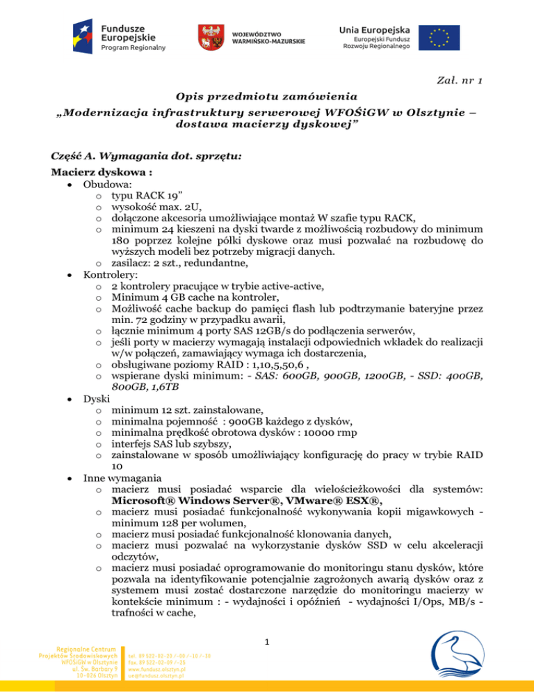 Zał. nr 1 Opis przedmiotu zamówienia „Modernizacja infrastruktury serwerowej WFOŚiGW w Olsztynie – dostawa macierzy dyskowej” Część A. Wymagania dot. sprzętu: Macierz dyskowa : • Obudowa: o typu RACK 19” o wysokość max. 2U, o dołączone akcesoria umożliwiające montaż W szafie typu RACK, o minimum 24 kieszeni na dyski twarde z możliwością rozbudowy do minimum 180 poprzez kolejne półki dyskowe oraz musi pozwalać na rozbudowę do wyższych modeli bez potrzeby migracji danych. o zasilacz: 2 szt., redundantne, • Kontrolery: o 2 kontrolery pracujące w trybie active-active, o Minimum 4 GB cache na kontroler, o Możliwość cache backup do pamięci flash lub podtrzymanie bateryjne przez min. 72 godziny w przypadku awarii, o łącznie minimum 4 porty SAS 12GB/s do podłączenia serwerów, o jeśli porty w macierzy wymagają instalacji odpowiednich wkładek do realizacji w/w połączeń, zamawiający wymaga ich dostarczenia, o obsługiwane poziomy RAID : 1,10,5,50,6 , o wspierane dyski minimum: - SAS: 600GB, 900GB, 1200GB, - SSD: 400GB, 800GB, 1,6TB • Dyski o minimum 12 szt. zainstalowane, o minimalna pojemność : 900GB każdego z dysków, o minimalna prędkość obrotowa dysków : 10000 rmp o interfejs SAS lub szybszy, o zainstalowane w sposób umożliwiający konfigurację do pracy w trybie RAID 10 • Inne wymagania o macierz musi posiadać wsparcie dla wielościeżkowości dla systemów: Microsoft® Windows Server®, VMware® ESX®, o macierz musi posiadać funkcjonalność wykonywania kopii migawkowych minimum 128 per wolumen, o macierz musi posiadać funkcjonalność klonowania danych, o macierz musi pozwalać na wykorzystanie dysków SSD w celu akceleracji odczytów, o macierz musi posiadać oprogramowanie do monitoringu stanu dysków, które pozwala na identyfikowanie potencjalnie zagrożonych awarią dysków oraz z systemem musi zostać dostarczone narzędzie do monitoringu macierzy w kontekście minimum : - wydajności i opóźnień - wydajności I/Ops, MB/s trafności w cache, 1 o Możliwość bezpośredniego podłączenia do macierzy przy użyciu interfejsów o minimalnej prędkości 8Gbps minimum 4 serwerów w konfiguracji HA, lub minimum 8 serwerów bez zapewnienia HA. o macierz musi posiadać oprogramowanie pozwalające na integrację z: VMware vCenter – provisioning i monitoring macierzy z widoku vCenter, VMware VASA, VMware Site Recovery Manager – wsparcie dla replikacji z VMware, Microsoft Virtual Disk Service (VDS), Microsoft Virtual Shadow Service (VSS), o na ww. funkcjonalności muszą być dostarczone na maksymalną pojemność macierzy. • Gwarancja producenta o minimum 60 miesięcy gwarancji producenta z czasem podjęcia czynności naprawczych na zgłoszenie awarii maksymalnie do dwóch dni roboczych od zgłoszenia. o Przyjmowanie zgłoszeń 24h/dobę 7 dni w tygodniu. o Wszystkie naprawy gwarancyjne powinny być możliwe w siedzibie zamawiającego o Serwis powinien być świadczony przez serwis fabryczny producenta lub przez autoryzowanych partnerów producenta. Modernizacja Serwera 1 : Zamawiający posiada serwer Actina Solar 422 A2 oparty o płytę główną Supermicro H8QG6-F Dostarczone podzespoły muszą być kompatybilne z płytą główną Actina Solar 422 A2 oparty o płytę główną Supermicro H8QG6-F • Karta HBA SAS do podłączenia macierzy o 12GB/s 2 porty o zgodność z Microsoft® Windows Server®, VMware® ESX® o wewnętrzna PCI Express o kompatybilność z w/w serwerem zamawiającego o komplet okablowania o długości min. 1,5 – max. 3 metrów, Modernizacja Serwera 2 : Zamawiający posiada serwer Actina Solar 220 A2 oparty o płytę główną Supermicro H8DGI-F Dostarczone podzespoły muszą być kompatybilne z płytą główną Actina Solar 220 A2 oparty o płytę główną Supermicro H8DGI-F • Karta HBA SAS do podłączenia macierzy o 12GB/s 2 porty o zgodność z Microsoft® Windows Server®, VMware® ESX® o wewnętrzna PCI Express o kompatybilność z w/w serwerem zamawiającego 2 o komplet okablowania o długości min. 1,5 – max. 3 metrów, Część B. Wymagania usługi wdrożenia: Zamawiający posiada infrastrukturę opartą o środowisko wirtualne Windows Hyper-V Server 2012 R2, Active Directory, Remote Desktop Services (RDS). • • • • • • Przygotowanie w porozumieniu z zamawiającym projektu przebudowy istniejącego środowiska, który będzie uwzględniał następujące założenia : o budowę 2 węzłowego klastra wysokiej dostępności pracującego w trybie active-active w celu zapewnienia ciągłości pracy środowiska, o zamawiający posiada serwery mające pełnić rolę węzłów klastra, o zamawiający posiada 4 licencje na Windows 2012 Server Standard, w tym 3 dostępne na potrzeby projektu. o wykonawca w celu zwolnienia jednego z serwerów przeprowadzi wirtualizację zainstalowanego natywnie systemu Windows 2012 Server pełniącego rolę serwera terminali i przeniesie go na zbudowany klaster lub zaproponuje i zrealizuje inne rozwiązanie przeniesienia obecnego systemu operacyjnego o dostarczona macierz będzie pełnić rolę współdzielonej przestrzeni dyskowej klastra, o budowa farmy serwerów RDS na potrzeby przyjęcia do max. 100 użytkowników, Instalację sprzętu w siedzibie zamawiającego, Konfigurację obejmującą : o konwersję zainstalowanego natywnie systemu Windows 2012 Server pełniącego rolę serwera terminali na maszynę wirtualną i przeniesie jej na zasoby nowego klastra, lub zaproponuje i zrealizuje inne rozwiązanie przeniesienia obecnego systemu operacyjnego. o instalację najnowszego firmware serwerów, o przygotowanie puli dyskowej na dostarczonej macierzy, o instalację i konfigurację redundantnych połączeń pomiędzy serwerami budowanego klastra, o podpięcie zasobów macierzy pod hosty wirtualizacyjne, o konfigurację zasobów dyskowych na potrzeby User Profile Disks, o instalację i konfigurację maszyn wirtualnych pełniących rolę : RD Connecti