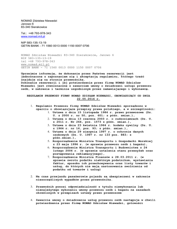 NOMAD Zdzisław Niewadzi Janowo 6 83-340 Sierakowice Tel.: +48 793-978-343 www.nomad.mil.pl NIP 583-135-13-19 GETIN BANK - 71 1560 0013 0000 1150 0007 0706 NOMAD Zdzisław Niewadzi 83-340 Sierakowice, Janowo 6 NIP 583-135-13-19 tel +48 793-978-343 www.nomad.mil.pl GETIN BANK - 71 1560 0013 0000 1150 0007 0706 Uprzejmie informuję, że dokonanie przez Państwa rezerwacji jest jednoznaczne z zapoznaniem się i akceptacją regulaminu, którego treść znajduje się na stronie przewoźnika. Dokonanie rezerwacji i jej potwierdzenie przez firmę NOMAD Zdzisław Niewadzi jest równoznaczne z zawarciem umowy o świadczeni usługi przewozu osób, w zakresie i terminie uzgodnionym przez zamawiającego i wykonawcę. REGULAMIN PRZEWOZU FIRMY NOMAD ZDISŁAW NIEWADZI, OBOWIAZUJĄCY OD DNIA 22.05.2016 r. 1. Regulamin Przewozu firmy NOMAD Zdzisław Niewadzi sporządzono w oparciu o obowiązujące przepisy prawa polskiego, a w szczególności: 1. Ustawa z dnia 15 listopada 1984 r. prawo przewozowe (Dz. U. z 2000 r. nr 50, poz. 601; z późn. zmian.), 2. Ustawa z dnia 13 czerwca 2003 r. o cudzoziemcach (Dz. U. z 2011 r. Nr 264, poz. 1573 z późn. zmian.), 3. Ustawa z dnia 23 kwietnia 1964 r. kodeks cywilny (Dz. U. z 1964 r. nr 16, poz. 93; z późn. zmian.), 4. Ustawa z dnia 29 sierpnia 1997 r. o ochronie danych osobowych (Dz. U. 1997 r. nr 133 poz. 883; z późn.zmian.), 5. Rozporządzenie Ministra Transportu i Gospodarki Morskiej z 23 maja 1996 r. (w sprawie przewozu osób i bagażu), 6. Rozporządzenie Ministra Transportu i Budownictwa z 24 lutego 2006 r. (w sprawie ustalenia stanu przesyłek oraz postępowania reklamacyjnego), 7. Rozporządzenie Ministra Finansów z 28.03.2011 r. (w sprawie zwrotu podatku niektórym podatnikom, wystawiania faktur, sposobu ich przechowywania oraz listy towarów i usług, do których nie mają zastosowania zwolnienia od podatku od towarów i usług) 2. Na czas przejazdu pasażerowie pojazdu są ubezpieczeni w zakresie nieszczęśliwych wypadków przez przewoźnika. 3. Przewoźnik ponosi odpowiedzialność z tytułu niewykonania lub nienależytego wykonaniu umowy przewozu osób i bagażu na zasadach określonych w przepisach ustawy prawo przewozowe 4. Zawarcie umowy o świadczenie usług przewozu osób następuje w chwili potwierdzenia przez firmę NOMAD Zdzisław Niewadzi, gotowości wykonania przewozu zgodnie ze złożonym przez Zamawiającego zamówieniem / rezerwacją. 5. Umowa dotyczy przewozu grupy osób określonej w zamówieniu wraz z bagażem zasadniczym i podręcznym w liczbie określonej w zamówieniu. 6. Podana cena jest ceną netto. Do ustalonej w zamówieniu kwoty, należy doliczyć podatek VAT określony dla danego kraju, w którym wykonywany jest przewóz 7. Strony ustalają termin i sposób zapłaty zgodny z wystawionymi do przewozu fakturami. 8. Przewoźnik podejmuje się dołożyć wszelkich starań, aby przewieźć Pasażerów i ich bagaż w odpowiednim czasie, zgodnie z obowiązującym rozkładem jazdy. 9. W przypadku awarii pojazdu wykluczającej możliwość dalszego kontynuowania podróży i braku możliwości jego naprawy na miejscu po wezwaniu odpowiedniego serwisu, firma NOMAD Zdzisław Niewadzi, w możliwie najkrótszym czasie zapewni pojazd lub pojazdy zastępcze, o odpowiedniej liczbie miejsc dla pasażerów – nie mniejszej niż liczba miejsc siedzących w pojeździe który uległ awarii. 10. Przewóz realizowany jest trasą pomiędzy miejscem wyjazdu, wskazanym przez Zamawiającego, a miejscem docelowego, najbardziej optymalną trasą, którą ustala kierowca. Przejazd przez punkty pośrednie lub inny przebieg trasy jest możliwy tylko w przypadku uzgodnienia ich w chwili dokonywania rezerwacji. 11. Przewóz zostanie wykonany środkiem transportu o parametrach umożliwiających przewóz wszystkich pasażerów na miejscach siedzących. 12. Ze względu na ograniczoną pojemność luków bagażowych każdy uczestnik przejazdu ma prawo do przewozu bagażu: podręcznego jedna sztuka - o wadze do 5 kg i zasadniczego - jedna sztuka – o wadze do 20 kg. Pojedynczy bagaż nie może przekraczać wymiarów 180 cm [wysokość + szerokość + długość] Wymiary bagażu podręcznego muszą pozwalać na swobodne umieszczenie go pod siedzeniem lub na półce znajdującej się nad siedzeniem Pasażera, a jego rozmiary nie po winny utrudniać swobody podróży pozostałym Pasażerom. Bagaż nie spełniający powyższych obostrzeń będzie traktowany jako bagaż dodatkowy i będzie mógł być przewieziony za dodatkową opłatą. 13. Bezwzględnie zakazuje się przewożenia substancji niebezpiecznych, wydzielających silny i nieprzyjemny zapach, mogących zabrudzić przewożonych pasażerów, ich bagaż lub pojazd; oraz których posiadanie jest zabronione prawem krajów, przez terytorium których realizowany jest przejazd. W przypadku ujawnienia takich substancji kierowca zobowiązany jest przez przewoźnika do usunięcia takiego bagażu w całości z pojazdu, ma prawo odmówić dalszego przewożenia pasażera, który wprowadził takie substancje do autobusu; [przewoźnik nie ponosi kosztów dalszej podróży pasażera i przewożenia usuniętego bagażu]. Ujawnienie substancji prawnie zabronionych skutkuje każdorazowym zawiadomieniem Policji o zaistniałej sytuacji. 14. Przewoźnik ma prawo odmówić zabrania bagażu, jeżeli nie spełnia on wymogów określonych w niniejszym Regulaminie 15. Zamawiający zobowiązuje się zapewnić nocleg i wyżywienie dla kierowcy, lub ponieść ich zryczałtowane koszty, jeśli w czasie podróży wyniknie taka konieczność. 16. Zamawiający zobowiązuje się opłacić na miejscu / w trakcie przejazdu, wszelkie koszty związane z postojem, parkowaniem i przejazdem wynajmowanego pojazdu, tj. parkingów, oraz opłat drogowych i winiet, opłat celnych, lub ponieść ich zryczałtowane koszty. 17. Klient ponosi pełną odpowiedzialność finansową w przypadku celowego lub wynikającego z zaniedbania uszkodzenia lub znisz