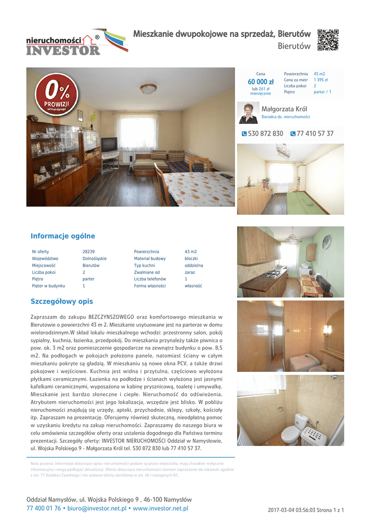 Mieszkanie dwupokojowe na sprzedaż, Bierutów Bierutów Cena 60 000 zł lub 261 zł miesięcznie Powierzchnia Cena za metr Liczba pokoi Piętro 43 m2 1 395 zł 2 parter / 1 Małgorzata Król Doradca ds. nieruchomości 530 872 830 77 410 57 37 Informacje ogólne Nr oferty 28239 Powierzchnia 43 m2 Województwo Dolnośląskie Materiał budowy bloczki Miejscowość Bierutów Typ kuchni oddzielna Liczba pokoi 2 Zwalniane od zaraz Piętro parter Liczba telefonów 1 Pięter w budynku 1 Forma własności własność Szczegółowy opis Zapraszam do zakupu BEZCZYNSZOWEGO oraz komfortowego mieszkania w Bierutowie o powierzchni 43 m 2. Mieszkanie usytuowane jest na parterze w domu wielorodzinnym.W skład lokalu mieszkalnego wchodzi: przestronny salon, pokój sypialny, kuchnia, łazienka, przedpokój. Do mieszkania przynależy także piwnica o pow. ok. 3 m2 oraz pomieszczenie gospodarcze na zewnątrz budynku o pow. 8,5 m2. Na podłogach w pokojach położono panele, natomiast ściany w całym mieszkaniu pokryte są gładzią. W mieszkaniu są nowe okna PCV, a także drzwi pokojowe i wejściowe. Kuchnia jest widna i przytulna, częściowo wyłożona płytkami ceramicznymi. Łazienka na podłodze i ścianach wyłożona jest jasnymi kafelkami ceramicznymi, wyposażona w kabinę prysznicową, toaletę i umywalkę. Mieszkanie jest bardzo słoneczne i ciepłe. Nieruchomość do odświeżenia. Atrybutem nieruchomości jest jego lokalizacja, wszędzie jest blisko. W pobliżu nieruchomości znajdują się urzędy, apteki, przychodnie, sklepy, szkoły, kościoły itp. Zapraszam na prezentację. Oferujemy również skuteczną, nieodpłatną pomoc w uzyskaniu kredytu na zakup nieruchomości. Zapraszamy do naszego biura w celu omówienia szczegółów oferty oraz ustalenia dogodnego dla Państwa terminu prezentacji. Szczegóły oferty: INVESTOR NIERUCHOMOŚCI Oddział w Namysłowie, ul. Wojska Polskiego 9 - Małgorzata Król tel. 530 872 830 lub 77 410 57 37. Nota prawna: Informacje dotyczące opisu nieruchomości podane są przez właściciela, mają charakter wyłącznie informacyjny i mogą podlegać aktualizacji. Oferta dotycząca nieruchomości stanowi zaproszenie do rokowań zgodnie z art. 71 Kodeksu Cywilnego i nie stanowi oferty określonej w art. 66 i następnych KC. Oddział Namysłów, ul. Wojska Polskiego 9 , 46-100 Namysłów 77 400 01 76 • [email protected] • www.investor.net.pl 2017-03-04 03:56:03 Strona 1 z 1