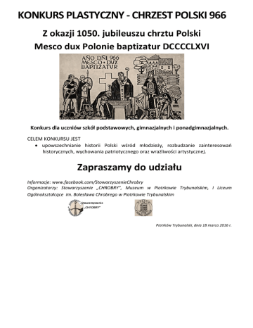 KONKURS PLASTYCZNY - CHRZEST POLSKI 966 Z okazji 1050. jubileuszu chrztu Polski Mesco dux Polonie baptizatur DCCCCLXVI Konkurs dla uczniów szkół podstawowych, gimnazjalnych i ponadgimnazjalnych. CELEM KONKURSU JEST upowszechnianie historii Polski wśród młodzieży, rozbudzanie zainteresowań historycznych, wychowania patriotycznego oraz wrażliwości artystycznej. Zapraszamy do udziału Informacje: www.facebook.com/StowarzyszenieChrobry Organizatorzy: Stowarzyszenie „CHROBRY”, Muzeum w Piotrkowie Trybunalskim, I Liceum Ogólnokształcące im. Bolesława Chrobrego w Piotrkowie Trybunalskim Piotrków Trybunalski, dnia 18 marca 2016 r.