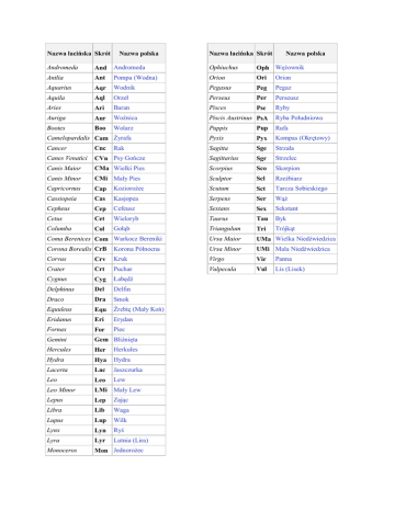 Nazwa łacińska Skrót Nazwa polska Nazwa łacińska Skrót Nazwa polska Andromeda And Andromeda Ophiuchus Oph Wężownik Antlia Ant Pompa (Wodna) Orion Ori Orion Aquarius Aqr Wodnik Pegasus Peg Pegaz Aquila Aql Orzeł Perseus Per Perseusz Aries Ari Baran Pisces Psc Ryby Auriga Aur Woźnica Piscis Austrinus PsA Ryba Południowa Bootes Boo Wolarz Puppis Pup Rufa Camelopardalis Cam Żyrafa Pyxis Pyx Kompas (Okrętowy) Cancer Cnc Sagitta Sge Strzała Canes Venatici CVn Psy Gończe Sagittarius Sgr Strzelec Canis Maior CMa Wielki Pies Scorpius Sco Skorpion Canis Minor CMi Mały Pies Sculptor Scl Rzeźbiarz Capricornus Cap Koziorożec Scutum Sct Tarcza Sobieskiego Cassiopeia Cas Kasjopea Serpens Ser Wąż Cepheus Cep Cefeusz Sextans Sex Sekstant Cetus Cet Wieloryb Taurus Tau Byk Columba Col Gołąb Triangulum Tri Trójkąt Ursa Maior UMa Wielka Niedźwiedzica Rak Coma Berenices Com Warkocz Bereniki Corona Borealis CrB Korona Północna Ursa Minor UMi Mała Niedźwiedzica Corvus Crv Kruk Virgo Vir Panna Crater Crt Puchar Vulpecula Vul Lis (Lisek) Cygnus Cyg Łabędź Delphinus Del Delfin Draco Dra Smok Equuleus Equ Źrebię (Mały Koń) Eridanus Eri Erydan Fornax For Piec Gemini Gem Bliźnięta Hercules Her Herkules Hydra Hya Hydra Lacerta Lac Jaszczurka Leo Leo Lew Leo Minor LMi Mały Lew Lepus Lep Zając Libra Lib Waga Lupus Lup Wilk Lynx Lyn Ryś Lyra Lyr Lutnia (Lira) Monoceros Mon Jednorożec