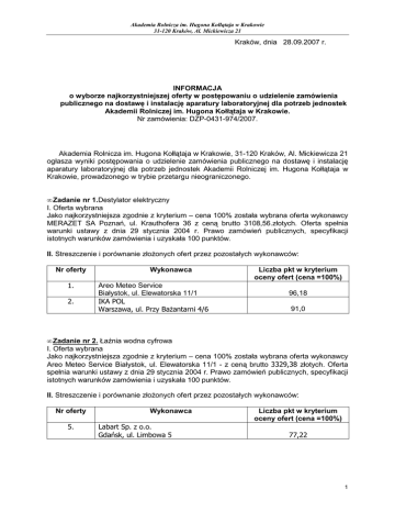Akademia Rolnicza im. Hugona Kołłątaja w Krakowie 31-120 Kraków, Al. Mickiewicza 21 Kraków, dnia 28.09.2007 r. INFORMACJA o wyborze najkorzystniejszej oferty w postępowaniu o udzielenie zamówienia publicznego na dostawę i instalację aparatury laboratoryjnej dla potrzeb jednostek Akademii Rolniczej im. Hugona Kołłątaja w Krakowie. Nr zamówienia: DZP-0431-974/2007. Akademia Rolnicza im. Hugona Kołłątaja w Krakowie, 31-120 Kraków, Al. Mickiewicza 21 ogłasza wyniki postępowania o udzielenie zamówienia publicznego na dostawę i instalację aparatury laboratoryjnej dla potrzeb jednostek Akademii Rolniczej im. Hugona Kołłątaja w Krakowie, prowadzonego w trybie przetargu nieograniczonego. • Zadanie nr 1.Destylator elektryczny I. Oferta wybrana Jako najkorzystniejsza zgodnie z kryterium – cena 100% została wybrana oferta wykonawcy MERAZET SA Poznań, ul. Krauthofera 36 z ceną brutto 3108,56.złotych. Oferta spełnia warunki ustawy z dnia 29 stycznia 2004 r. Prawo zamówień publicznych, specyfikacji istotnych warunków zamówienia i uzyskała 100 punktów. II. Streszczenie i porównanie złoŜonych ofert przez pozostałych wykonawców: Nr oferty 1. 2. Wykonawca Areo Meteo Service Białystok, ul. Elewatorska 11/1 IKA POL Warszawa, ul. Przy BaŜantarni 4/6 Liczba pkt w kryterium oceny ofert (cena =100%) 96,18 91,0 • Zadanie nr 2. Łaźnia wodna cyfrowa I. Oferta wybrana Jako najkorzystniejsza zgodnie z kryterium – cena 100% została wybrana oferta wykonawcy Areo Meteo Service Białystok, ul. Elewatorska 11/1 - z ceną brutto 3329,38 złotych. Oferta spełnia warunki ustawy z dnia 29 stycznia 2004 r. Prawo zamówień publicznych, specyfikacji istotnych warunków zamówienia i uzyskała 100 punktów. II. Streszczenie i porównanie złoŜonych ofert przez pozostałych wykonawców: Nr oferty 5. Wykonawca Labart Sp. z o.o. Gdańsk, ul. Limbowa 5 Liczba pkt w kryterium oceny ofert (cena =100%) 77,22 1 Akademia Rolnicza im. Hugona Kołłątaja w Krakowie 31-120 Kraków, Al. Mickiewicza 21 • Zadanie nr 3. Mieszadło magnetyczne I. Oferta wybrana Jako najkorzystniejsza zgodnie z kryterium – cena 100% została wybrana oferta wykonawcy IKA POL Warszawa, ul. Przy BaŜantarni 4/6 - z ceną brutto 4294,40 złotych. Oferta spełnia warunki ustawy z dnia 29 stycznia 2004 r. Prawo zamówień publicznych, specyfikacji istotnych warunków zamówienia i uzyskała 100 punktów. II. Streszczenie i porównanie złoŜonych ofert przez pozostałych wykonawców: Nr oferty 1. 5. Wykonawca Areo Meteo Service Białystok, ul. Elewatorska 11/1 Labart Sp. z o.o. Gdańsk, ul. Limbowa 5 Liczba pkt w kryterium oceny ofert (cena =100%) 83,83 90,06 • Zadanie nr 4. Wytrząsarka I. Oferta wybrana Jako najkorzystniejsza zgodnie z kryterium – cena 100% została wybrana oferta wykonawcy IKA POL Warszawa, ul. Przy BaŜantarni 4/6 - z ceną brutto 1634,80 złotych. Oferta spełnia warunki ustawy z dnia 29 stycznia 2004 r. Prawo zamówień publicznych, specyfikacji istotnych warunków zamówienia i uzyskała 100 punktów. II. Streszczenie i porównanie złoŜonych ofert przez pozostałych wykonawców: Nr oferty 5. Wykonawca Labart Sp. z o.o. Gdańsk, ul. Limbowa 5 Liczba pkt w kryterium oceny ofert (cena =100%) 95,41 • Zadanie nr 5. Wytrząsarka z łaźnią wodną I. Oferta wybrana Jako najkorzystniejsza zgodnie z kryterium – cena 100% została wybrana oferta wykonawcy Labart Sp. z o.o. Gdańsk, ul. Limbowa 5 - z ceną brutto 8296,00 złotych. Oferta spełnia warunki ustawy z dnia 29 stycznia 2004 r. Prawo zamówień publicznych, specyfikacji istotnych warunków zamówienia i uzyskała 100 punktów. • Zadanie nr 6. Waga analityczna I. Oferta wybrana Jako najkorzystniejsza zgodnie z kryterium – cena 100% została wybrana oferta wykonawcy ZMP Radwag Radom, ul. Bracka 28 - z ceną brutto 5856,00 złotych. Oferta spełnia warunki ustawy z dnia 29 stycznia 2004 r. Prawo zamówień publicznych, specyfikacji istotnych warunków zamówienia i uzyskała 100 punktów. II. Streszczenie i porównanie złoŜonych ofert przez pozostałych wykonawców: Nr oferty 1. Wykonawca Areo Meteo Service Białystok, ul. Elewatorska 11/1 Liczba pkt w kryterium oceny ofert (cena =100%) 72,74 2 Akademia Rolnicza im. Hugona Kołłątaja w Krakowie 31-120 Kraków, Al. Mickiewicza 21 2. 9. IKA POL Warszawa, ul. Przy BaŜantarni 4/6 Labart Sp. z o.o. Gdańsk, ul. Limbowa 5 80,03 88,89 • Zadanie nr 7. Waga laboratoryjna I. Oferta wybrana Jako najkorzystniejsza zgodnie z kryterium – cena 100% została wybrana oferta wykonawcy ZMP Radwag Radom, ul. Bracka 28 - z ceną brutto 1854,40 złotych. Oferta spełnia warunki ustawy z dnia 29 stycznia 2004 r. Prawo zamówień publicznych, specyfikacji istotnych warunków zamówienia i uzyskała 100 punktów. II. Streszczenie i porównanie złoŜonych ofert przez pozostałych wykonawców: Nr oferty Wykonawca Areo Meteo Service Białystok, ul. Elewatorska 11/1 2. IKA POL Warszawa, ul. Przy BaŜantarni 4/6 9. Labart Sp. z o.o. Gdańsk, ul. Limbowa 5 *) oferta nie podlega ocenie Liczba pkt w kryterium oceny ofert (cena =100%) 1. * 80,04 88,89 • Zadanie nr 8. Waga laboratoryjna I. Oferta wybrana Jako najkorzystniejsza zgodnie z kryterium – cena 100% została wybrana oferta wykonawcy ZMP Radwag Radom, ul. Bracka 28 - z ceną brutto 1220,00 złotych. Oferta spełnia warunki ustawy z dnia 29 stycznia 2004 r. Prawo zamówień publicznych, specyfikacji istotnych warunków zamówienia i uzyskała 100 punktów. III. Streszczenie i porównanie złoŜonych ofert przez pozostałych wykonawców: Nr oferty 2. 9. Wykonawca IKA POL Warszawa, ul. Przy BaŜantarni 4/6 Labart Sp. z o.o. Gdańsk, ul. Limbowa 5 Liczba pkt w kryterium oceny ofert (cena =100%) 80,06 88,89 3