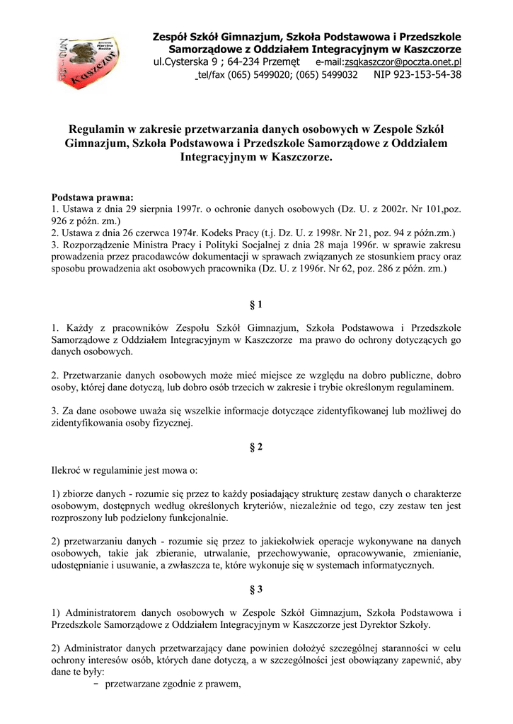 Zespół Szkół Gimnazjum, Szkoła Podstawowa i Przedszkole Samorządowe z Oddziałem Integracyjnym w Kaszczorze ul.Cysterska 9 ; 64-234 Przemęt e-mail:[email protected] tel/fax (065) 5499020; (065) 5499032 NIP 923-153-54-38 Regulamin w zakresie przetwarzania danych osobowych w Zespole Szkół Gimnazjum, Szkoła Podstawowa i Przedszkole Samorządowe z Oddziałem Integracyjnym w Kaszczorze. Podstawa prawna: 1. Ustawa z dnia 29 sierpnia 1997r. o ochronie danych osobowych (Dz. U. z 2002r. Nr 101,poz. 926 z późn. zm.) 2. Ustawa z dnia 26 czerwca 1974r. Kodeks Pracy (t.j. Dz. U. z 1998r. Nr 21, poz. 94 z późn.zm.) 3. Rozporządzenie Ministra Pracy i Polityki Socjalnej z dnia 28 maja 1996r. w sprawie zakresu prowadzenia przez pracodawców dokumentacji w sprawach związanych ze stosunkiem pracy oraz sposobu prowadzenia akt osobowych pracownika (Dz. U. z 1996r. Nr 62, poz. 286 z późn. zm.) §1 1. Każdy z pracowników Zespołu Szkół Gimnazjum, Szkoła Podstawowa i Przedszkole Samorządowe z Oddziałem Integracyjnym w Kaszczorze ma prawo do ochrony dotyczących go danych osobowych. 2. Przetwarzanie danych osobowych może mieć miejsce ze względu na dobro publiczne, dobro osoby, której dane dotyczą, lub dobro osób trzecich w zakresie i trybie określonym regulaminem. 3. Za dane osobowe uważa się wszelkie informacje dotyczące zidentyfikowanej lub możliwej do zidentyfikowania osoby fizycznej. §2 Ilekroć w regulaminie jest mowa o: 1) zbiorze danych - rozumie się przez to każdy posiadający strukturę zestaw danych o charakterze osobowym, dostępnych według określonych kryteriów, niezależnie od tego, czy zestaw ten jest rozproszony lub podzielony funkcjonalnie. 2) przetwarzaniu danych - rozumie się przez to jakiekolwiek operacje wykonywane na danych osobowych, takie jak zbieranie, utrwalanie, przechowywanie, opracowywanie, zmienianie, udostępnianie i usuwanie, a zwłaszcza te, które wykonuje się w systemach informatycznych. §3 1) Administratorem danych osobowych w Zespole Szkół Gimnazjum, Szkoła Podstawowa i Przedszkole Samorządowe z Oddziałem Integracyjnym w Kaszczorze jest Dyrektor Szkoły. 2) Administrator danych przetwarzający dane powinien dołożyć szczególnej staranności w celu ochrony interesów osób, których dane dotyczą, a w szczególności jest obowiązany zapewnić, aby dane te były: - przetwarzane zgodnie z prawem, Zespół Szkół Gimnazjum, Szkoła Podstawowa i Przedszkole Samorządowe z Oddziałem Integracyjnym w Kaszczorze ul.Cysterska 9 ; 64-234 Przemęt e-mail:[email protected] tel/fax (065) 5499020; (065) 5499032 NIP 923-153-54-38 - zbierane dla oznaczonych, zgodnych z prawem celów i nie poddawane dalszemu przetwarzaniu niezgodnemu z tymi celami, - merytorycznie poprawne i adekwatne w stosunku do celów, w jakich są przetwarzane, - przechowywane w postaci umożliwiającej identyfikację osób, których dotyczą, nie dłużej niż jest to niezbędne do osiągnięcia celu przetwarzania. 3) Przetwarzanie danych w celu innym niż ten, dla którego zostały zebrane, jest dopuszczalne, jeżeli nie narusza praw i wolności osoby, której dane dotyczą. 4) Administrator danych jest obowiązany zastosować środki techniczne i organizacyjne zapewniające ochronę przetwarzanych danych osobowych odpowiednią do zagrożeń oraz kategorii danych objętych ochroną, a w szczególności powinien zabezpieczyć dane przed ich udostępnieniem osobom nieupoważnionym, zabraniem przez osobę nieuprawnioną, przetwarzaniem z naruszeniem ustawy oraz zmianą, utratą, uszkodzeniem lub zniszczeniem. §4 1) Do przetwarzania danych mogą być dopuszczone wyłącznie osoby posiadające upoważnienie nadane przez administratora danych . 2) Administrator danych jest obowiązany zapewnić kontrolę nad tym, jakie dane osobowe, kiedy i przez kogo zostały do zbioru wprowadzone oraz komu są przekazywane. 3) Administrator danych prowadzi ewidencję osób upoważnionych do ich przetwarzania, która powinna zawierać: - imię i nazwisko osoby upoważnionej, - datę nadania i ustania oraz zakres upoważnienia do przetwarzania danych osobowych, - identyfikator, jeżeli dane są przetwarzane w systemie informatycznym. 4) Osoby, które zostały upoważnione do przetwarzania danych, są obowiązane zachować w tajemnicy te dane osobowe oraz sposoby ich zabezpieczenia. §5 1) Administrator danych może upoważnić pracowników szkoły: pedagogicznych i niepedagogicznych lub na ich wniosek udzielić upoważnienia do przetwarzania danych osobowych w Zespole Szkół Gimnazjum, Szkoła Podstawowa i Przedszkole Samorządowe z Oddziałem Integracyjnym w Kaszczorze. 2) Upoważnienia, o których mowa w ust. 1, są imienne i udzielane w formie pisemnej na czas określony lub na czas nieokreślony – do odwołania udzielonego upoważnienia. 3) Wniosek, o którym mowa w ust. 1, winien precyzyjnie określać zakres spraw objętych upoważnieniem. 4) Każde upoważnienie jest przechowywane w aktach osobowych pracownika. Zespół Szkół Gimnazjum, Szkoła Podstawowa i Przedszkole Samorządowe z Oddziałem Integracyjnym w Kaszczorze ul.Cysterska 9 ; 64-234 Przemęt e-mail:[email protected] tel/fax (065) 5499020; (065) 5499032 NIP 923-153-54-38 §6 1) Wzór ewidencji osób upoważnionych do przetwarzania danych osobowych w Zespole Szkół Gimnazjum, Szkoła Podstawowa i Przedszkole Samorządowe z Oddziałem Integracyjnym w Kaszczorze jest określony w załączniku nr 1 do regulaminu. 2) Wzór imiennego upoważnienia do przetwarzania danych osobowych obejmujących następujący zakres: dane osobowe uczniów/słuchaczy/, rodziców, opiekunów prawnych, niezbędnych do prowadzenia dokumentacji szkolnej oraz dla celów egzaminów jest określony w załączniku nr 2 do regulaminu. 3) Wzór imiennego upoważnienia do przetwarzania danych osobowych pracowników, w zakresie dotyczącym przetwarzania danych zgodnie z zakresem obowiązków i uprawnień jest określony w załączniku nr 3 do regulam