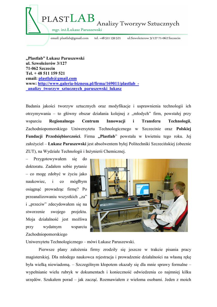 „Plastlab” Łukasz Paruszewski ul. Szwoleżerów 3/127 71-062 Szczecin Tel. + 48 511 159 521 email: [email protected] www: http://www.galeria-biznesu.pl/firma/169011/plastlab__analizy_tworzyw_sztucznych_paruszewski_lukasz Badania jakości tworzyw sztucznych oraz modyfikacje i usprawnienia technologii ich otrzymywania – to główny obszar działania kolejnej z „młodych” firm, powstałej przy wsparciu Regionalnego Centrum Innowacji i Transferu Technologii, Zachodniopomorskiego Uniwersytetu Technologicznego w Szczecinie oraz Polskiej Fundacji Przedsiębiorczości. Firma „Plastlab” powstała w kwietniu tego roku. Jej założyciel – Łukasz Paruszewski jest absolwentem byłej Politechniki Szczecińskiej (obecnie ZUT), na Wydziale Technologii i Inżynierii Chemicznej. – Przygotowywałem się do doktoratu. Zadałem sobie pytanie – co mogę zdobyć w życiu jako naukowiec, i co mógłbym osiągnąć prowadząc firmę? Po przeanalizowaniu wszystkich „za” i „przeciw” zdecydowałem się na stworzenie swojego projektu. Moja działalność jest możliwa przy wydatnym wsparciu Zachodniopomorskiego Uniwersytetu Technologicznego – mówi Łukasz Paruszewski. Pierwsze plany założenia firmy zrodziły się jeszcze w trakcie pisania pracy magisterskiej. Dla młodego naukowca rejestracja i prowadzenie działalności na własną rękę była wielką niewiadomą. – Szczególnym kłopotem okazały się dla mnie sprawy formalne – wypełnianie wielu rubryk w dokumentach i konieczność odwiedzenia co najmniej kilku urzędów. Szukałem porad – jak zacząć. Rozmawiałem z wieloma osobami. Jeden z moich przyjaciół polecił mi internetową stronę Regionalnego Centrum Innowacji i Transferu Technologii. Tam znalazłem różne przydatne informacje, m.in. o prowadzonych szkoleniach na temat zakładania własnej działalności. Tylko dzięki temu, że wziąłem udział w szkoleniach i zdobyłem niezbędną wiedzę, ta firma powstała – mówi jej właściciel. Współpraca z RCIiTT oraz PFP zaowocowała udziałem w cyklu szkoleń. – Na początku były to szkolenia na temat badań rynkowych. W przypadku mojej działalności nie było to akurat specjalnie potrzebne, ponieważ funkcjonowanie mojej firmy opiera się na nieco innych zasadach – mówi Paruszewski. – Dzięki temu poznałem jednak ludzi, którzy posłużyli mi fachową wiedzą, np. z zakresu doradztwa finansowego. Podatki, ZUS, rejestracja firm, czyli pierwsze kroki – to było niezbędne żeby założyć firmę. Późnej wziąłem udział w szkoleniu ”ABC Przedsiębiorczości”, to pozwoliło na ugruntowanie i podsumowanie wcześniej zdobytej wiedzy. Firma „Plastlab” pośredniczy w kontaktach między ośrodkami naukowymi a biznesem. Polega to na zbieraniu zleceń od firm zewnętrznych oraz ich realizacji w oparciu o zaplecze techniczne Zachodniopomorskiego Uniwersytetu Technologicznego w Szczecinie i wielu innych ośrodków badawczych. Główny zakres działalności to badania tworzyw sztucznych oraz technologie ich otrzymywania. Badania wykonywane dla firm zewnętrznych są realizowane kompleksowo – od analizy zlecenia, po zlecenie prac odpowiednim komórkom badawczym, odbiór wyników, ich interpretację i sformułowanie wniosków. – Klient nie otrzymuje suchych danych, z którymi nie wie, co zrobić – wyjaśnia Łukasz Paruszewski. – Moim zadaniem jest przeanalizowanie wyników, wyciągnięcie wniosków i przedstawienie propozycji dotyczących np. produkcji żywic syntetycznych. Prowadzimy także zwykłe badania tworzyw sztucznych. Możemy także rozstrzygać spory pomiędzy kontrahentami – dostawcami surowców dla określonego działu produkcji przemysłowej. Wachlarz firm, z którymi współpracuję jest bardzo szeroki. Głównie są to producenci różnorodnych elementów z tworzyw sztucznych. – Moja praca opiera się na ścisłej współpracy z ośrodkami badawczymi w całym kraju. To umowy długoterminowe, dzięki którym mam stały dostęp do porad ekspertów. Cena usługi jest konkurencyjna, a co ważne jest to usługa kompleksowa – od zdiagnozowania problemu do opracowania wniosków – dodaje Paruszewski. W tak specyficznej branży ważny jest sposób dotarcia do potencjalnego klienta. Reklama zewnętrzna, ogłoszenia w prasie czy poczta pantoflowa nie zdają tu egzaminu. – Skupiam się na specyfice produkcji danej firmy, czym ten producent się zajmuje i jakie ewentualnie może mieć problemy związane z procesem technologicznym. Przygotowuję plan i udoskonalenia, dzięki którym poprawiłaby się wydajność i jakość produktu. Jeśli pomysł zostanie zaakceptowany – nawiązujemy współpracę – mówi naukowiec. Jak dodaje – teraz chciałby się skupić na zdobyciu dofinansowania na prace badawcze i dalszy rozwój. Dzięki temu w przyszłości możliwe byłoby opracowanie własnej nowatorskiej technologii produkcji określonego materiału, zarejestrowanie patentu i wdrożenie produkcji na szerszą skalę. (pt) Firma powstała w ramach projektu „Wsparcie przedsiębiorczości akademickiej. INNOSTART”. Projekt współfinansowany przez Europejski Fundusz Społeczny Unii Europejskiej.