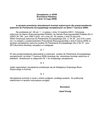 Zarządzenie nr 42/09 Burmistrza Kłodawy z dnia 14 maja 2009r w sprawie powołania obwodowych komisji wyborczych dla przeprowadzenia wyborów do Parlamentu Europejskiego zarządzonych na dzień 7 czerwca 2009r. Na podstawie art. 48 ust. 1 - 4 ustawy z dnia 12 kwietnia 2001r. Ordynacja wyborcza do Sejmu Rzeczypospolitej Polskiej i do Senatu Rzeczypospolitej Polskiej (Dz.U z2007r.Nr 190 , poz.1360 z późn. zm.) oraz art. 25 ustawy z dnia 23 stycznia 2004r.Ordynacja wyborcza do Parlamentu Europejskiego (Dz. U. Nr 25 , poz.219 z poźn. zm.) w związku z postanowieniem Prezydenta Rzeczypospolitej z dnia 9 marca 2009r w sprawie zarządzenia wyborów posłów do Parlamentu Europejskiego (Dz.U Nr 37 , poz. 287) Burmistrz Kłodawy zarządza co następuje: § 1 W celu przeprowadzenia głosowania w wyborach posłów do Parlamentu Europejskiego, zarządzonych na dzień 7 czerwca 2009r powołuje się obwodowe komisje wyborcze w składach określonych w załączniku Nr 1 do niniejszego zarządzenia. § 2 Jeden egzemplarz zarządzenia przekazuje się do Delegatury Krajowego Biura Wyborczego w Koninie. § 3 Zarządzenie wchodzi w życie z dniem podjęcia i podlega podaniu do publicznej wiadomości w sposób zwyczajowo przyjęty. Burmistrz Józef Chudy Załącznik nr 1 do Zarządzenia nr 42/09 Burmistrza Kłodawy z dnia 14 maja 2009r Obwodowa Komisja Wyborcza Nr 1 w Kłodawie 1.Urszula Zięba - Kłodawa 2.Zbigniew Kowalewski – Kłodawa 3.Janikowska Anna - Kłodawa 4.Fabiniak Julian - Kłodawa 5.Lipińska Marta - Kłodawa 6.Murawiak Władysław - Kłodawa 7.Nykiel Ewa - Rycerzew 8.Pińkowska Anna - Kłodawa 9.Nolbert Katrarzyna - Kłodawa 10.Pawlak Marta - Kłodawa 11.Marciniak Agnieszka - Kłodawa Obwodowa Komisja Wyborcza Nr 2 w Kłodawie 1.Siwiński Zdzisław – Kłodawa 2.Śliwa Agnieszka – Kłodawa 3.Cichocka Alicja – Kłodawa 4.Kołodziejska Agnieszka – Kłodawa 5.Kościukiewicz Danuta – Kłodawa 6.Rezler Magdalena Agnieszka – Rycerzew 7.Kowalewski Tomasz – Straszkówek 8.Niewiadomski Marian – Bierzwienna Krótka 9.Fafuła Paulina – Kłodawa 10.Dopierała Joanna – Głogowa 11.Kołodziejska Urszula – Kłodawa Obwodowa Komisja Wyborcza Nr 3 w Kłodawie 1.Motyka Anna – Kłodawa 2 Niewiadomski Paweł – Bierzwienna Krótka 3.Szkup Jolanta – Kłodawa 4.Skucińska Małgorzata - Kłodawa 5.Janikowska Sylwia - Kłodawa 6.Kozajda Ilona Helena – Bierzwienna Długa Kolonia 7.Królikowska Paula- Kłodawa 8.Maciejewska Urszula - Kłodawa 9.Kołodziejski Krzysztof - Dąbrówka 10.Dzikowska Maria - Cząstków 11.Sędziak Ewelina - Kłodawa Obwodowa Komisja Wyborcza Nr 4 w Kłodawie 1.Kaftan Ewa - Kłodawa 2.Malinowska Krystyna - Kłodawa 3.Barański Tomasz - Kłodawa 4.Wawrzyniak Halina - Kłodawa 5.Bińkowska Klaudia - Kłodawa 6.Smulczyk Emilia Aleksandra - Rycerzew 7.Mroczkowska Ewa – Wólka Czepowa 8.Niewiadomski Dariusz – Bierzwienna Krótka 9.Rosiak Ewa - Kłodawa 10.Ciesliński Piotr - Kłodawa 11.Danelska Anna - Kłodawa Obwodowa Komisja Wyborcza Nr 5 w Wólce Czepowej 1.Szerwińska Jolanta - Kłodawa 2.Romańska Magdalena – Wólka Czepowa 3.Kwiatkowska Aneta - Kłodawa 4.Rosiak Zbigniew - Cząstków 5.Rogaczewski Krzysztof - Straszkówek 6.Nykiel Kamila Weronika - Rycerzew 7.Łada Justyna - Kłodawa 8.Wiśniewska Małgorzata - Kłodawa 9.Motyka Magdalena - Kłodawa 10.Szafoni Katarzyna - Kłodawa Obwodowa Komisja Wyborcza Nr 6 w Dębinie 1.Andrzejewska Elżbieta - Kłodawa 2.Rosiak Anna - Cząstków 3.Śmigielska Agnieszka - Kłodawa 4.Michliński Janusz - Kłodawa 5.Michalak Jolanta - Kłodawa 6.Zwierzchowski Jerzy – Bierzwienna Długa 7.Nykiel Aleksander - Rycerzew 8.Zawadzki Piotr - Kłodawa 9.Gawłowska Wioletta - Kłodawa 10.Piotrowski Sebastian - Kłodawa 11.Cichocka Dorota – Bierzwienna Długa Kolonia Obwodowa Komisja Wyborcza Nr 7 w Leszczach 1.Kacprzak Krystyna - Leszcze 2.Kowalska Wiesława - Kłodawa 3.Kupińska Aleksandra - Kłodawa 4.Rybicki Tomasz - Kłodawa 5.Karo Wacław- Bierzwienna Długa 6.Pecyna Marzena - Kłodawa 7.Chmielowska Marta - Kłodawa 8.Kołodziejska Aleksandra - Kłodawa 9.Sztąber Mateusz - Kłodawa 10.Prusińska Ewa –Bierzwienna Długa 11.Olejniczak Agnieszka - Kłodawa Obwodowa Komisja Wyborcza Nr 8 w Rysinach Kolonii 1.Wasiak Konrad - Kłodawa 2.Topolska Marianna - Rysiny 3.Pietrzak Dominika - Kłodawa 4.Licheniak Wioletta - Kłodawa 5.Karo Halina – Bierzwienna Długa 6.Szałańska Agnieszka - Kłodawa 7.Nowak Aneta - Kłodawa 8.Adamczyk Małgorzata - Kłodawa 9.Szurgocińska Ilona - Kłodawa 10.Kupiński Marcin - Kłodawa Obwodowa Komisja Wyborcza Nr 9 w Cząstkowie 1.Domowicz Stanisław - Kłodawa 2.Krzaczyński Cezary - Kłodawa 3.Bawej Magdalena - Kłodawa 4.Chruścielska Teresa - Cząstków 5.Karo Radosław – Bierzwienna Długa 6.Majkowska Justyna - Kłodawa 7.Bednarowicz Jadwiga - Kłodawa 8.Kołodziejska Iwona - Kłodawa 9.Sędziak Aleksandra - Kłodawa 10.Grzelak Łukasz - Cząstków 11.Wołowska Ewa - Cząstków Obwodowa Komisja Wyborcza Nr 10 w Bierzwiennej Długiej Wsi 1.Michalak Anna - Kłodawa 2.Sztąber Grażyna - Kłodawa 3.Golanowska Elżbieta - Janczewy 4.Ogińska Martyna - Kłodawa 5.Waga Ewa - Kłodawa 6.Andrzejewski Zbigniew - Kłodawa 7.Karo Angelika – Bierzwienna Długa 8. Pińkowski Marek - Kłodawa 9.Janikowska Anna - Podgajew 10.Prusiński Wojciech – Bierzwienna Długa 11.Szafoni Maria -Kłodawa Obwodowa Komisja Wyborcza Nr 11 w Górkach 1.Olczyk Wiesława – Pomarzany Fabryczne 2.Cieśliński Jarosław - Rycerzew 3.Pierzgalska Ewa - Kłodawa 4.Turowska Patrycja - Kłodawa 5.Dzięgielewska Agata - Kłodawa 6.Andrzejewski Paweł - Kłodawa 7.Kikosicka Elżbieta - Wólka Czepowa 8.Kaftan Adrian - Kłodawa 9.Kantorska Katarzyna - Kłodawa 10.Antczak Joanna - Kłodawa 11.Broda Joanna - Kłodawa Obwodowa Komisja Wyborcza Nr 12 w Krzykosach 1.Bugaj Renata - Górki 2.Wiśniewska Barbara - Kłodawa 3.Kosmala Kamila - Kłodawa 4.Kowalski Janisław - Okoleniec 5.Krzaczyńska Joanna - Kłodawa 6.Drynkowsk