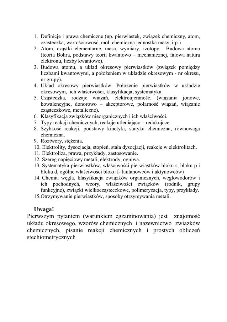 1. Definicje i prawa chemiczne (np. pierwiastek, związek chemiczny, atom, cząsteczka, wartościowość, mol, chemiczna jednostka masy, itp.) 2. Atom, cząstki elementarne, masa, wymiary, izotopy. Budowa atomu (teoria Bohra, podstawy teorii kwantowo – mechanicznej, falowa natura elektronu, liczby kwantowe). 3. Budowa atomu, a układ okresowy pierwiastków (związek pomiędzy liczbami kwantowymi, a położeniem w układzie okresowym - nr okresu, nr grupy). 4. Układ okresowy pierwiastków. Położenie pierwiastków w układzie okresowym, ich właściwości, klasyfikacja, systematyka. 5. Cząsteczka, rodzaje wiązań, elektroujemność, (wiązania jonowe, kowalencyjne, donorowo – akceptorowe, polarność wiązań, wiązanie cząsteczkowe, metaliczne). 6. Klasyfikacja związków nieorganicznych i ich właściwości. 7. Typy reakcji chemicznych, reakcje utleniająco – redukujące. 8. Szybkość reakcji, podstawy kinetyki, statyka chemiczna, równowaga chemiczna. 9. Roztwory, stężenia. 10. Elektrolity, dysocjacja, stopień, stała dysocjacji, reakcje w elektrolitach. 11. Elektroliza, prawa, przykłady, zastosowanie. 12. Szereg napięciowy metali, elektrody, ogniwa. 13. Systematyka pierwiastków, właściwości pierwiastków bloku s, bloku p i bloku d, ogólne właściwości bloku f- lantanowców i aktynowców) 14. Chemia węgla, klasyfikacja związków organicznych, węglowodorów i ich pochodnych, wzory, właściwości związków (rodnik, grupy funkcyjne), związki wielkocząsteczkowe, polimeryzacja, typy, przykłady. 15.Otrzymywanie pierwiastków, sposoby otrzymywania metali. Uwaga! Pierwszym pytaniem (warunkiem egzaminowania) jest znajomość układu okresowego, wzorów chemicznych i nazewnictwo związków chemicznych, pisanie reakcji chemicznych i prostych obliczeń stechiometrycznych