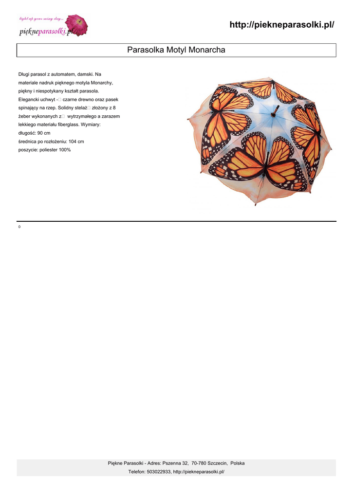 http://piekneparasolki.pl/ Parasolka Motyl Monarcha Długi parasol z automatem, damski. Na materiale nadruk pięknego motyla Monarchy, piękny i niespotykany kształt parasola. Elegancki uchwyt - czarne drewno oraz pasek spinający na rzep. Solidny stelaż złożony z 8 żeber wykonanych z wytrzymałego a zarazem lekkiego materiału fiberglass. Wymiary: długość: 90 cm średnica po rozłożeniu: 104 cm poszycie: poliester 100% 0 Piękne Parasolki - Adres: Pszenna 32, 70-780 Szczecin, Polska Telefon: 503022933, http://piekneparasolki.pl/ http://piekneparasolki.pl/ Piękne Parasolki - Adres: Pszenna 32, 70-780 Szczecin, Polska Telefon: 503022933, http://piekneparasolki.pl/