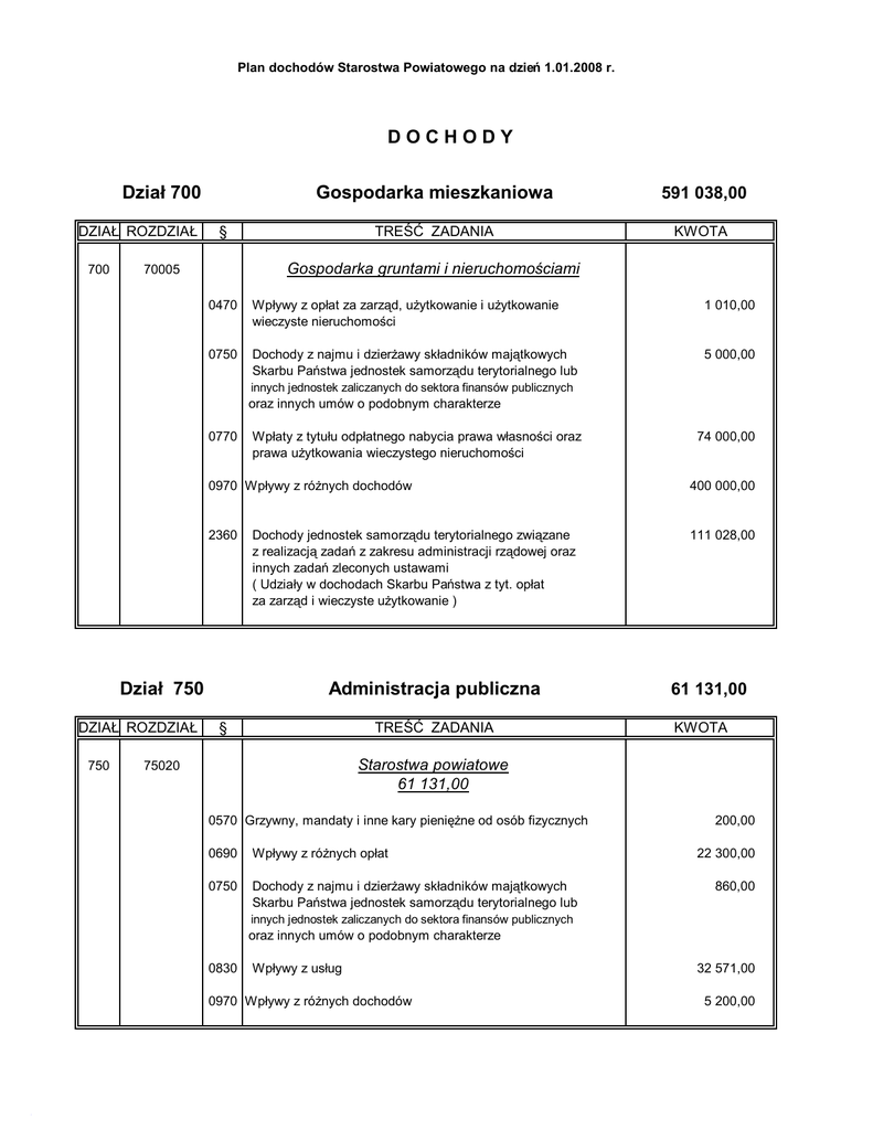 D O C H O D Y Dział 700 Gospodarka mieszkaniowa Dział 750