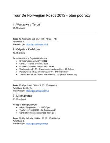 Tour De Norwegian Roads 2015 - plan podróży 1 .Warszawa / Toruń 19.06 (piątek) Trasa 19.06 (piątek) , 375 km, 11:00 19:00 (+1h) AutoMapa: 1. Mapy Google: https://goo.gl/maps/pd0Jl 2. Gdynia - Karlskona 19.06 (piątek) Prom StenaLine, z Gdyni do Karlskony: ● Nr rezerwacji promu: 71160035 ● Cena: 2115 zł za 5 osób i 3 auta ● Odprawa promowa zamyka się o 20:00 ● Wypłynięcie o 21:00 z Eugeniusza Kwiatkowskiego 60, Gdynia ● Przypłynięcie o 9:00 z Verkövägen 101, 371 65 Lyckeby ● Telefon: +48 58 660 92 00, +48 58 660 92 09 (pomoc Stena Line) Trasa 20.06 (sobota) , 791 km, 9:00 20:00 (+1h) AutoMapa: 2a, 2b, 2c. Mapy Google: https://goo.gl/maps/7oPLa 3. Lillehammer 20.06 (sobota) Nocleg w domu prywatnym: ● Adres: Bjørgefallet 113, 2636 Øyer ● Telefon: +4748009675 (Ola Szczepaniak) ● Cena: śliwowica i jeszcze “coś dobrego” ;) Trasa 21.06 (niedziela) , 394 km, 10:00 17:00 (+1h) AutoMapa: 3. Mapy Google: https://goo.gl/maps/BfKjo 4. Kristiansund 21.06 (niedziela) Nocleg w hytkach: ● Cena: 614 zł ● Adres: Dalaveien 22, 6511 Kristiansund, Norwegia ● Check in: od 15:00 do 19:00 ● Check out: do 12:00 ● Link do rezerwacji: http://www.booking.com/hotel/no/atlantenturistsenter.pl.html?sid=dcdb467ff54931e221e c8ab5d9d1c8fa;dcid=1;checkin=20150621;checkout=20150622;dist=0;group_rooms= 30736004_80749738_0_42_5_0_0;no_rooms=1;req_adults=5;req_children=0;srfid=a49 324a1c0db710d4c35c1dac32acc5cd74f87a7X1;type=total;ucfs=1&#map_closed Trasa 22.06 (poniedziałek) , 129 km, 10:00 16:00 (+2h) AutoMapa: 4. Mapy Google: https://goo.gl/maps/QYYgx Przerwa w Molde. Atrakcje Droga atlancycka 5. Molde / Andalsnes 22.06 (poniedziałek) Nocleg w hytkach: ● Cena: 450 zł ● Adres: Gjerdsetbygda, 6320 Åndalsnes ● Check in: od 12:00 ● Check out: do 12:00 ● Link do rezerwacji: http://www.booking.com/hotel/no/gjerdsetturistsenterandalsnes.pl.html?sid=dcdb467ff5 4931e221ec8ab5d9d1c8fa;dcid=1;checkin=20150622;checkout=20150623;dist=0;gro up_rooms=115868201_84663951_6_0_5_0_0;no_rooms=1;req_adults=5;req_children= 0;spdest=ci%2F266863;spdist=60.6;srfid=4a631980dfce0abd7f26c007edfe19a7145a98 acX6;type=total;ucfs=1& Trasa 23.06 (wtorek) , 158 km, 10:00 16:00 (+2h) AutoMapa: 5. Mapy Google: https://goo.gl/maps/VUdEf Droga Trolli i wodospady Stigfossen. 6. Alesund 23.06 (wtorek) , nocleg w Andalsnes: ● Cena: ● Adres: ● Telefon: ● Check in: ● Check out: ● Uwagi: Trasa 24.06 (środa) , 187 km, 10:00 16:00 (+2h) AutoMapa: 6. Mapy Google: https://goo.gl/maps/GJYji 6. Brikstalsbreen 24.06 (środa) Nocleg na kempingu Melkevoll Bretun: ● Cena: ● Adres: Melkevoll Bretun, Oldedalen, 6792 Briksdalsbre ● Telefon: + 47 57 87 38 64 ● Check in: ● Check out: ● WWW: http://www.melkevoll.no/hytterno.htm ● Uwagi: Trasa 25.06 (czwartek) , 140 km, 10:00 15:00 (+2h) AutoMapa: 7a, 7b. Mapy Google: https://goo.gl/maps/4Jxyb Atrakcje Flydalsjuvet 7. Geiranger 25.06 (czwartek) Nocleg: ● Cena: ● Adres: ● Telefon: ● Check in: ● Check out: ● Uwagi: Trasa 26.06 (piątek) , 268 km, 9:00 15:00 (+2h + prom) AutoMapa: 8. Mapy Google: https://goo.gl/maps/qBLdb 8. Hella / Dragsvik / Vangsnes 26.06 (piątek) Nocleg: ● Cena: ● Adres: ● Telefon: ● Check in: ● Check out: ● Uwagi: Trasa 27.06 (sobota) , 209 km, 9:00 15:00 (+3h + prom) AutoMapa: 9. Mapy Google: https://goo.gl/maps/jikp1 9. Hella / Dragsvik / Vangsnes 27.06 (sobota) Nocleg: ● Cena: ● Adres: ● Telefon: ● Check in: ● Check out: ● Uwagi: Trasa 28.06 (niedziela) , 378 km, 8:00 16:00 (+2h + promy) AutoMapa: 10. Mapy Google: https://goo.gl/maps/55ZEV 10. Odda 28.06 (niedziela) Nocleg: ● Cena: ● Adres: ● Telefon: ● Check in: ● Check out: ● Uwagi: Trasa 29.06 (poniedziałek) , 122 km, 10:00 13:00 (+1h) AutoMapa: 11a. Mapy Google: https://goo.gl/maps/WzrCs Tunel Jondal: https://en.wikipedia.org/wiki/Jondal_Tunnel Opłata za przejazd: 100 NOK Tunel Folgefonn: https://en.wikipedia.org/wiki/Folgefonna_Tunnel Opłata za przejazd: Tak (pewnie podobnie do Tunelu Jondal) Lista tuneli w Norwegii: http://www.lotsberg.net/data/norway/list.html Trasa alternatywna, 292 km, 8:00 17:00 (+2h + promy) AutoMapa: 11b. Mapy Google: https://goo.gl/maps/JB7M3 Przerwa w Bergen. 11. Odda 29.06 (poniedziałek) Nocleg: ● Cena: ● Adres: ● Telefon: ● Check in: ● Check out: ● Uwagi: Trasa 30.06 (wtorek) , 233 km, 9:00 15:00 (+1h + promy) AutoMapa: 12a. Mapy Google: https://goo.gl/maps/l1w2r Trasa alternatywna, 193 km, 9:00 15:00 (+1h + promy) AutoMapa: 12b. Mapy Google: https://goo.gl/maps/GWNpx Trasa alternatywna, 241 km, 8:00 16:00 (+2h + promy) AutoMapa: 12c. Mapy Google: https://goo.gl/maps/jZPQ8 Odbicie na Langfossen. 12. Preikestolen 30.06 (wtorek) Nocleg: ● Cena: ● Adres: ● Telefon: ● Check in: ● Check out: ● Uwagi: Trasa 1.07 (środa) , 60km, 11:00 13:00 (+1h + prom) AutoMapa: 13. Mapy Google: https://goo.gl/maps/sJL2X 13. Stavanger 1.07 (środa) Nocleg: ● Cena: ● Adres: ● Telefon: ● Check in: ● Check out: ● Uwagi: Trasa 1.07 (środa) , 236 km, 14:00 19:00 (+2h) AutoMapa: 14. Mapy Google: https://goo.gl/maps/QIco8 14. Kristiansand 1.07 (środa) Nocleg ● Cena: ● Adres: ● Telefon: ● Check in: ● Check out: ● Uwagi: Prom Kristiansand Hirtshals: ● Linia: Fjordline ● Cena: 610 NOK ● Czas podróży: 2:15 ● Telefon: ● WWW: http://www.directferries.co.uk/ ● Wypłynięcie: 6:30 ● Adres wypłynięcia: Kristiansand ● Przypłynięcie: 8:45 Trasa alternatywna, na prom z Langesund, 163 km, 23h AutoMapa: 15. Mapy Google: https://goo.gl/maps/iH9hB Prom Langesund Hirtshals: ● Linia: Fjordline ● Cena: 410 NOK ● Czas podróży: 4:30 ● Telefon: ● WWW: http://www.directferries.co.uk/ ● Wypłynięcie: 14:30 ● Adres wypłynięcia: Langesund ● Przypłynięcie: 19:00 Trasa 2.07 (czwartek) , 1544 km, 20h (+6h) AutoMapa: 16. Mapy Google: https://goo.gl/maps/NiV4h