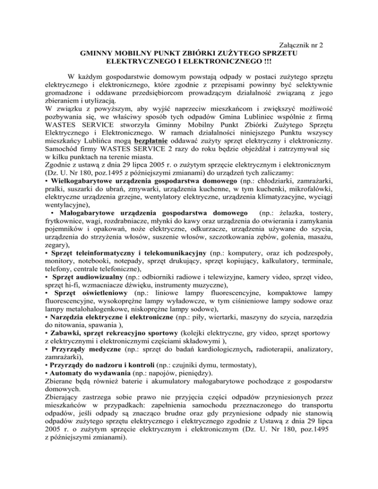 Załącznik nr 2 GMINNY MOBILNY PUNKT ZBIÓRKI ZUŻYTEGO SPRZETU ELEKTRYCZNEGO I ELEKTRONICZNEGO !!! W każdym gospodarstwie domowym powstają odpady w postaci zużytego sprzętu elektrycznego i elektronicznego, które zgodnie z przepisami powinny być selektywnie gromadzone i oddawane przedsiębiorcom prowadzącym działalność związaną z jego zbieraniem i utylizacją. W związku z powyższym, aby wyjść naprzeciw mieszkańcom i zwiększyć możliwość pozbywania się, we właściwy sposób tych odpadów Gmina Lubliniec wspólnie z firmą WASTES SERVICE stworzyła Gminny Mobilny Punkt Zbiórki Zużytego Sprzętu Elektrycznego i Elektronicznego. W ramach działalności niniejszego Punktu wszyscy mieszkańcy Lublińca mogą bezpłatnie oddawać zużyty sprzęt elektryczny i elektroniczny. Samochód firmy WASTES SERVICE 2 razy do roku będzie objeżdżał i zatrzymywał się w kilku punktach na terenie miasta. Zgodnie z ustawą z dnia 29 lipca 2005 r. o zużytym sprzęcie elektrycznym i elektronicznym (Dz. U. Nr 180, poz.1495 z późniejszymi zmianami) do urządzeń tych zaliczamy: • Wielkogabarytowe urządzenia gospodarstwa domowego (np.: chłodziarki, zamrażarki, pralki, suszarki do ubrań, zmywarki, urządzenia kuchenne, w tym kuchenki, mikrofalówki, elektryczne urządzenia grzejne, wentylatory elektryczne, urządzenia klimatyzacyjne, wyciągi wentylacyjne), • Małogabarytowe urządzenia gospodarstwa domowego (np.: żelazka, tostery, frytkownice, wagi, rozdrabniacze, młynki do kawy oraz urządzenia do otwierania i zamykania pojemników i opakowań, noże elektryczne, odkurzacze, urządzenia używane do szycia, urządzenia do strzyżenia włosów, suszenie włosów, szczotkowania zębów, golenia, masażu, zegary), • Sprzęt teleinformatyczny i telekomunikacyjny (np.: komputery, oraz ich podzespoły, monitory, notebooki, notepady, sprzęt drukujący, sprzęt kopiujący, kalkulatory, terminale, telefony, centrale telefoniczne), • Sprzęt audiowizualny (np.: odbiorniki radiowe i telewizyjne, kamery video, sprzęt video, sprzęt hi-fi, wzmacniacze dźwięku, instrumenty muzyczne), • Sprzęt oświetleniowy (np.: liniowe lampy fluorescencyjne, kompaktowe lampy fluorescencyjne, wysokoprężne lampy wyładowcze, w tym ciśnieniowe lampy sodowe oraz lampy metalohalogenkowe, niskoprężne lampy sodowe), • Narzędzia elektryczne i elektroniczne (np.: piły, wiertarki, maszyny do szycia, narzędzia do nitowania, spawania ), • Zabawki, sprzęt rekreacyjno sportowy (kolejki elektryczne, gry video, sprzęt sportowy z elektrycznymi i elektronicznymi częściami składowymi ), • Przyrządy medyczne (np.: sprzęt do badań kardiologicznych, radioterapii, analizatory, zamrażarki), • Przyrządy do nadzoru i kontroli (np.: czujniki dymu, termostaty), • Automaty do wydawania (np.: napojów, pieniędzy). Zbierane będą również baterie i akumulatory małogabarytowe pochodzące z gospodarstw domowych. Zbierający zastrzega sobie prawo nie przyjęcia części odpadów przyniesionych przez mieszkańców w przypadkach: zapełnienia samochodu przeznaczonego do transportu odpadów, jeśli odpady są znacząco brudne oraz gdy przyniesione odpady nie stanowią odpadów zużytego sprzętu elektrycznego i elektrycznego zgodnie z Ustawą z dnia 29 lipca 2005 r. o zużytym sprzęcie elektrycznym i elektronicznym (Dz. U. Nr 180, poz.1495 z późniejszymi zmianami). Zbiórka odpadów w bieżącym roku odbędzie się 17 maja, 20 września, w następujących punktach miasta: 1. Skrzyżowanie ul. Skłodowskiej z ul. Wymyślacz w godzinach: od 900 do 1000 2. Przy ul. Oleskiej - przy nowym boisku w godzinach: od 1015 do 1115 3. Skrzyżowanie ul. Cisowej z ul. Jesionową w godzinach od 1130 do 1230 4. Skrzyżowanie ul. Piaskowej z ul. Biała Kolonia w godzinach od 1245 do 1345 5. Skrzyżowanie ul. Kokotek (naprzeciwko kościoła) w godzinach od 1400 do 1500 6. Przy wjeździe na stare targowisko od ul. Cebulskiego w godzinach: od 1515 do 1615 7. Przy ul. Stalmacha – parking przy stacji BP w godzinach: od 1615 do 1700