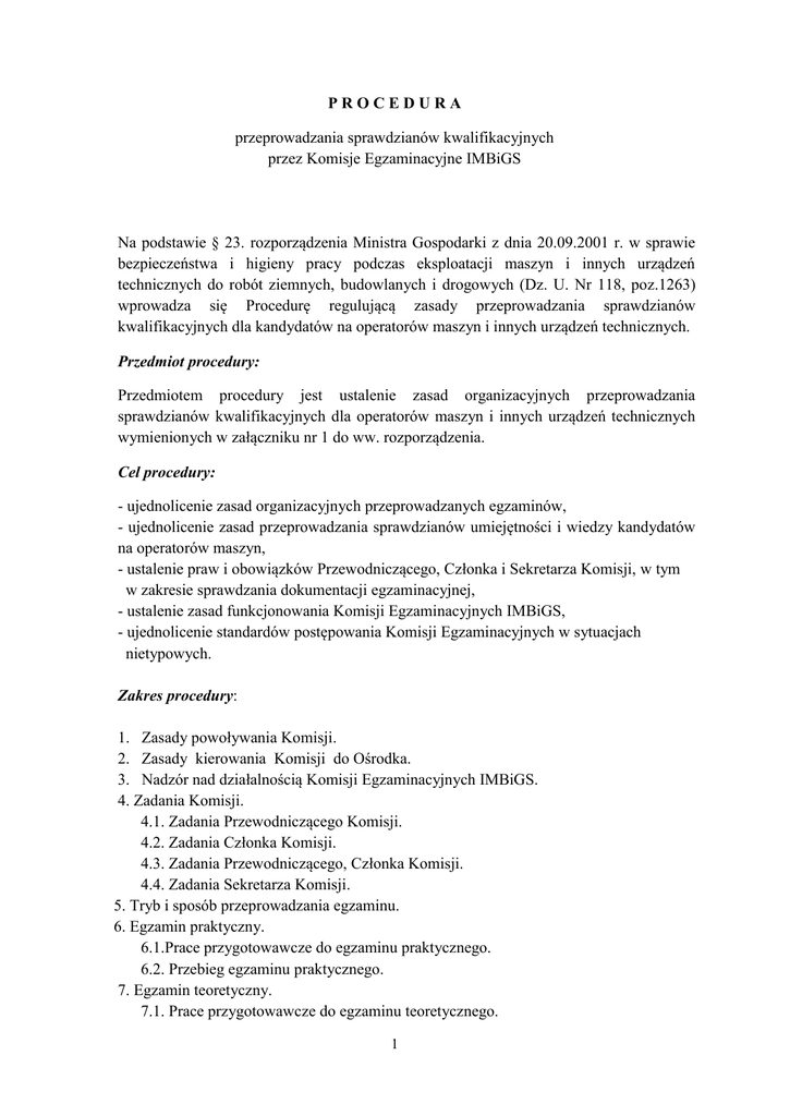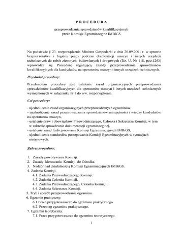 PROCEDURA przeprowadzania sprawdzianów kwalifikacyjnych przez Komisje Egzaminacyjne IMBiGS Na podstawie § 23. rozporządzenia Ministra Gospodarki z dnia 20.09.2001 r. w sprawie bezpieczeństwa i higieny pracy podczas eksploatacji maszyn i innych urządzeń technicznych do robót ziemnych, budowlanych i drogowych (Dz. U. Nr 118, poz.1263) wprowadza się Procedurę regulującą zasady przeprowadzania sprawdzianów kwalifikacyjnych dla kandydatów na operatorów maszyn i innych urządzeń technicznych. Przedmiot procedury: Przedmiotem procedury jest ustalenie zasad organizacyjnych przeprowadzania sprawdzianów kwalifikacyjnych dla operatorów maszyn i innych urządzeń technicznych wymienionych w załączniku nr 1 do ww. rozporządzenia. Cel procedury: - ujednolicenie zasad organizacyjnych przeprowadzanych egzaminów, - ujednolicenie zasad przeprowadzania sprawdzianów umiejętności i wiedzy kandydatów na operatorów maszyn, - ustalenie praw i obowiązków Przewodniczącego, Członka i Sekretarza Komisji, w tym w zakresie sprawdzania dokumentacji egzaminacyjnej, - ustalenie zasad funkcjonowania Komisji Egzaminacyjnych IMBiGS, - ujednolicenie standardów postępowania Komisji Egzaminacyjnych w sytuacjach nietypowych. Zakres procedury: 1. Zasady powoływania Komisji. 2. Zasady kierowania Komisji do Ośrodka. 3. Nadzór nad działalnością Komisji Egzaminacyjnych IMBiGS. 4. Zadania Komisji. 4.1. Zadania Przewodniczącego Komisji. 4.2. Zadania Członka Komisji. 4.3. Zadania Przewodniczącego, Członka Komisji. 4.4. Zadania Sekretarza Komisji. 5. Tryb i sposób przeprowadzania egzaminu. 6. Egzamin praktyczny. 6.1.Prace przygotowawcze do egzaminu praktycznego. 6.2. Przebieg egzaminu praktycznego. 7. Egzamin teoretyczny. 7.1. Prace przygotowawcze do egzaminu teoretycznego. 1 7.2. Zasady organizacyjne egzaminu teoretycznego. 7.3. Przebieg egzaminu teoretycznego. 8. Zakończenie egzaminu. 9. Zasady postępowania Komisji w sytuacjach nietypowych. WYKAZ ZNACZEŃ: a) rozporządzenie : rozporządzenie Ministra Gospodarki z dnia 20.09.2001 r. w sprawie bezpieczeństwa i higieny pracy podczas eksploatacji maszyn i innych urządzeń technicznych do robót ziemnych, budowlanych i drogowych (Dz. U. Nr 118, poz.1263), b) Centrum : Centrum Koordynacji Szkolenia Operatorów Maszyn Instytutu Mechanizacji Budownictwa i Górnictwa Skalnego, c) Komisja : Komisja Egzaminacyjna, d) Przewodniczący : Przewodniczący Komisji Egzaminacyjnej, e) Członek : Członek Komisji Egzaminacyjnej, f) Sekretarz : Sekretarz Komisji Egzaminacyjnej, g) Ośrodek : Podmiot szkolący – organizator sesji egzaminacyjnej, h) egzamin: sprawdzian kwalifikacyjny Terminy i definicje. a) Egzamin - jest formą oceny poziomu opanowania wiedzy i umiejętności nabytych przez osoby, które ukończyły szkolenie z zakresu bezpiecznej obsługi i eksploatacji maszyn danej specjalności, zgodnie z obowiązującymi programami nauczania. b) Program nauczania – to szczegółowy zbiór treści kształcenia, opracowany na podstawie rozporządzenia Ministra Gospodarki z dnia 20.09.2001 r. określony w § 24, uwzględniający wymagania kwalifikacyjne dla zawodu operatora maszyn roboczych określonej specjalności. Program ten zawiera plan nauczania, w którym treści podzielono na przedmioty dostosowane do wymagań edukacyjnych oraz przewidziano niezbędny wymiar czasu do ich realizacji. c) Egzamin praktyczny – jest procesem w czasie którego dokonuje się oceny poziomu opanowania umiejętności niezbędnych do wykonywania zawodu operatora, ujętych w opracowanych przez Instytut programach nauczania. d) Egzamin teoretyczny - jest formą oceny poziomu opanowania wiedzy z zakresu bezpiecznej obsługi i eksploatacji maszyn, ujętej w opracowanych przez Instytut programach nauczania. 2 e) Komisja Egzaminacyjna – to zespół specjalistów powołany przez Dyrektora Instytutu w celu przeprowadzenia sprawdzianu dla kandydatów na operatorów maszyn, spełniający kryteria określone decyzją Dyrektora Instytutu Nr 12/2015 z dnia 17.08.2015 r. f) Wniosek o przeprowadzenie sprawdzianu - to dokument przygotowany zgodnie z formularzem, stanowiącym załącznik nr 3, zawierający m.in. dane osobowe kandydata, potwierdzenie odbytego szkolenia, orzeczenie lekarskie, oraz arkusz wyników wraz z decyzją Komisji Egzaminacyjnej. g) Zgłoszenie kursu – dokument potwierdzający planowane rozpoczęcie szkolenia, zawierający: miejsce realizacji zajęć teoretycznych i praktycznych, wykaz maszyn, wykaz kadry dydaktycznej, zakres tematyczny i liczbę uczestników planowanego szkolenia, czas trwania szkolenia oraz planowany termin egzaminu. h) Potwierdzenie uzyskania uprawnień - jest to wpis w Książce Operatora Maszyn Roboczych oraz Świadectwo potwierdzające uzyskanie uprawnień podpisane przez Przewodniczącego Komisji, zarejestrowane na wniosku o przeprowadzenie sprawdzianu jak również w protokole z egzaminu praktycznego i końcowego. i) Książka Operatora Maszyn Roboczych – to dokument uprawniający do wykonywania zawodu (wzór tego dokumentu stanowi załącznik nr 2 do rozporządzenia Ministra Gospodarki z dnia 20.09.2001 r., Dz. U. Nr 118, poz. 1263). 3 SCHEMAT PRZEPROWADZANIA SPRAWDZIANU (EGZAMINU) Powołanie Komisji Egzaminacyjnych (Dyrektor Instytutu) Organizacja sesji egzaminacyjnej (Podmiot) Egzamin praktyczny (Członek/Członkowie Komisji Egzaminacyjnej) Wynik negatywny z egzaminu praktycznego (powtórzenie egz. prakt.) Wynik pozytywny z egzaminu praktycznego Egzamin teoretyczny (Komisja Egzaminacyjna) Wynik pozytywny z egzaminu teoretycznego Wynik negatywny z egzaminu teoretycznego (powtórzenie egzaminu) Przygotowanie oraz wydanie uprawnień (Komisja Egzaminacyjna) Sporządzenie protokołu z egzaminu (Komisja Egzaminacyjna) Przekazanie protokołu i wniosków do Rejestru Operatorów IMBiGS (Komisja Egzaminacyjna) 4 1. ZASADY POWOŁYWANIA KOMISJI 1.1 Zasady powoływania osób do Komisji określa Zarządzenie Nr 7/2012, Dyrektora Instytutu z dnia 3