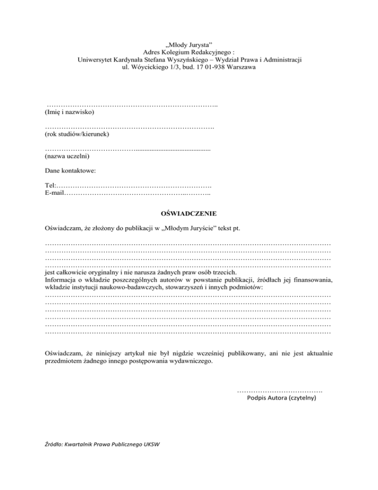 „Młody Jurysta” Adres Kolegium Redakcyjnego : Uniwersytet Kardynała Stefana Wyszyńskiego – Wydział Prawa i Administracji ul. Wóycickiego 1/3, bud. 17 01-938 Warszawa ……………………………………………………………….. (Imię i nazwisko) ………………………………………………………………. (rok studiów/kierunek) …………………………………........................................... (nazwa uczelni) Dane kontaktowe: Tel:…………………………………………………………. E-mail……………………………………………..……….. OŚWIADCZENIE Oświadczam, że złożony do publikacji w „Młodym Juryście” tekst pt. …………………………………………………………………………………………………………… …………………………………………………………………………………………………………… …………………………………………………………………………………………………………… …………………………………………………………………………………………………………… jest całkowicie oryginalny i nie narusza żadnych praw osób trzecich. Informacja o wkładzie poszczególnych autorów w powstanie publikacji, źródłach jej finansowania, wkładzie instytucji naukowo-badawczych, stowarzyszeń i innych podmiotów: …………………………………………………………………………………………………………… …………………………………………………………………………………………………………… …………………………………………………………………………………………………………… …………………………………………………………………………………………………………… …………………………………………………………………………………………………………… …………………………………………………………………………………………………………… Oświadczam, że niniejszy artykuł nie był nigdzie wcześniej publikowany, ani nie jest aktualnie przedmiotem żadnego innego postępowania wydawniczego. ………………………………. Podpis Autora (czytelny) Źródło: Kwartalnik Prawa Publicznego UKSW