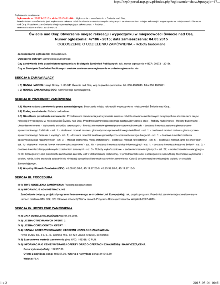 1z2 http://bzp0.portal.uzp.gov.pl/index.php?ogloszenie=show&pozycja=47... Ogłoszenie powiązane: Ogłoszenie nr 20272-2015 z dnia 2015-01-28 r. Ogłoszenie o zamówieniu - Świecie nad Osą Przedmiotem zamówienia jest wykonanie zakresu robót budowlano-montażowych związanych ze stworzeniem miejsc rekreacji i wypoczynku w miejscowości Świeciu nad Osą. Przedmiot zamówienia obejmuje następujący zakres prac: - Roboty... Termin składania ofert: 2015-02-16 Świecie nad Osą: Stworzenie miejsc rekreacji i wypoczynku w miejscowości Świecie nad Osą. Numer ogłoszenia: 47186 - 2015; data zamieszczenia: 04.03.2015 OGŁOSZENIE O UDZIELENIU ZAMÓWIENIA - Roboty budowlane Zamieszczanie ogłoszenia: obowiązkowe. Ogłoszenie dotyczy: zamówienia publicznego. Czy zamówienie było przedmiotem ogłoszenia w Biuletynie Zamówień Publicznych: tak, numer ogłoszenia w BZP: 20272 - 2015r. Czy w Biuletynie Zamówień Publicznych zostało zamieszczone ogłoszenie o zmianie ogłoszenia: nie. SEKCJA I: ZAMAWIAJĄCY I. 1) NAZWA I ADRES: Urząd Gminy, 1, 86-341 Świecie nad Osą, woj. kujawsko-pomorskie, tel. 056 4661613, faks 056 4661621. I. 2) RODZAJ ZAMAWIAJĄCEGO: Administracja samorządowa. SEKCJA II: PRZEDMIOT ZAMÓWIENIA II.1) Nazwa nadana zamówieniu przez zamawiającego: Stworzenie miejsc rekreacji i wypoczynku w miejscowości Świecie nad Osą.. II.2) Rodzaj zamówienia: Roboty budowlane. II.3) Określenie przedmiotu zamówienia: Przedmiotem zamówienia jest wykonanie zakresu robót budowlano-montażowych związanych ze stworzeniem miejsc rekreacji i wypoczynku w miejscowości Świeciu nad Osą. Przedmiot zamówienia obejmuje następujący zakres prac: - Roboty rozbiórkowe - Roboty budowlane: Utwardzenie terenu; - Wykonanie schodów terenowych; - Montaż elementów gimnastyczno-sprawnościowych: - dostawa i montaż zestawu gimnastycznosprawnościowego /orbitrek/ - szt. 1; - dostawa i montaż zestawu gimnastyczno-sprawnościowego /wioślarz/ - szt. 1; - dostawa i montaż zestawu gimnastycznosprawnościowego /krzesło + wyciąg/ - szt. 1; - dostawa i montaż zestawu gimnastyczno-sprawnościowego /biegacz/ - szt. 1; - dostawa i montaż zestawu sprawnościowego /szachownica/ - szt. 3; - Montaż elementów małej architektury: - dostawa i montaż /ławostołów/ - szt. 5; - dostawa i montaż /grila betonowego/ szt. 1; - dostawa i montaż /ławek metalowych z oparciem/ - szt. 10; - dostawa i montaż /tablicy informacyjnej/ - szt. 1; - dostawa i montaż /koszy na śmieci/ - szt. 2; dostawa i montaż /lamp parkowych z zasilaniem solarnym/ - szt. 3 - Roboty wykończeniowe: - sadzenie krzewów iglastych - szt. 22; - montaż kanału instalacyjnego m 28; Szczegółowy opis przedmiotu zamówienia zawarty jest w dokumentacji technicznej, w przedmiarach robót i szczegółowej specyfikacji technicznej wykonania i odbioru robót, które stanowią załączniki do niniejszej specyfikacji istotnych warunków zamówienia. Całość dokumentacji technicznej do wglądu w siedzibie Zamawiającego.. II.4) Wspólny Słownik Zamówień (CPV): 45.00.00.00-7, 45.11.27.23-9, 45.23.32.20-7, 45.11.27.10-5. SEKCJA III: PROCEDURA III.1) TRYB UDZIELENIA ZAMÓWIENIA: Przetarg nieograniczony III.2) INFORMACJE ADMINISTRACYJNE Zamówienie dotyczy projektu/programu finansowanego ze środków Unii Europejskiej: tak, projekt/program: Przedmiot zamówienia jest realizowany w ramach działania 313, 322, 323 /Odnowa i Rozwój Wsi/ w ramach Programu Rozwoju Obszarów Wiejskich 2007-2013.. SEKCJA IV: UDZIELENIE ZAMÓWIENIA IV.1) DATA UDZIELENIA ZAMÓWIENIA: 04.03.2015. IV.2) LICZBA OTRZYMANYCH OFERT: 2. IV.3) LICZBA ODRZUCONYCH OFERT: 1. IV.4) NAZWA I ADRES WYKONAWCY, KTÓREMU UDZIELONO ZAMÓWIENIA: Firma BUILD Sp. z o. o., ul. Szeroka 15B, 83-424 Lipusz, kraj/woj. pomorskie. IV.5) Szacunkowa wartość zamówienia (bez VAT): 156388,10 PLN. IV.6) INFORMACJA O CENIE WYBRANEJ OFERTY ORAZ O OFERTACH Z NAJNIŻSZĄ I NAJWYŻSZĄ CENĄ Cena wybranej oferty: 192357,36 Oferta z najniższą ceną: 192357,36 / Oferta z najwyższą ceną: 214942,50 Waluta: PLN. 2015-03-04 10:51 2z2 http://bzp0.portal.uzp.gov.pl/index.php?ogloszenie=show&pozycja=47... 2015-03-04 10:51