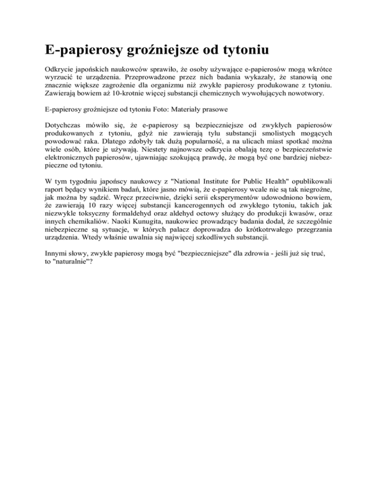 E-papierosy groźniejsze od tytoniu Odkrycie japońskich naukowców sprawiło, że osoby używające e-papierosów mogą wkrótce wyrzucić te urządzenia. Przeprowadzone przez nich badania wykazały, że stanowią one znacznie większe zagrożenie dla organizmu niż zwykłe papierosy produkowane z tytoniu. Zawierają bowiem aż 10-krotnie więcej substancji chemicznych wywołujących nowotwory. E-papierosy groźniejsze od tytoniu Foto: Materiały prasowe Dotychczas mówiło się, że e-papierosy są bezpieczniejsze od zwykłych papierosów produkowanych z tytoniu, gdyż nie zawierają tylu substancji smolistych mogących powodować raka. Dlatego zdobyły tak dużą popularność, a na ulicach miast spotkać można wiele osób, które je używają. Niestety najnowsze odkrycia obalają tezę o bezpieczeństwie elektronicznych papierosów, ujawniając szokującą prawdę, że mogą być one bardziej niebezpieczne od tytoniu. W tym tygodniu japońscy naukowcy z "National Institute for Public Health" opublikowali raport będący wynikiem badań, które jasno mówią, że e-papierosy wcale nie są tak niegroźne, jak można by sądzić. Wręcz przeciwnie, dzięki serii eksperymentów udowodniono bowiem, że zawierają 10 razy więcej substancji kancerogennych od zwykłego tytoniu, takich jak niezwykle toksyczny formaldehyd oraz aldehyd octowy służący do produkcji kwasów, oraz innych chemikaliów. Naoki Kunugita, naukowiec prowadzący badania dodał, że szczególnie niebezpieczne są sytuacje, w których palacz doprowadza do krótkotrwałego przegrzania urządzenia. Wtedy właśnie uwalnia się najwięcej szkodliwych substancji. Innymi słowy, zwykłe papierosy mogą być "bezpieczniejsze" dla zdrowia - jeśli już się truć, to "naturalnie"?