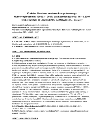Kraków: Dostawa zestawu komputerowego Numer ogłoszenia: 195093 - 2007; data zamieszczenia: 15.10.2007 OGŁOSZENIE O UDZIELENIU ZAMÓWIENIA - dostawy Zamieszczanie ogłoszenia: nieobowiązkowe. Ogłoszenie dotyczy: zamówienia publicznego. Czy zamówienie było przedmiotem ogłoszenia w Biuletynie Zamówień Publicznych: Tak, numer ogłoszenia w BZP: 148625 - 2007. SEKCJA I: ZAMAWIAJĄCY I. 1) NAZWA I ADRES: Instytut Zaawansowanych Technologii Wytwarzania, ul. Wrocławska, 30-011 Kraków, woj. małopolskie, tel. (012) 6339192, fax (012) 6339490. I. 2) RODZAJ ZAMAWIAJĄCEGO: Inny: Jednostka badawczo-rozwojowa. SEKCJA II: PRZEDMIOT ZAMÓWIENIA II.1) OPIS II.1.1) Nazwa nadana zamówieniu przez zamawiającego: Dostawa zestawu komputerowego. II.1.2) Rodzaj zamówienia: dostawy. II.1.3) Określenie przedmiotu zamówienia: Zestaw komputerowy, w skład którego wchodzą: 1. Komputer przeznaczony do prac biurowych (standardowe aplikacje), zbieranie informacji z internetu, pracy sieciowej, obsługi kserografu cyfrowego drukarki, składający się z następujących elementów w konfiguracji jak niżej: - płyta główna z kontrolerami Serial ATA, ze złączami: co najmniej 2x PCI i co najmniej 2x PCI-Express, w tym co najmniej jeden slot x16, z portami zewnętrznymi: co najmniej 2x PS 2 i co najmniej 4x USB 2.0, - procesor: klasy x86 o wydajności ocenionej na co najmniej 200 pkt uzyskanych w teście SYSmark® 2004 Overall Office Productivity, - wentylator procesora: zapewniający optymalne chłodzenie procesora w warunkach pracy biurowej, - pamięć RAM: co najmniej 1GB, - dysk twardy: nie mniej niż 250GB, Serial ATA, - karta graficzna: co najmniej 256MB, co najmniej 128 bit, PCI-Express, - karta sieciowa: zintegrowana z płytą główną lub instalowana na slocie PCI, o transferze co najmniej 100Mb na s, - napęd optyczny: nagrywarka DVD DL + - R,RW, napęd dyskietek: 3,5 cali o pojemności 1,44MB, - obudowa: typu stojącego, w standardzie ATX, z zasilaczem o mocy minimum 400W, - klawiatura: w układzie QWERTY z typową liczbą klawiszy, w standardzie PS/2 lub USB, - mysz: optyczna, przewodowa, w standardzie PS 2 lub USB, z 2 przyciskami i 1 rolką przewijania, - system operacyjny: Windows VISTA lub Windows XP - instalacja, nośnik, licencja 2. Monitor: typu LCD, 19 cali umożliwiający pracę z rozdzielczością 1280x1024, spełniający wymagania normy TCO 03, o czasie reakcji do 8ms, wielkości plamki poniżej 0,3mm, kontraście nie mniejszym niż 700:1. II.1.4) Wspólny Słownik Zamówień (CPV): 33.23.12.00-9, 30.23.32.11-3, 30.23.21.20-1, 30.24.15.00-5, 30.23.12.50-4. II.1.5) Całkowita końcowa wartość zamówienia (bez VAT) obejmująca wszystkie zamówienia i części: 2000 PLN. SEKCJA IV: PROCEDURA IV.1) TRYB UDZIELENIA ZAMÓWIENIA: przetarg nieograniczony IV.2) INFORMACJE ADMINISTRACYJNE • Zamówienie dotyczy projektu/programu finansowanego ze środków Unii Europejskiej: Nie SEKCJA V: UDZIELENIE ZAMÓWIENIA V.1) DATA UDZIELENIA ZAMÓWIENIA: 28.09.2007. V.2) LICZBA OTRZYMANYCH OFERT: 2. V.3) NAZWA I ADRES WYKONAWCY, KTÓREMU UDZIELONO ZAMÓWIENIA: • ELEKTRONIKA Spółka z o.o., ul. Józefa 26, 31-056 Kraków, kraj/woj. małopolskie. V.4) INFORMACJA O CENIE WYBRANEJ OFERTY ORAZ O NIE PODLEGAJĄCYCH ODRZUCENIU OFERTACH Z NAJNIŻSZĄ I NAJWYŻSZĄ CENĄ (bez VAT) • • • Cena wybranej oferty: 2000.00 Oferta z najniższą ceną: 2000.00 / oferta z najwyższą ceną: 2000.00 Waluta: PLN.
