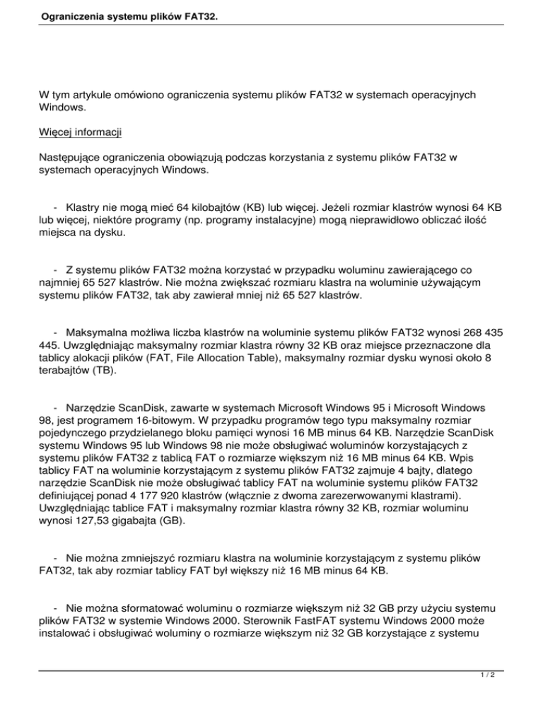 Ograniczenia systemu plików FAT32. W tym artykule omówiono ograniczenia systemu plików FAT32 w systemach operacyjnych Windows. Więcej informacji Następujące ograniczenia obowiązują podczas korzystania z systemu plików FAT32 w systemach operacyjnych Windows. - Klastry nie mogą mieć 64 kilobajtów (KB) lub więcej. Jeżeli rozmiar klastrów wynosi 64 KB lub więcej, niektóre programy (np. programy instalacyjne) mogą nieprawidłowo obliczać ilość miejsca na dysku. - Z systemu plików FAT32 można korzystać w przypadku woluminu zawierającego co najmniej 65 527 klastrów. Nie można zwiększać rozmiaru klastra na woluminie używającym systemu plików FAT32, tak aby zawierał mniej niż 65 527 klastrów. - Maksymalna możliwa liczba klastrów na woluminie systemu plików FAT32 wynosi 268 435 445. Uwzględniając maksymalny rozmiar klastra równy 32 KB oraz miejsce przeznaczone dla tablicy alokacji plików (FAT, File Allocation Table), maksymalny rozmiar dysku wynosi około 8 terabajtów (TB). - Narzędzie ScanDisk, zawarte w systemach Microsoft Windows 95 i Microsoft Windows 98, jest programem 16-bitowym. W przypadku programów tego typu maksymalny rozmiar pojedynczego przydzielanego bloku pamięci wynosi 16 MB minus 64 KB. Narzędzie ScanDisk systemu Windows 95 lub Windows 98 nie może obsługiwać woluminów korzystających z systemu plików FAT32 z tablicą FAT o rozmiarze większym niż 16 MB minus 64 KB. Wpis tablicy FAT na woluminie korzystającym z systemu plików FAT32 zajmuje 4 bajty, dlatego narzędzie ScanDisk nie może obsługiwać tablicy FAT na woluminie systemu plików FAT32 definiującej ponad 4 177 920 klastrów (włącznie z dwoma zarezerwowanymi klastrami). Uwzględniając tablice FAT i maksymalny rozmiar klastra równy 32 KB, rozmiar woluminu wynosi 127,53 gigabajta (GB). - Nie można zmniejszyć rozmiaru klastra na woluminie korzystającym z systemu plików FAT32, tak aby rozmiar tablicy FAT był większy niż 16 MB minus 64 KB. - Nie można sformatować woluminu o rozmiarze większym niż 32 GB przy użyciu systemu plików FAT32 w systemie Windows 2000. Sterownik FastFAT systemu Windows 2000 może instalować i obsługiwać woluminy o rozmiarze większym niż 32 GB korzystające z systemu 1/2 Ograniczenia systemu plików FAT32. plików FAT32 (z pewnymi innymi ograniczeniami), ale nie można utworzyć takiego woluminu przy użyciu narzędzia Format. Zachowanie takie jest zgodne z projektem programu. Jeżeli konieczne jest utworzenie woluminu, którego rozmiar przekracza 32 GB, należy użyć systemu plików NTFS. UWAGA: Próba sformatowania partycji FAT32 większej niż 32 GB kończy się niepowodzeniem przed zakończeniem procesu i zgłaszany jest następujący błąd: Menedżer dysków logicznych: Rozmiar woluminu jest za duży. Informacje zawarte w tym artykule dotyczą: • Microsoft Windows 2000 Server • Microsoft Windows 2000 Professional Edition • Microsoft Windows Millennium Edition • Microsoft Windows 98 Standard Edition Źródło: Microsoft 2/2