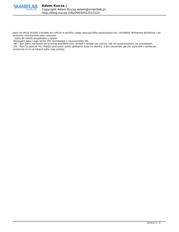 Adam Kucza | Copyright Adam Kucza [email protected] http://blog.kucza.info/2003/01/21/112/ Jasiu na lekcji strzelil z torebki po cukrze w wyniku czego nauczycielka wystraszyla sie i zemdlala. Wezwano dyrektora i po ocuceniu nauczycielki Jasiu uslyszal: - Jutro do szkoly przyjdziesz z ojcem. Nazajutrz Jasiu i jego ojciec (O) rozmawiaja z nauczycielka (N). (N) - Syn pana zachowal sie wczoraj skandalicznie, strzelil z torebki po cukrze, tak sie wystraszylam, ze zemdlalam. (O) - Pani to jeszcze nic! Kiedys posuwam sobie spokojnie koze za oborka, a ten szczeniak jak nie wystrzeli z worka po cemencie to mi w rekach tylko rogi zostaly. strona 1 / 1