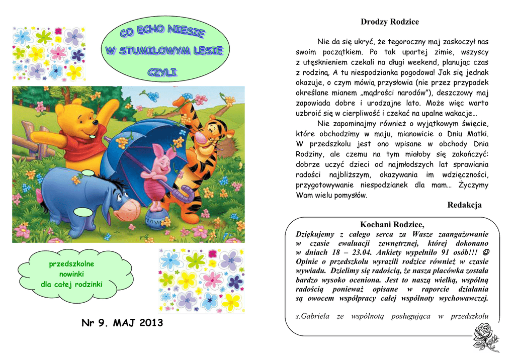 Drodzy Rodzice Nie da się ukryć, że tegoroczny maj zaskoczył nas swoim początkiem. Po tak upartej zimie, wszyscy z utęsknieniem czekali na długi weekend, planując czas z rodziną. A tu niespodzianka pogodowa! Jak się jednak okazuje, o czym mówią przysłowia (nie przez przypadek określane mianem „mądrości narodów”), deszczowy maj zapowiada dobre i urodzajne lato. Może więc warto uzbroić się w cierpliwość i czekać na upalne wakacje… Nie zapominajmy również o wyjątkowym święcie, które obchodzimy w maju, mianowicie o Dniu Matki. W przedszkolu jest ono wpisane w obchody Dnia Rodziny, ale czemu na tym miałoby się zakończyć: dobrze uczyć dzieci od najmłodszych lat sprawiania radości najbliższym, okazywania im wdzięczności, przygotowywanie niespodzianek dla mam… Życzymy Wam wielu pomysłów. Redakcja Kochani Rodzice, przedszkolne nowinki dla całej rodzinki Nr 9. MAJ 2013 Dziękujemy z całego serca za Wasze zaangażowanie w czasie ewaluacji zewnętrznej, której dokonano w dniach 18 – 23.04. Ankiety wypełniło 91 osób!!! ☺ Opinie o przedszkolu wyrazili rodzice również w czasie wywiadu. Dzielimy się radością, że nasza placówka została bardzo wysoko oceniona. Jest to naszą wielką, wspólną radością ponieważ opisane w raporcie działania są owocem współpracy całej wspólnoty wychowawczej. s.Gabriela ze wspólnotą posługująca w przedszkolu Ogłoszenia przedszkolne • • W dniach od 8 – 10.05.13 od g. 15.00 – 17.00 zapraszamy na Dni Otwartych Drzwi. Będzie to czas zapoznania rodziców i dzieci z przedszkolem (salą oraz placem zabaw w ogrodzie). Wejście do sal tylko w zmiennym obuwiu! 9.05.13 o godz. 15.00 odbędzie się ZEBRANIE wszystkich rodziców dzieci przyjętych do przedszkola W czasie zebrania: - informacje na temat przygotowania dziecka funkcjonowania przedszkola. - Troska o dar wiary – konferencja ks. dr Tomasz Knop W CZASIE EUCHARYSTII NASTĄPI ODNOWIENIE PRZYRZECZEŃ MAŁŻEŃSKICH ORAZ UCZCZENIE RELIKWII BŁ. FRANCISZKI SIEDLISKIEJ Mile widziane stroje ślubne, bukiety, okolicznościowe dekoracje samochodów…☺ W dniach 13 – 20.05 prosimy przynieść do przedszkola zdjęcie ślubne naklejone na kartkę A4. Będziemy tworzyć grupowy album ślubny, który złożymy w darze w czasie Mszy Św. oraz Plan naszego świętowania: 10.00 – EUCHARYSTIA W INTENCJI RODZIN, ************************************************************* W maju planujemy następujące wycieczki: „Przyjaciele Królika” (4 – latki) 7. 05. (wt) wyjeżdżają do Kopalni Srebra w Tarnowskich Górach „Przyjaciele Tygryska” (5 – latki) 9.05. (czw) wyjeżdżają do Ogrodzieńca ************************************************************* SERDECZNIE ZAPRASZAMY WSZYSTKIE RODZINY NA ŚWIĘTO RODZINY WSPÓLNE ŚWIĘTOWANIE BĘDZIE MIAŁO MIEJSCE W DNIU 25 MAJA (SOBOTA) I ROZPOCZNIE SIĘ O GODZ. 10.00 EUCHARYSTIĄ W INTENCJI NASZYCH RODZIN CELEBROWANĄ W BAZYLICE ARCHIKATEDRALNEJ ŚW. RODZINY ŻYCZENIA DZIECI Z OKAZJI DNIA MAMY I TATY PIKNIK W OGRODZIE PRZEDSZKOLNYM - Zabawy, tańce, konkursy, dmuchaniec, loteria fantowa… - BAJKA W WYKONANIU RODZICÓW Z GRUPY „PRZYJACIÓŁ KŁAPOUCHEGO” - Grill oraz inne atrakcje kulinarne... Prosimy o przyniesienie ciasta, słodyczy, owoców i napojów na wspólny stół. Przedszkole przygotowuje wszystko do grillowania. Przyjaciele Kłapouchego w maju poznają: • • • • • • • • Literaturę dziecięcą Bohaterów i treść najbardziej popularnych bajek Teatrzyk kukiełkowy Wybrane instrumenty muzyczne (wygląd, nazwa i wydawany dźwięk) Jak wykonać niekonwencjonalny instrument muzyczny z dostępnych materiałów Wartość życia rodzinnego Sposoby sprawiania radości swoim najbliższym (Mamie i Tacie) Liczenie w zakresie 4 Wiersz: Gdy świerszczyk śpiewa, w duszy mi gra, gdy wiatr powiewa, śpiewam la lala, gdy lasek szumi, słucham, bo tam najwięcej dźwięków na świecie mam. Piosenka: Pada deszczyk pada deszczyk Wieje, wieje wiatr /2x Błyskawica, grzmot A na niebie kolorowa tęcza/2x Przyjaciele Kubusia Puchatka w maju poznają - łąkowe kwiaty i owady fazy rozwoju motyla piosenkę i wiersz dla mamy i taty środki lokomocji ( lądowe, morskie, powietrzne). Piosenka Piosenka dla mamy i taty Dla mamy kwiaty kwitną na łące, dla mamy wieje ciepły wiatr. Dla mamy niebo jest tak błękitne, dla mamy śmieje się cały świat. Ref. La, la, la, la....................... Dla taty kwiaty kwitną na łące, dla taty wieje ciepły wiatr. Dla taty niebo jest tak błękitne, dla taty śmieje się cały świat. Wiersz Dla Mamy i Taty Mamusiu kochana, grzeczna będę dziś od rana. Niech słoneczko Ci zaświeci, radość wielką sprawią dzieci. Abyś była uśmiechnięta bo dziś Mamo - Twoje święto. My o Tatę także dbamy, nawet gdy Go nie słuchamy. Lecz od dzisiaj przyrzekamy nie zasmucać Taty, Mamy. I mieć buzię uśmiechniętą W takim dniu - jak Wasze święto. Przyjaciele Królika w maju • Tłumaczą nazwę charakterystycznych dla regionu Śląska nazw osób i przedmiotów/ sztygar, sztolnia, pyrlik, żelazko/. • Wymieniają kilka elementów, z których zbudowana jest kopalnia. • Mówią o ciężkiej i odpowiedzialnej pracy górnika • Przedstawiają w formie plastycznej ilustracje na podstawie opowiadania nauczyciela. • Opowiadają kilka legend z regionu śląskiego. • Liczą i porównują poprawnie elementy dwóch zbiorów. • Rozpoznają zawody związane ze służbami mundurowymi. • Określają rolę straży, policji i pogotowia w naszym życiu. • Znają podstawowe numery telefonów: 112, 999,998,997. • Określają podobieństwa i różnice w umundurowaniu wymienionych zawodów. • Znają wartość pracy w życiu człowieka a szczególnie pracy straży, policji i pogotowia dla ratowania ludzi. • Wyróżniają elementy zbioru ze względu na jedną cechę. W maju Przyjaciele Tygryska poznają - nazwy kwiatów, które kwitną w ogrodzie przeds
