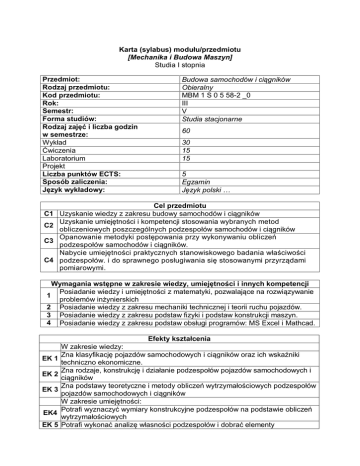 Karta (sylabus) modułu/przedmiotu [Mechanika i Budowa Maszyn] Studia I stopnia Przedmiot: Rodzaj przedmiotu: Kod przedmiotu: Rok: Semestr: Forma studiów: Rodzaj zajęć i liczba godzin w semestrze: Wykład Ćwiczenia Laboratorium Projekt Liczba punktów ECTS: Sposób zaliczenia: Język wykładowy: C1 C2 C3 C4 Budowa samochodów i ciągników Obieralny MBM 1 S 0 5 58-2 _0 III V Studia stacjonarne 60 30 15 15 5 Egzamin Język polski … Cel przedmiotu Uzyskanie wiedzy z zakresu budowy samochodów i ciągników Uzyskanie umiejętności i kompetencji stosowania wybranych metod obliczeniowych poszczególnych podzespołów samochodów i ciągników Opanowanie metodyki postępowania przy wykonywaniu obliczeń podzespołów samochodów i ciągników. Nabycie umiejętności praktycznych stanowiskowego badania właściwości podzespołów. i do sprawnego posługiwania się stosowanymi przyrządami pomiarowymi. Wymagania wstępne w zakresie wiedzy, umiejętności i innych kompetencji Posiadanie wiedzy i umiejętności z matematyki, pozwalające na rozwiązywanie 1 problemów inżynierskich 2 Posiadanie wiedzy z zakresu mechaniki technicznej i teorii ruchu pojazdów. 3 Posiadanie wiedzy z zakresu podstaw fizyki i podstaw konstrukcji maszyn. 4 Posiadanie wiedzy z zakresu podstaw obsługi programów: MS Excel i Mathcad. EK 1 EK 2 EK 3 EK4 EK 5 Efekty kształcenia W zakresie wiedzy: Zna klasyfikację pojazdów samochodowych i ciągników oraz ich wskaźniki techniczno ekonomiczne. Zna rodzaje, konstrukcję i działanie podzespołów pojazdów samochodowych i ciągników Zna podstawy teoretyczne i metody obliczeń wytrzymałościowych podzespołów pojazdów samochodowych i ciągników W zakresie umiejętności: Potrafi wyznaczyć wymiary konstrukcyjne podzespołów na podstawie obliczeń wytrzymałościowych Potrafi wykonać analizę własności podzespołów i dobrać elementy znormalizowane Potrafi wykonać pomiary parametrów konstrukcyjnych podzespołów pojazdów EK 6 samochodowych W zakresie kompetencji społecznych: Jest odpowiedzialny za rzetelność uzyskanych wyników swoich prac i ich EK7 interpretację W1 W2 W3 W4 W5 W6 W7 W8 W9 W10 W11 W12 ĆW1 ĆW2 Treści programowe przedmiotu Forma zajęć – wykłady Treści programowe Klasyfikacja pojazdów samochodowych. Klasyfikacja samochodów. Klasyfikacja ciągników Ogólna struktura pojazdu samochodowego. Wskaźniki technicznoekonomiczne samochodu. Kryteria oceny jakości pojazdu. Budowa sprzęgieł głównych pojazdów. Sprzęgła główne samochodowe i ciągnikowe, metody doboru, obliczanie trwałości sprzęgieł. Sprzęgła odśrodkowe. Mechaniczne skrzynki przekładniowe. Skrzynki przekładniowe dwu- i trójwałkowe. Schematy kinematyczne skrzynek biegów. Budowa skrzynek samochodów osobowych i ciężarowych. Synchronizacja przełożeń. Synchronizatory – budowa, działanie, obliczanie. Przekładnie planetarne. budowa i działanie przekładni planetarnej. Obliczanie przełożeń. Sprzęgła i przekładnie hydrokinetyczne. Zespoły hydromechaniczne pojazdów. Przekładnie bezstopniowe CVT. Skrzynki przekładniowe ciągników. Wały napędowe i przeguby. Budowa wału napędowego. Kinematyka i dynamika przegubu krzyżakowego. Obliczanie wałów napędowych. Rodzaje i budowa przegubów pędnych. Przeguby homokinetyczne. Budowa mostu napędowego. Rodzaje i obliczanie przekładni głównych. Rodzaje i obliczanie mechanizmów różnicowych. Obliczanie półosi napędowych. Międzyosiowe mechanizmy różnicowe. Zawieszenie pojazdu samochodowego. Elementy nośne pojazdu. Zawieszenie samochodu – klasyfikacja, kinematyka, budowa. Obliczanie elementów sprężystych i amortyzatorów. Układy kierownicze pojazdów. Rodzaje i budowa układów kierowniczych. Obliczanie. Działanie układu kierowniczego. Układy hamulcowe pojazdów. Rodzaje, budowa i skuteczność działania układów hamulcowych. Obliczanie hamulców tarczowych i bębnowych. Układy wspomagające i przeciwpoślizgowe hamulców. Układy korekcji sił hamowania. Forma zajęć – ćwiczenia Treści programowe Zajęcia wprowadzające. Omówienie przebiegu zajęć projektowych. Przydział tematów do prac obliczeniowych indywidualnych (4 z 7 możliwych). Obliczanie sprzęgła głównego pojazdu samochodowego. Omówienie ĆW3 ĆW4 ĆW5 ĆW6 ĆW7 ĆW8 ĆW9 ĆW10 ĆW11 ĆW12 ĆW13 L1 L2 L3 L4 L5 L6 L7 L8 zakresu obliczeń. Przykłady zadań. Obliczanie skrzyni przekładniowej o osiach stałych. Omówienie zakresu obliczeń. Schematy skrzyń biegów. Obliczanie przekładni planetarnej. Przykłady zadań. Obliczanie wału napędowego. Omówienie zakresu obliczeń. Przykłady zadań. Kolokwium 1. Odbiór i ocena indywidualnych prac obliczeniowych. Obliczanie mostu napędowego. Omówienie zakresu obliczeń. Przykłady zadań. Obliczanie zawieszenia samochodu. Omówienie zakresu obliczeń. Przykłady zadań. Obliczanie układu kierowniczego. Omówienie zakresu obliczeń. Przykłady zadań. Kolokwium 2. Odbiór i ocena indywidualnych prac obliczeniowych. Obliczanie układu hamulcowego. Omówienie zakresu obliczeń. Przykłady zadań. Obliczanie korektora sił hamowania. Omówienie zakresu obliczeń. Przykłady zadań. Kolokwium 3. Odbiór i ocena indywidualnych prac obliczeniowych. Zajęcia zaliczeniowe. Odbiór i ocena indywidualnych prac obliczeniowych. Ewentualne kolokwium poprawkowe. Forma zajęć – laboratoria Treści programowe Zajęcia wprowadzające. Omówienie przebiegu zajęć laboratoryjnych. Szkolenie BHP. Wyznaczanie charakterystyki kinematycznej wału przegubowego. Statyczne badanie opon samochodowych. Charakterystyka sztywności opony. Naciski na nawierzchnię jezdni. Wyznaczenie oporów wewnętrznych skrzyni biegów. Określenie charakterystyki układu uruchamiającego hamulce ze wspomaganiem. Wykres sił hamowania. Badanie parametrów zawieszenia pojazdu. Wyznaczanie naprężeń i sztywności resoru piórowego. Badanie sprawności przekładni kierowniczej. Charakterystyka p