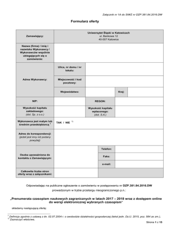 Załącznik nr 1A do SIWZ nr DZP.381.84.2016.DW Formularz oferty Uniwersytet Śląski w Katowicach ul. Bankowa 12 40-007 Katowice Zamawiający: Nazwa (firma) / imię i nazwisko Wykonawcy / Wykonawców wspólnie ubiegających się o zamówienie: Ulica, nr domu / nr lokalu: Miejscowość i kod pocztowy: Adres Wykonawcy: Województwo: Kraj: NIP: REGON: Wysokość kapitału zakładowego: (dot. Sp. z o.o.) Wysokość kapitału wpłaconego: (dot. S.A.) Wykonawca jest małym lub 1 średnim przedsiębiorcą TAK / NIE 1) Adres do korespondencji: (jeżeli jest inny niż podany powyżej) Telefon: Osoba upoważniona do kontaktu z Zamawiającym: Faks: e-mail: Całkowita liczba stron oferty wraz z załącznikami: Odpowiadając na publiczne ogłoszenie o zamówieniu w postępowaniu nr DZP.381.84.2016.DW prowadzonym w trybie przetargu nieograniczonego p.n.: „Prenumerata czasopism naukowych zagranicznych w latach 2017 – 2018 wraz z dostępem online do wersji elektronicznej wybranych czasopism” składamy następującą ofertę: 1 1) Definicja zgodnie z ustawą z dn. 02.07.2004 r. o swobodzie działalności gospodarczej (tekst jedn. Dz.U. 2015, poz. 584 ze zm.), Zaznaczyć właściwe, Strona 1 z 15 1. Oferujemy realizację przedmiotu zamówienia zgodnie z warunkami i na zasadach zawartych w Specyfikacji Istotnych Warunków Zamówienia, za cenę: 1) W przypadku Wykonawcy mającego siedzibę lub miejsce zamieszkania na terytorium RP - Wykonawca krajowy (jeśli nie dotyczy - wykreślić): ROK 2017 1.1 łącznie za kwotę netto za rok 2017: ...........................................................................................................................euro 1.2 po doliczeniu do ww. kwoty 8% (wersja print) oraz 23% (płatna wersja online) podatku VAT w wysokości: ..............................................................euro 1.3 cena prenumeraty za rok 2017 brutto wynosić będzie:............................................................euro ROK 2018 1.4 zwiększenie o 13 % (13% z poz. 1.3 z zastrzeżeniem, że wzrost cen o 13% dotyczy maksymalnie każdego tytułu z osobna) ……………………………………………….………………………………………………………………euro 1.5 cena prenumeraty za rok 2018 brutto wynosić będzie (suma poz. 1.3 i poz. 1.4): ………………………….…………euro w okresie obowiązywania umowy (2017-2018) 1.6 cena oferty brutto (suma poz. 1.3 i 1.5): ……………………………………………………euro (do porównania ofert) słownie:................................................................................................................................euro 2) Wykonawca zagraniczny: a) W przypadku Wykonawcy mającego siedzibę lub miejsce zamieszkania poza terytorium RP (Wykonawca zagraniczny) nieposiadającego oddziału na terenie RP (jeśli nie dotyczy - wykreślić): ROK 2017 1.1 łącznie za kwotę netto za rok 2017: ...........................................................................................................................euro oświadczamy, iż ww. kwota zostanie powiększona odpowiednio o 8% (wersja print czasopism) oraz o 23% (płatna wersja online czasopism) – wartości podatku VAT, wyłącznie w celu dokonania porównania i oceny złożonych ofert i wynosić będzie: 1.2 za rok 2017 :............................................................euro ROK 2018 1.3 zwiększenie o 13 % (13% z poz. 1.2 z zastrzeżeniem, że wzrost cen o 13% dotyczy maksymalnie każdego tytułu z osobna )……………………………………………….………………………………………euro 1.4 cena prenumeraty za rok 2018 wynosić będzie (suma poz. 1.2 i poz. 1.3): ………………………….…………euro w okresie obowiązywania umowy (2017-2018) 1.5 cena oferty (suma poz. 1.2 i 1.4): ………………………………………………………………euro (do porównania ofert) słownie:................................................................................................................................euro Strona 2 z 15 b) W przypadku Wykonawcy mającego siedzibę lub miejsce zamieszkania poza terytorium RP (Wykonawca zagraniczny) posiadającego oddział na terenie RP (jeśli nie dotyczy - wykreślić): ROK 2017 1.1 łącznie za kwotę netto za rok 2017: ...........................................................................................................................euro 1.2 po doliczeniu do ww. kwoty 8% (wersja print) oraz 23% (płatna wersja online) podatku VAT w wysokości: ..............................................................euro 1.3 cena prenumeraty za rok 2017 brutto wynosić będzie:............................................................euro ROK 2018 1.4 zwiększenie o 13 % (13% z poz. 1.3 z zastrzeżeniem, że wzrost cen o 13% dotyczy maksymalnie każdego tytułu z osobna )……………………………………………….………………………………………euro 1.5 cena prenumeraty za rok 2018 brutto wynosić będzie (suma poz. 1.3 i poz. 1.4): ………………………….…………euro w okresie obowiązywania umowy (2017-2018) 1.6 cena oferty brutto (suma poz. 1.3 i 1.5): ……………………………………………………euro (do porównania ofert) słownie:................................................................................................................................euro Wyżej podana cena stanowi cenę w rozumieniu art. 3 ust. 1 pkt 1 i ust. 2 ustawy z dnia 9 maja 2014 r. o informowaniu o cenach towarów i usług (Dz. U. poz. 915), a więc wartość wyrażoną w jednostkach pieniężnych, którą kupujący jest obowiązany zapłacić przedsiębiorcy za towar lub usługę. Zgodnie z przepisem art. 3 ust. 2 ustawy o informowaniu o cenach towarów i usług, w cenie uwzględnia się podatek od towarów i usług oraz podatek akcyzowy, jeżeli na podstawie odrębnych przepisów sprz