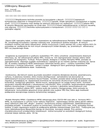 AutoRok.PL / DesignForum.PL USBrojony Blaupunkt Autor: AndrzejR Zmieniony 15.09.2006. Współczesna technika pozwala na korzystanie z danych zapisanych komputerowo właściwie w nieograniczony sposób. Dzięki specjalnym rozwiązaniom w każdej chwili możemy mieć dostęp do ważnych informacji czy ulubionych plików MP3. W sierpniu Blaupunkt wprowadza na rynek dwa nowe radioodtwarzacze, w których naczelną rolę odgrywa technika wykorzystywana w komputerach. (powiększ zdjęcie) Złącze USB i specjalny kabel, w które wyposażone są radioodtwarzacze Memphis MP66 i Casablanca MP 56, umożliwiają korzystanie z pamięci masowej oraz przenośnych dysków twardych. W nowych modelach możliwe jest także odtwarzanie plików muzycznych z karty pamięci SD, a dwa wejścia AUX-/In pozwalają na podłączenie do nich innych zewnętrznych źródeł dźwięku, np. przenośnych odtwarzaczy MP3 czy popularnego iPoda. Urządzenia są wyposażone w graficzny wyświetlacz TFT, który umożliwia prezentowanie złożonych informacji, np. list odtwarzanych plików MP3, można na nim zaprogramować również własny tekst powitalny lub pożegnalny. Funkcja Picture-Upload, dostępna w modelu Memphis MP66, pozwala na zaprojektowanie własnego wyglądu wyświetlacza i zapisanie go na nośniku pamięci masowej lub karcie SD. W modelu Casablanca MP56 zastosowano natomiast bardzo jasny i czytelny wyświetlacz RGB VarioColour z funkcją ColourScan - ponad 4 tysiące dostępnych barw gwarantuje dopasowanie kolorystyki do podświetlenia deski rozdzielczej. Użytkownicy, dla których ważne są przede wszystkim wrażenia dźwiękowe docenią parametryczny, cyfrowy, 6-pasmowy korektor, który można skonfigurować samodzielnie lub skorzystać ze zdefiniowanych krzywych brzmienia Sound Presets. Korektor posiada także funkcję automatycznej regulacji, pozwalającej na dopasowanie brzmienia do warunków akustycznych wnętrza pojazdu oraz konkretnej konfiguracji głośników. Wśród innych, zasługujących na uwagę funkcji warto wymienić opcjonalny interfejs Bluetooth z wbudowanym mikrofonem, który umożliwia bezprzewodowe połączenie telefonu komórkowego z instalacją audio i odsłuch rozmowy z głośników samochodowych oraz przesyłanie z telefonu plików MP3, wejście audio dla systemu nawigacyjnego, które pozwala na odtwarzanie komunikatów głosowych przez głośniki oraz wyjście TMC-Out, które daje możliwość podłączenia zewnętrznego systemu dynamicznej nawigacji. Modele Memphis MP66 i Casablanca MP56 odtwarzają płyty CD/CD-RW oraz pliki w formacie MP3 i WMA, są wyposażone w cyfrowy tuner radiowy DigiCeiver, zapewniający bardzo dobrą jakość odbioru stacji radiowych (fale UKF, długie i średnie) i dynamiczną zmianę częstotliwości. Radioodtwarzacze posiadają ponadto 4-kanałowe wyjście na wzmacniacz, końcówki mocy max. 4x50, posiadają również osobne, w pełni regulowane wyjście do podłączenia głośnika niskotonowego (Sub-Out). Tradycyjnie już, nowe radioodtwarzacze Blaupunkta bazują na intuicyjnej koncepcji obsługi. Przy pomocy charakterystycznych przełączników kołyskowych można korzystać ze wszystkich dostępnych funkcji, zmieniać stacje radiowe, płyty CD itp. Nowe radioodtwarzacze są dostępne w specjalistycznych sklepach ze sprzętem car audio. Sugerowane ceny detaliczne (sierpień 2006): http://mas.auto.pl Kreator PDF Utworzono 4 March, 2017, 05:21 AutoRok.PL / DesignForum.PL - Memphis MP66 - 1 699 PLN brutto - Casablanca MP56 - 1 299 PLN brutto [Blaupunkt] http://mas.auto.pl Kreator PDF Utworzono 4 March, 2017, 05:21