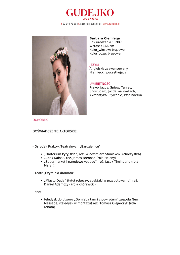 T 22 840 76 20 | E [email protected] | www.gudejko.pl Barbara Ciemięga Rok urodzenia : 1987 Wzrost : 166 cm Kolor_wlosow: brązowe Kolor_oczu: brązowe JĘZYKI Angielski: zaawansowany Niemiecki: początkujący UMIEJĘTNOŚCI Prawo_jazdy, Spiew, Taniec, Snowboard, Jazda_na_nartach, Akrobatyka, Plywanie, Wspinaczka DOROBEK DOŚWIADCZENIE AKTORSKIE: - Ośrodek Praktyk Teatralnych „Gardzienice”: „Oratorium Pytyjskie”, reż. Włodzimierz Staniewski (chórzystka) „Znak Kaina”, reż. James Brennan (rola Heleny) „Supermarket i narodowe voodoo”, reż. Jacek Timingeriu (rola Maryji) - Teatr „Czytelnia dramatu”: „Miasto Dada” (tytuł roboczy, spektakl w przygotowaniu), reż. Daniel Adamczyk (rola chórzystki) -inne: teledysk do utworu „Do nieba tam i z powrotem” zespołu New Message, (teledysk w montażu) reż. Tomasz Olejarczyk (rola robota) Powered by TCPDF (www.tcpdf.org)