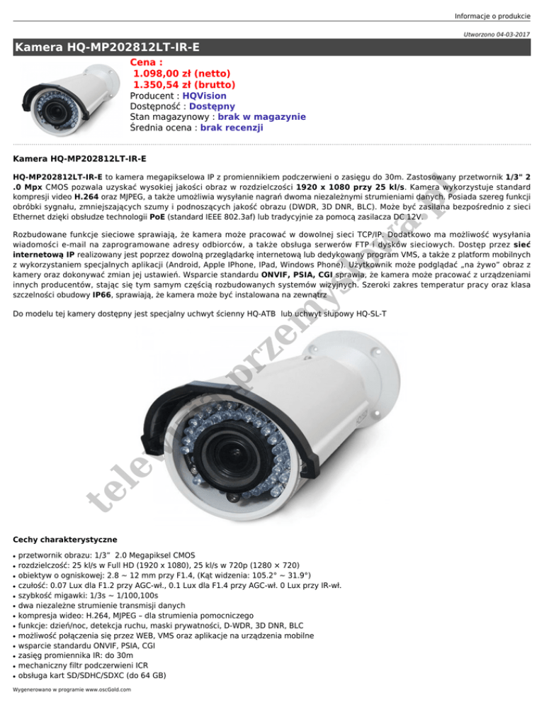 Informacje o produkcie Utworzono 04-03-2017 Kamera HQ-MP202812LT-IR-E Cena : 1.098,00 zł (netto) 1.350,54 zł (brutto) Producent : HQVision Dostępność : Dostępny Stan magazynowy : brak w magazynie Średnia ocena : brak recenzji Kamera HQ-MP202812LT-IR-E a. pl HQ-MP202812LT-IR-E to kamera megapikselowa IP z promiennikiem podczerwieni o zasięgu do 30m. Zastosowany przetwornik 1/3" 2 .0 Mpx CMOS pozwala uzyskać wysokiej jakości obraz w rozdzielczości 1920 x 1080 przy 25 kl/s. Kamera wykorzystuje standard kompresji video H.264 oraz MJPEG, a także umożliwia wysyłanie nagrań dwoma niezależnymi strumieniami danych. Posiada szereg funkcji obróbki sygnału, zmniejszających szumy i podnoszących jakość obrazu (DWDR, 3D DNR, BLC). Może być zasilana bezpośrednio z sieci Ethernet dzięki obsłudze technologii PoE (standard IEEE 802.3af) lub tradycyjnie za pomocą zasilacza DC 12V. ze m ys lo w Rozbudowane funkcje sieciowe sprawiają, że kamera może pracować w dowolnej sieci TCP/IP. Dodatkowo ma możliwość wysyłania wiadomości e-mail na zaprogramowane adresy odbiorców, a także obsługa serwerów FTP i dysków sieciowych. Dostęp przez sieć internetową IP realizowany jest poprzez dowolną przeglądarkę internetową lub dedykowany program VMS, a także z platform mobilnych z wykorzystaniem specjalnych aplikacji (Android, Apple IPhone, IPad, Windows Phone). Użytkownik może podglądać „na żywo” obraz z kamery oraz dokonywać zmian jej ustawień. Wsparcie standardu ONVIF, PSIA, CGI sprawia, że kamera może pracować z urządzeniami innych producentów, stając się tym samym częścią rozbudowanych systemów wizyjnych. Szeroki zakres temperatur pracy oraz klasa szczelności obudowy IP66, sprawiają, że kamera może być instalowana na zewnątrz te le w iz ja -p r Do modelu tej kamery dostępny jest specjalny uchwyt ścienny HQ-ATB lub uchwyt słupowy HQ-SL-T Cechy charakterystyczne ● ● ● ● ● ● ● ● ● ● ● ● ● przetwornik obrazu: 1/3” 2.0 Megapiksel CMOS rozdzielczość: 25 kl/s w Full HD (1920 x 1080), 25 kl/s w 720p (1280 × 720) obiektyw o ogniskowej: 2.8 ~ 12 mm przy F1.4, (Kąt widzenia: 105.2° ~ 31.9°) czułość: 0.07 Lux dla F1.2 przy AGC-wł., 0.1 Lux dla F1.4 przy AGC-wł. 0 Lux przy IR-wł. szybkość migawki: 1/3s ~ 1/100,100s dwa niezależne strumienie transmisji danych kompresja wideo: H.264, MJPEG – dla strumienia pomocniczego funkcje: dzień/noc, detekcja ruchu, maski prywatności, D-WDR, 3D DNR, BLC możliwość połączenia się przez WEB, VMS oraz aplikacje na urządzenia mobilne wsparcie standardu ONVIF, PSIA, CGI zasięg promiennika IR: do 30m mechaniczny filtr podczerwieni ICR obsługa kart SD/SDHC/SDXC (do 64 GB) Wygenerowano w programie www.oscGold.com ● zasilanie: 12VDC lub PoE (IEEE 802.3af) obudowa: klasa szczelności IP66 ze m ys lo w a. pl ● -p r Specyfikacja: Model 1/3 s ~ 1/100,100 s 0.07 Lux dla F1.2 przy AGC-wł. , 0Lux przy IR-wł. Mechaniczny filtr podczerwieni - ICR 2,8mm - 12 mm F1.4 (Kąt widzenia: 91.2° ~ 28.3°) Zasięg do 30m, EXIR Dzień/noc, detekcja ruchu, maski prywatności, D-WDR, 3D DNR, BLC Video H.264 / MJPEG (MJPEG - w strumieniu pomocniczym) 25 kl/s w Full HD (1920 x 1080), 25 kl/s w 720p (1280 × 720) 32 Kbps - 16 Mbps Regulacja jasności, kontrastu, saturacji przez przeglądarkę lub program VMS Interfejsy Wbudowane gniazdo kart micro SD/SDHC/SDXC do 64GB Sieć RJ-45 (10/100Base-T) TCP/IP, HTTP, DHCP, DNS, DDNS, RTP, RTSP, PPPoE, SMTP, NTP, SNMP, HTTPS, FTP, 802.1x, QoS, Pv6, Bonjour WEB, VMS, NVR, aplikacje na urządzenia mobilne NAS, możliwość tworzenia własnego serwera do magazynowania nagrań na PC Podwójny strumień,autentyfikacja użytkownika, znak wodny ONVIF, PSIA, CGI Parametry pracy -30 ° C ~ +60 ° C, wilgotność 10% ~ 90% DC12V, PoE (IEEE 802.3af) Max. 7,5W 95 x 105x 258.6 mm Klasa szczelności IP66 te le Elektroniczna migawka Mini. oświetlenie Dzień / Noc Obiektyw Promiennik IR Funkcje poprawy obrazu Kompresja audio Ilość klatek Bitrate Ustawienie obrazu Karty SD Ethernet Funkcje sieciowe Interfejs użytkownika Dyski sieciowe Funkcjonalność Kompatybilność Środowisko pracy Zasilanie Pobór mocy Wymiary Obudowa Kamera 1/3” Progressive Scan CMOS w iz ja Sensor obrazu HQ-MP202812LT-IR-E Informacje o produkcie 1200g te le w iz ja -p r ze m ys lo w a. pl Waga Wygenerowano w programie www.oscGold.com