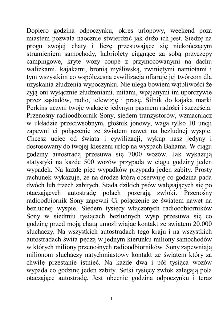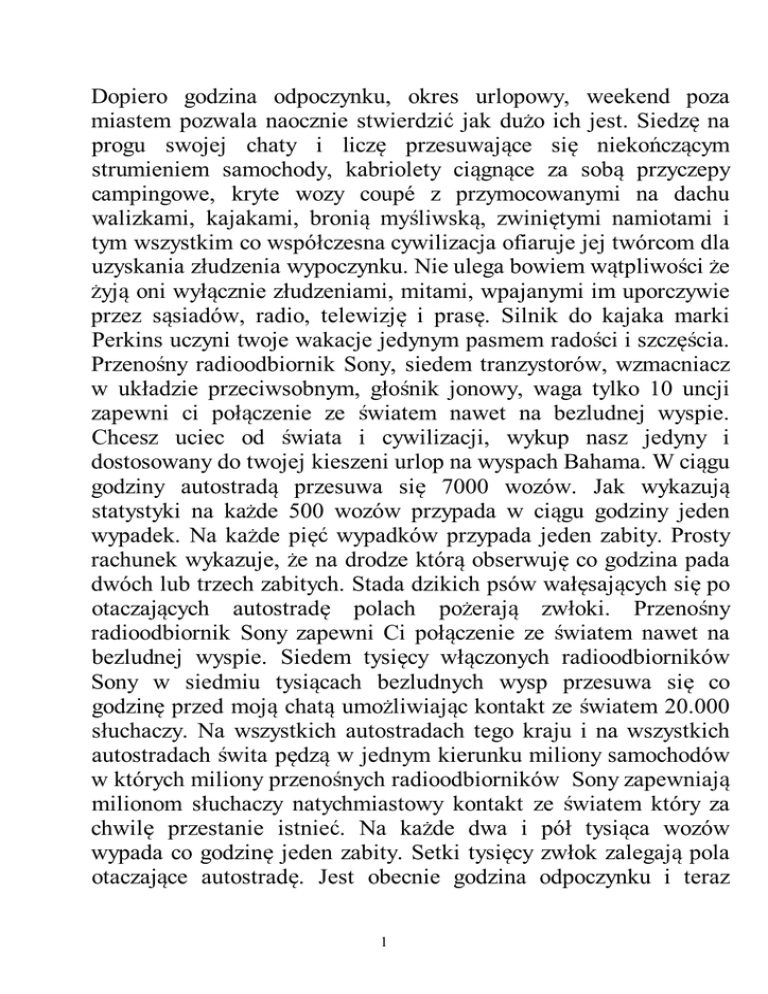 Dopiero godzina odpoczynku, okres urlopowy, weekend poza miastem pozwala naocznie stwierdzić jak dużo ich jest. Siedzę na progu swojej chaty i liczę przesuwające się niekończącym strumieniem samochody, kabriolety ciągnące za sobą przyczepy campingowe, kryte wozy coupé z przymocowanymi na dachu walizkami, kajakami, bronią myśliwską, zwiniętymi namiotami i tym wszystkim co współczesna cywilizacja ofiaruje jej twórcom dla uzyskania złudzenia wypoczynku. Nie ulega bowiem wątpliwości że żyją oni wyłącznie złudzeniami, mitami, wpajanymi im uporczywie przez sąsiadów, radio, telewizję i prasę. Silnik do kajaka marki Perkins uczyni twoje wakacje jedynym pasmem radości i szczęścia. Przenośny radioodbiornik Sony, siedem tranzystorów, wzmacniacz w układzie przeciwsobnym, głośnik jonowy, waga tylko 10 uncji zapewni ci połączenie ze światem nawet na bezludnej wyspie. Chcesz uciec od świata i cywilizacji, wykup nasz jedyny i dostosowany do twojej kieszeni urlop na wyspach Bahama. W ciągu godziny autostradą przesuwa się 7000 wozów. Jak wykazują statystyki na każde 500 wozów przypada w ciągu godziny jeden wypadek. Na każde pięć wypadków przypada jeden zabity. Prosty rachunek wykazuje, że na drodze którą obserwuję co godzina pada dwóch lub trzech zabitych. Stada dzikich psów wałęsających się po otaczających autostradę polach pożerają zwłoki. Przenośny radioodbiornik Sony zapewni Ci połączenie ze światem nawet na bezludnej wyspie. Siedem tysięcy włączonych radioodbiorników Sony w siedmiu tysiącach bezludnych wysp przesuwa się co godzinę przed moją chatą umożliwiając kontakt ze światem 20.000 słuchaczy. Na wszystkich autostradach tego kraju i na wszystkich autostradach świta pędzą w jednym kierunku miliony samochodów w których miliony przenośnych radioodbiorników Sony zapewniają milionom słuchaczy natychmiastowy kontakt ze światem który za chwilę przestanie istnieć. Na każde dwa i pół tysiąca wozów wypada co godzinę jeden zabity. Setki tysięcy zwłok zalegają pola otaczające autostradę. Jest obecnie godzina odpoczynku i teraz 1 dopiero zdać sobie można w pełni sprawę ilu ich jest. Mówiłem, że świat przestanie istnieć. To nieprawda świat już nie istnieje. Świat defiluje obecnie wszystkimi autostradami stojącymi do jego dyspozycji w poszukiwaniu iluzji wypoczynku i iluzji istnienia, które za chwilę przestanie nim być. Miliony samochodów zatrzymują się nad brzegami tysięcy jezior i miliony rąk wyłączają klawisze w przenośnych radioodbiornikach Sony /siedem tranzystorów wzmacniacz w układzie przeciwsobnym/ wyciągając się z kolei po sprzęt wędkarski firmy Kodel i po silniczki kajakowe Perkinsa. Dziesiątki milionów przekonanych jest o tym że korzysta w tej chwili z pełni życia. Stada dzikich psów pożerają zwłoki tych co przestali już być przekonani o czymkolwiek. Układy doprowadzające paliwo musiały zostać ukryte na głębokości kilkudziesięciu metrów, tak by nie mogły zostać przerwane na skutek sabotażu lub bombardowania. Część przewodów zabezpieczona jest ponadto przeciwko skutkom olbrzymiego ciśnienia jakie wywierać musi gaz pędny, którego temperatura obniżona została do minus 80 stopni Celsjusza. Stale zagraża niebezpieczeństwo wybuchu, którego konsekwencją byłoby odcięcie bazy od dopływu paliwa na skutek czego rakiety stałyby się tylko bezużytecznymi wieżyczkami z duraluminium i metali półszlachetnych, napełnionych zorganizowanym chaosem drutów i tranzystorów. 28.10.63. 2 Dokładna liczba jest niepotrzebna. Jest chyba zresztą obojętna. Tak samo dla bakterii jak i dla nas. Zresztą nie chodzi o zadanie śmierci totalne, bo chyba po pierwsze taka nie istnieje – musiałyby zginąć i bakterie – po drugie jest ona niepotrzebna. Nie wiem czy chodzi mi zemstę czy tylko o nienawiść. Jeśli o zemstę to nie potrafiłbym określić za co. Powodów nienawiści także nie potrafiłbym sprecyzować lecz mimo wszystko to określenie wydaje mi się bardziej adekwatne do stanu jaki określić pragnąłbym. W każdym razie liczba o której myślę jest niesłychanie wielka. Można by powiedzieć: są ich miliony, lecz gdy te miliony podzielimy przez tysiące to zostaną również miliony. Może więc mówić miliardach? Z miliardami będzie to samo. Matematyczne i arytmetyczne określenia zawodzą gdy idzie o opisanie nienawiści. Totalnej nienawiści. Pierwsza lepsza autostrada w tym kraju wytapetowana jest ich samochodami jak perski dywan. Każdy samochód ciągnie przyczepę campingową, lub w braku tejże dźwiga na dachu zrolowany namiot, wiosła i silniczek kajakowy wędki, buty rybackie, walizki ze sprzętem turystycznym i cały ten okropny kram zachwalany we wszystkich pismach i rozprowadzany przez wszystkie sklepy, surogat iluzji wypoczynku i powodzenia w życiu. Czy kupiłeś już niezawodny w użyciu interferencyjny tłumik dźwięku Antisono? Mikrofon krystaliczny, przedwzmacniacz tranzystorowy, wzmacniacz w układzie przeciwsobnym, głośnik jonowy. Waga tylko pół funta, cena tylko 99 Dol i 50 centów. Wraz z szerokopasmowym mikrofonem wstęgowym cena zaledwie 119 dol i 50 centów. Mężczyzna w zmiętym ubraniu, niebieskie cienie pod oczyma szarpie rękoma znajdujące się w nieładzie włosy dwaj koledzy biurowi za jego plecami wymieniają uwagi, Których treść 3 wydrukowana jest w obłoczkach narysowanych nad ich głowami: Ted stał się ostatnio niezwykle nerwowy. Jeżeli tak dalej będzie może stracić posadę, powinien udać się do psychiatry. Na następnym rysunku mężczyzna imieniem Ted zwierza się ze swych kłopotów doktorowi:… nie mogę skupić myśli, czuję jak we mnie wszystko płonie, ucisk kołnierzyka nie pozwala mi na schwytanie oddechu…, Zbliżenie twarzy psychiatry opatrzone jest pokaźnych rozmiarów obłoczkiem:… przyczyną pańskich dolegliwości jest nadmierny hałas. Nadmierny 