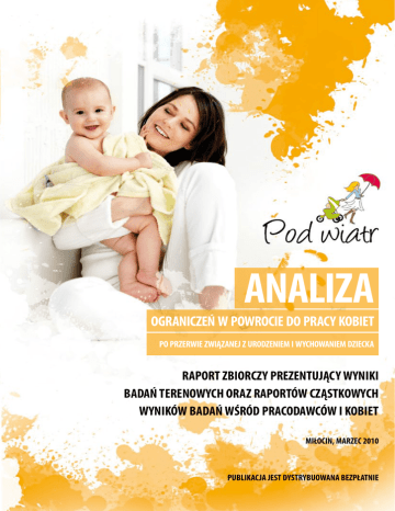 ANALIZA OGRANICZEŃ W POWROCIE DO PRACY KOBIET PO PRZERWIE ZWIĄZANEJ Z URODZENIEM I WYCHOWANIEM DZIECKA RAPORT ZBIORCZY PREZENTUJĄCY WYNIKI BADAŃ TERENOWYCH ORAZ RAPORTÓW CZĄSTKOWYCH WYNIKÓW BADAŃ WŚRÓD PRACODAWCÓW I KOBIET MIŁOCIN, MARZEC 2010 PUBLIKACJA JEST DYSTRYBUOWANA BEZPŁATNIE Niniejszy materiał powstał jako rezultat projektu: POD WIATR ANALIZA OGRANICZEŃ W POWROCIE DO PRACY KOBIET POPRZERWIE ZWIĄZANEJ Z URODZENIE I WYCHOWANIEM DZIECKA Program Operacyjny Kapitał Ludzki Numer i nazwa Priorytetu: VI Rynek pracy otwarty dla wszystkich Numer i nazwa Działania: 6.1 Poprawa dostępu do zatrudnienia oraz wspieranie aktywności zawodowej w regionie Numer i nazwa Poddziałania: 6.1.1 Wsparcie osób pozostających bez zatrudnienia na regionalnym rynku pracy Nr projektu: WND-POKL.06.01.01-18-074/08 Instytucja Wdrażająca: Wojewódzki Urząd Pracy w Rzeszowie Strona projektu: www.podwiatr.bdcenter.pl Realizator projektu: BD Center 36-062 Zaczernie, Miłocin229 tel./fax (017) 858 12 94, tel. (017) 855 20 29 e-mail: [email protected] Internet: www.bdcenter.pl Kierownik projektu: dr Paweł Walawender Raport zbiorczy prezentujący wyniki badań terenowych oraz raportów cząstkowych wyników badań wśród pracodawców i kobiet Spis treści: 6 WSTĘP 9 1. podsumowanie badań ilościowych 9 1.1 Badania wśród kobiet pozostających bez pracy do 24 miesięcy od momentu zakończenia urlopu macierzyńskiego lub wychowawczego 12 1.2 Badania wśród pracodawców zatrudniających kobiety po przerwie związanejz urodzeniem dziecka 17 WNIOSKI 19 Spis tabel 19 Spis wykresów Projekt współfinansowany przez Unię Europejską w ramach Europejskiego Funduszu Społecznego 5 Raport zbiorczy prezentujący wyniki badań terenowych oraz raportów cząstkowych wyników badań wśród pracodawców i kobiet WSTĘP Wejście kobiet na rynek pracy w Polsce ma długą tradycję i sięga już XIX wieku. Korzenie zjawiska aktywizacji zawodowej kobiet sięgają okresu, gdy Polska utraciła niepodległość. Kobiety stanęły wówczas przed różnego rodzaju zadaniami. Z jednej strony zajmowały się odpowiednim wychowaniem dzieci, z drugiej zmuszone były do pełnienie tzw. ról męskich. Z uwagi na to, iż mężowie przebywali w więzieniach, na zesłaniu albo brali udział w powstaniach, z których częstokroć już nie powracali, to kobiety zajmowały się prowadzeniem gospodarstw oraz interesów. I wywiązywały się z tych wszystkich ról nad wyraz dobrze1. Sytuacja ta jednak nie miała masowego charakteru i dotyczyła jedynie niektórych warstw społecznych ówczesnego społeczeństwa polskiego. Powszechne rozpowszechnienie zjawiska pracy zawodowej kobiet rozpoczęło się na szerszą skalę w latach 60-tych XX wieku. Aktywizacja zawodowa nastąpiła w Polsce głównie na skutek przymusu ekonomicznego. W okresie socjalizmu utrzymywanie przez władze płac na niskim poziomie spowodowało, że przebywające dotąd w domu kobiety w wyniku ratowania budżetów domowych zmuszone zostały do podjęcia pracy zawodowej. Prowadzona w tym czasie przez władze propaganda rozpowszechniła ideę równouprawnienia kobiet2. Ideologia socjalistyczna wyrównywała prawa kobiety i mężczyzny wyrażające się w równym dostępie do pracy we wszystkich zawodach. Wejście kobiet na rynek pracy wydawać by się mogło rodzajem awansu społecznego, podkreślić jednak należy, iż od tego momentu kobieta zaczęła odgrywać potrójną rolę, a mianowicie: kobiety-pracownika, kobiety-żony, kobiety-matki. Bez wątpienia niezwykle silny wpływ na zróżnicowanie sytuacji kobiet i mężczyzn na rynku pracy, a także znaczący spadek aktywności zawodowej kobiet, miała ostatnia dekada XX wieku. W Polsce to okres ważnych zmian społeczno-gospodarczych, których efekty-zarówno pozytywne, jak i negatywne- odczuwane były i są nadal przez różne grupy społeczne. Dotyczyły one generalnie wszystkich osób aktywnych 6 zawodowo, niemniej jednak najbardziej niekorzystnie wpłynęły na sytuację kobiet. Praca stała się towarem i zaczęła podlegać regułom gry rynkowej. Proces dezaktywizacji kobiet nasilił się wraz z przejściem od gospodarki planowanej do gospodarki rynkowej. Do najważniejszych czynników, które wywarły wpływ na zaobserwowane zmiany zalicza się: wydłużenie okresu kształcenia, przerwy w zatrudnieniu wynikające z korzystania z urlopu macierzyńskiego lub wychowawczego, zmiany w zakresie polityki rodzinnej w Polsce, możliwości wcześniejszego przejścia na emeryturę.3 Pomimo tego, że kobiety są statystycznie lepiej wykształcone niż mężczyźni, to jednak na rynku pracy ich pozycja jest znacznie słabsza. Przez szereg lat stanowiły i nadal stanowią większość wśród osób pozostających bez pracy. Jeśli już ją podejmą, zarabiają mniej od mężczyzn, rzadziej awansują, częściej są zwalniane, i mniej chętnie przyjmowane do pracy. Ponadto, choć polskie prawo zapewnia równe traktowanie kobiet i mężczyzn w zakresie dostępu do pracy, szkolenia, awansu zawodowego i warunków zatrudnienia spotykamy wiele różnic, które wynikają z tradycyjnego postrzegania roli kobiet jako odpowiedzialnych za opiekę nad dziećmi i prowadzenie domu. Wydaje się, że jedną z głównych przyczyn sprawiających, iż kobiety przegrywają na rynku pracy z mężczyznami o podobnym, a nawet niższym wykształceniu, jest konieczność ograniczania pracy w związku z zaangażowaniem w opiekę nad dziećmi. Wpływa to na ocenę kobiet jako pracowników. Jest bowiem bardzo prawdopodobne, że młoda kobieta będzie przerywać pracę lub ograniczać jej czas w związku z opieka nad dzieckiem. Nasilenie bierności zawodowej kobiet sprawujących opiekę występuję przede wszystkim w wieku od 25 do 34 lat, a więc wówczas, kiedy mężczyźni najbardziej dynamicznie wspinają się po szczeblach awansu zawodowego. Trudno im później nadrobić te różnice, tym bardziej, że przez cały czas – także wó