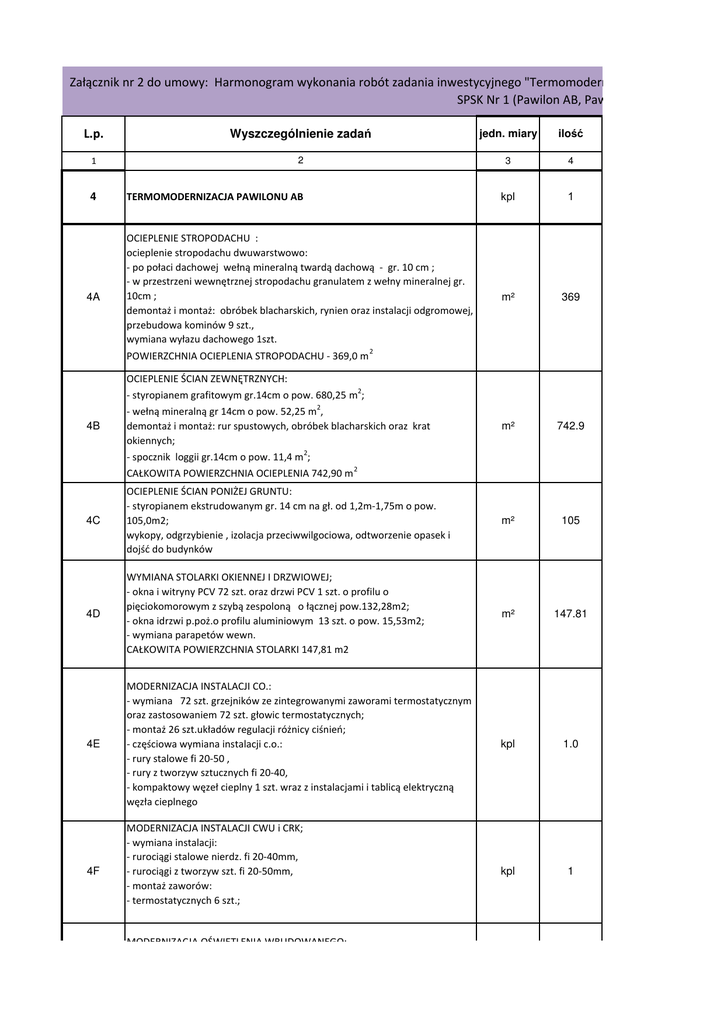 Załącznik nr 2 do umowy: Harmonogram wykonania robót zadania inwestycyjnego "Termomodernizacja budynków wraz SPSK Nr 1 (Pawilon AB, Pawilon CD )" L.p. Wyszczególnienie zadań jedn. miary ilość 1 2 3 4 4 TERMOMODERNIZACJA PAWILONU AB kpl 1 m² 369 m² 742.9 4C OCIEPLENIE ŚCIAN PONIŻEJ GRUNTU: - styropianem ekstrudowanym gr. 14 cm na gł. od 1,2m-1,75m o pow. 105,0m2; wykopy, odgrzybienie , izolacja przeciwwilgociowa, odtworzenie opasek i dojść do budynków m² 105 4D WYMIANA STOLARKI OKIENNEJ I DRZWIOWEJ; - okna i witryny PCV 72 szt. oraz drzwi PCV 1 szt. o profilu o pięciokomorowym z szybą zespoloną o łącznej pow.132,28m2; - okna idrzwi p.poż.o profilu aluminiowym 13 szt. o pow. 15,53m2; - wymiana parapetów wewn. CAŁKOWITA POWIERZCHNIA STOLARKI 147,81 m2 m² 147.81 4E MODERNIZACJA INSTALACJI CO.: - wymiana 72 szt. grzejników ze zintegrowanymi zaworami termostatycznym oraz zastosowaniem 72 szt. głowic termostatycznych; - montaż 26 szt.układów regulacji różnicy ciśnień; - częściowa wymiana instalacji c.o.: - rury stalowe fi 20-50 , - rury z tworzyw sztucznych fi 20-40, - kompaktowy węzeł cieplny 1 szt. wraz z instalacjami i tablicą elektryczną węzła cieplnego kpl 1.0 kpl 1 4A OCIEPLENIE STROPODACHU : ocieplenie stropodachu dwuwarstwowo: - po połaci dachowej wełną mineralną twardą dachową - gr. 10 cm ; - w przestrzeni wewnętrznej stropodachu granulatem z wełny mineralnej gr. 10cm ; demontaż i montaż: obróbek blacharskich, rynien oraz instalacji odgromowej, przebudowa kominów 9 szt., wymiana wyłazu dachowego 1szt. POWIERZCHNIA OCIEPLENIA STROPODACHU - 369,0 m 2 OCIEPLENIE ŚCIAN ZEWNĘTRZNYCH: - styropianem grafitowym gr.14cm o pow. 680,25 m2; 4B - wełną mineralną gr 14cm o pow. 52,25 m2, demontaż i montaż: rur spustowych, obróbek blacharskich oraz krat okiennych; - spocznik loggii gr.14cm o pow. 11,4 m2; CAŁKOWITA POWIERZCHNIA OCIEPLENIA 742,90 m 2 4F MODERNIZACJA INSTALACJI CWU i CRK; - wymiana instalacji: - rurociągi stalowe nierdz. fi 20-40mm, - rurociągi z tworzyw szt. fi 20-50mm, - montaż zaworów: - termostatycznych 6 szt.; MODERNIZACJA OŚWIETLENIA WBUDOWANEGO: MODERNIZACJA OŚWIETLENIA WBUDOWANEGO: Zastosowanie: - opraw oświetlenia wbudowanego 86 szt.; - stateczników 15 szt.; - świetlówek kompaktowych 172szt. kpl 1.0 TERMOMODERNIZACJA PAWILONU CD kpl 1 5A OCIEPLENIE STROPODACHU: Ocieplenie stropodachu dwuwarstwowo: - po połaci dachowej wełną mineralną twardą dachową - gr. 10 cm o pow. 369,0 m2; - w przestrzeni przestrzeni wewnętrznej stropodachu granulatem z wełny mineralnej gr. 10cm o pow. 369,0 m2; Demontaż i montaż: obróbek blacharskich, rynien oraz instalacji odgromowej, przebudowa kominów 9 szt., wymiana wyłazu dachowego 1szt. POWIERZCHNIA OCIEPLENIA STROPODACHU - 369,0 m2 m2 369 5B OCIEPLENIE ŚCIAN ZEWNĘTRZNYCH: - styropianem grafitowym gr.14 o pow. 930,0 m2; demontaż i montaż: rur spustowych, obróbek blacharskich oraz krat, - strop pod loggią gr.14cm o pow. 11,4 m2; CAŁKOWITA POWIERZCNIA OCIEPLENIA -941,40 m2 m2 941.4 5C OCIEPLENIE ŚCIAN PONIŻEJ GRUNTU: - styropianem ekstrudowanym gr. 14 cm na gł. od 1,2m-1,75m o pow. 90,0m2; wykopy, odgrzybienie , izolacja przeciwwilgociowa, odtworzenie opasek i dojść do budynków m2 90 5D WYMIANA STOLARKI OKIENNEJ I DRZWIOWEJ; - okna i witryny PCV 37 szt. oraz drzwi PCV 1 szt. o profilu o pięciokomorowym z szybą zespoloną o łącznej pow.60,87m2; - drzwi drewniane z naświetlem 1szt.o pow. 1,85m2; - wymiana parapetów wewn. CAŁKOWITA POWIERZCHNIA STOLARKI 62,72 m2 m2 62.72 5E MODERNIZACJI INSTALACJI CO.: - wymiana 37 szt. grzejników ze zintegrowanymi zaworami termostatycznymi oraz zastosowaniem 37 szt. głowic termostatycznych; - montaż 26szt. układów regulacjnych różnicy ciśnień; - wymiana instalacji c.o. na rury z tworzyw sztucznych fi 20-40, kpl 1 5F MODERNIZACJA WĘZŁA CIEPLNEGO Przebudowa węzła cieplnego: 1) Montaż kompaktowego dwufunkcujnego węzła cieplnego o mocy c.o.60kW i c.w.u.120kW - 1szt., 2) demontaż instalacji c.o. w węźle, 3) demontaż instalacji c.w.u. w węźle 4) wymiana instalacji c.o.: - rurociągi stalowe fi 20 - 40 mm, 5) wymiana instalacji c.w.u.: - rurociągi stalowe nierdzewne fi 20-40 mm, 6) roboty budowlane związane z wykonaniem instalacji c.o. w węźle, 7) tablica elektryczna z instalacjami węzła cieplnego kpl 1 4G 5 MODERNIZACJA INSTALACJI CWU i CRK; 5G MODERNIZACJA INSTALACJI CWU i CRK; - wymiana instalacji: - rurociągi z tworzyw szt. fi 20-50mm, - montaż zaworów: - termostatycznych 7szt.; - zawory przelotowe 22szt. kpl 1 5H MODERNIZACJA OŚWIETLENIA WBUDOWANEGO: Zastosowanie: - opraw oświetlenia wbudowanego 56 szt.; - stateczników 76szt.; - świetlówek kompaktowych 79 szt. kpl 1 RAZEM L.p. Wyszczególnienie zadań jedn. miary ilość 1 2 3 4 PAWILON AB kpl 1 2A Branża budowlana kpl 1 2B Branża sanitarna kpl 1 2C Branża elektryczna kpl 1 2D Technologia kpl 1 3 PAWILON CD kpl 1 3A Branża budowlana kpl 1 3B Branża sanitarna kpl 1 3C Branża elektryczna kpl 1 2 RAZEM ermomodernizacja budynków wraz z przebudową i rozbudową pomieszczeń Kliniki Psychiatrii ilon AB, Pawilon CD )" kwota netto kwota brutto 5 6 VII VIII IX X RAZEM 2015 7 8 9 10 11 2015 0 0 0 0 0 0 0 0 0 0 0 0 0 0 0 0 0 0 0 kwota netto kwota brutto 5 6 0 VII VIII IX X RAZEM 2015 7 8 9 10 11 2015 0 0 0 0 0 0 0 0 0 0 0 0