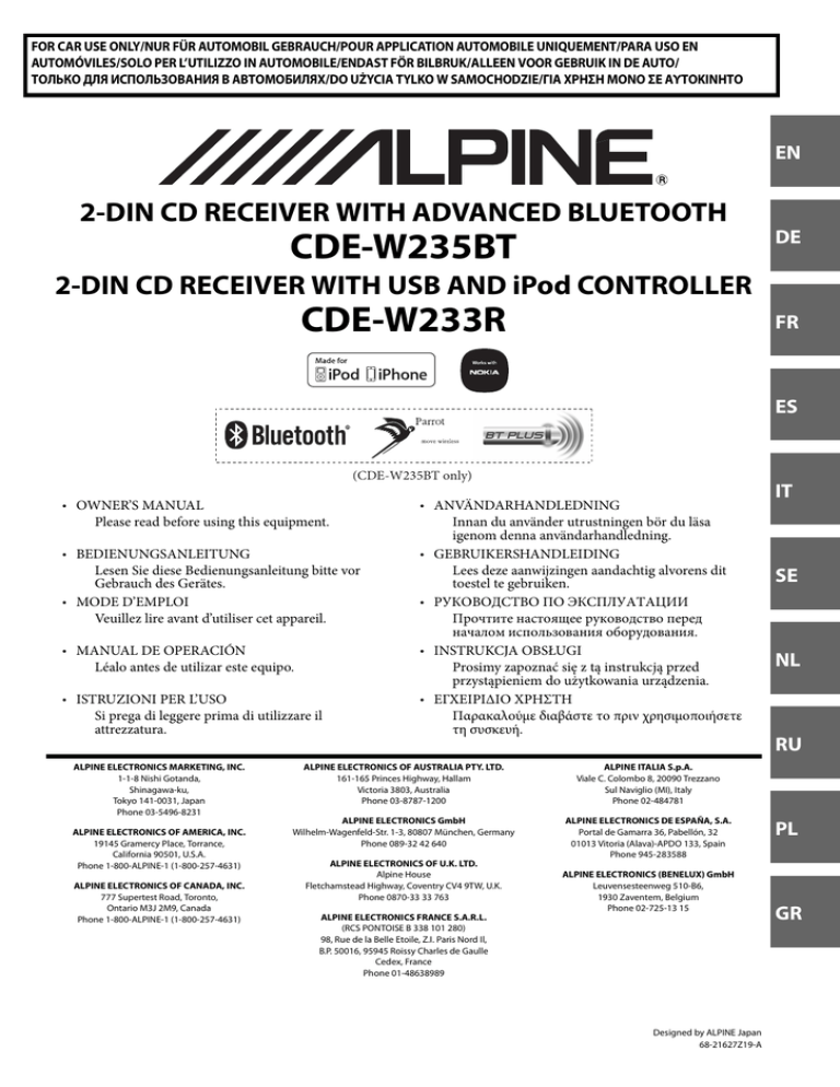 FOR CAR USE ONLY/NUR FÜR AUTOMOBIL GEBRAUCH/POUR APPLICATION AUTOMOBILE UNIQUEMENT/PARA USO EN AUTOMÓVILES/SOLO PER L’UTILIZZO IN AUTOMOBILE/ENDAST FÖR BILBRUK/ALLEEN VOOR GEBRUIK IN DE AUTO/ ТОЛЬКО ДЛЯ ИСПОЛЬЗОВАНИЯ В АВТОМОБИЛЯХ/DO UŻYCIA TYLKO W SAMOCHODZIE/ΓΙΑ ΧΡΗΣΗ ΜΟΝΟ ΣΕ ΑΥΤΟΚΙΝΗΤΟ EN R 2-DIN CD RECEIVER WITH ADVANCED BLUETOOTH DE CDE-W235BT 2-DIN CD RECEIVER WITH USB AND iPod CONTROLLER CDE-W233R FR ES (CDE-W235BT only) • OWNER’S MANUAL Please read before using this equipment. • BEDIENUNGSANLEITUNG Lesen Sie diese Bedienungsanleitung bitte vor Gebrauch des Gerätes. • MODE D’EMPLOI Veuillez lire avant d’utiliser cet appareil. • MANUAL DE OPERACIÓN Léalo antes de utilizar este equipo. • ISTRUZIONI PER L’USO Si prega di leggere prima di utilizzare il attrezzatura. • ANVÄNDARHANDLEDNING Innan du använder utrustningen bör du läsa igenom denna användarhandledning. • GEBRUIKERSHANDLEIDING Lees deze aanwijzingen aandachtig alvorens dit toestel te gebruiken. • РУКОВОДСТВО ПО ЭКСПЛУАТАЦИИ Прочтите настоящее руководство перед началом использования оборудования. • INSTRUKCJA OBSŁUGI Prosimy zapoznać się z tą instrukcją przed przystąpieniem do użytkowania urządzenia. • ΕΓΧΕΙΡΙΔΙΟ ΧΡΗΣΤΗ Παρακαλούμε διαβάστε το πριν χρησιμοποιήσετε τη συσκευή. IT SE NL RU ALPINE ELECTRONICS MARKETING, INC. 1-1-8 Nishi Gotanda, Shinagawa-ku, Tokyo 141-0031, Japan Phone 03-5496-8231 ALPINE ELECTRONICS OF AMERICA, INC. 19145 Gramercy Place, Torrance, California 90501, U.S.A. Phone 1-800-ALPINE-1 (1-800-257-4631) ALPINE ELECTRONICS OF CANADA, INC. 777 Supertest Road, Toronto, Ontario M3J 2M9, Canada Phone 1-800-ALPINE-1 (1-800-257-4631) ALPINE ELECTRONICS OF AUSTRALIA PTY. LTD. 161-165 Princes Highway, Hallam Victoria 3803, Australia Phone 03-8787-1200 ALPINE ITALIA S.p.A. Viale C. Colombo 8, 20090 Trezzano Sul Naviglio (MI), Italy Phone 02-484781 ALPINE ELECTRONICS GmbH Wilhelm-Wagenfeld-Str. 1-3, 80807 München, Germany Phone 089-32 42 640 ALPINE ELECTRONICS DE ESPAÑA, S.A. Portal de Gamarra 36, Pabellón, 32 01013 Vitoria (Alava)-APDO 133, Spain Phone 945-283588 ALPINE ELECTRONICS OF U.K. LTD. Alpine House Fletchamstead Highway, Coventry CV4 9TW, U.K. Phone 0870-33 33 763 ALPINE ELECTRONICS (BENELUX) GmbH Leuvensesteenweg 510-B6, 1930 Zaventem, Belgium Phone 02-725-13 15 ALPINE ELECTRONICS FRANCE S.A.R.L. (RCS PONTOISE B 338 101 280) 98, Rue de la Belle Etoile, Z.I. Paris Nord Il, B.P. 50016, 95945 Roissy Charles de Gaulle Cedex, France Phone 01-48638989 Designed by ALPINE Japan 68-21627Z19-A PL GR WYŁĄCZNY DYSTRYBUTOR HORN DISTRIBUTION S.A. UL. KURANTÓW 34 02-873 WARSZAWA TEL.: 0-22 331-55-55 FAX.: 0-22 331-55-00 WWW.ALPINE.COM.PL Centralny Serwis: ul. Kurantów 26, 02-873 Warszawa, tel. 22/331 55 33, [email protected] Spis treści Instrukcja obsługi OSTRZEŻENIE OSTRZEŻENIE ................................................ 6 PRZESTROGA................................................. 6 ŚRODKI OSTROŻNOŚCI ................................. 6 Czynności wstępne Lista akcesoriów ..........................................................9 Włączanie i wyłączenie zasilania ........................ 10 Wybór źródła dźwięku............................................ 10 Pierwsze włączenie systemu................................ 10 Regulacja głośności................................................. 10 Ustawianie czasu...................................................... 10 Radio Słuchanie radia ......................................................... 11 Ręczne programowanie stacji radiowych ....... 11 Automatyczne programowanie stacji .............. 11 Wybór zaprogramowanych stacji ...................... 11 Funkcja wyszukiwania częstotliwości............... 12 RDS Ustawianie trybu AF (częstotliwości alternatywnych) na ON/OFF ................................ 12 Odbieranie regionalnych (lokalnych) stacji RDS..................................................................... 13 Ustawianie funkcji PI SEEK .................................... 13 Ustawianie automatycznego dostosowywania czasu ............................................................................. 13 Odbieranie informacji o ruchu drogowym..... 14 Wyświetlanie tekstu nadawanego przez stację radiową ........................................................... 14 CD/MP3/WMA/AAC Odtwarzanie .............................................................. 14 Opcja Repeat Play .................................................... 15 M.I.X. (Odtwarzanie w kolejności losowej)...... 15 Wyszukiwanie z użyciem funkcji CD Text........ 15 Wyszukiwanie nazwy folderu/pliku (dotyczy plików MP3/WMA/AAC) ...................... 15 Tryb wyszukiwania według nazwy folderu...................................................................... 15 Tryb wyszukiwania według nazwy pliku..... 15 Informacje o plikach MP3/WMA/AAC............... 16 Słowniczek.............................................................. 17 POLSKI Ustawienia dźwięku Regulacja poziomu głośności subwoofera/ tonów niskich/tonów średnich/tonów wysokich/balansu (kanały lewy i prawy)/fader (przód-tył)/podbijania dźwięków niskich i wysokich/Defeat .......................................................17 Konfiguracja dźwięku..............................................18 Ustawienia korektora graficznego (F-EQ) ....18 Włączanie i wyłączanie funkcji podbijania dźwięków niskich i wysokich ...........................18 Regulacja krzywej parametrycznego korektora graficznego (3BAND EQ)................18 Ustawianie kontroli poziomu głośności tonów niskich ............................................................................18 Ustawianie poziomu głośności tonów średnich ........