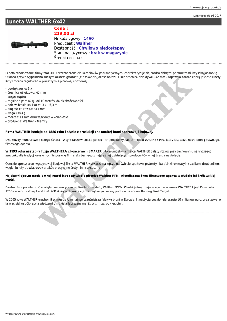 Informacje o produkcie Utworzono 04-03-2017 Luneta WALTHER 6x42 Cena : 219,00 zł Nr katalogowy : 1460 Producent : Walther Dostępność : Chwilowo niedostępny Stan magazynowy : brak w magazynie Średnia ocena : Luneta renomowanej firmy WALTHER przeznaczona dla karabinków pneumatycznych, charakteryzuje się bardzo dobrymi parametrami i wysoką jasnością. Szklana optyka wypełniona suchym azotem gwarantuje doskonałą jakość obrazu. Duża średnica obiektywu - 42 mm - zapewnia bardzo dobrą jasność lunety. Krzyż można regulować w płaszczyźnie pionowej i poziomej. ● ● ● ● ● ● ● ● powiększenie: 6 x średnica obiektywu: 42 mm krzyż: duplex regulacja paralaksy: od 10 metrów do nieskończoności pole widzenia na 100 m: 3 x – 5,3 m długość całkowita: 317 mm waga : 404 g montaż: 11 mm dwuczęściowy w komplecie produkcja: Walther – Niemcy er m ar k ● Firma WALTHER istnieje od 1886 roku i słynie z produkcji znakomitej broni sportowej i bojowej. Dziś służby mundurowe z całego świata - w tym także w polska policja – chętnie korzystają z modelu WALTHER P99, który jest także nową bronią sławnego, filmowego agenta. W 1993 roku nastąpiła fuzja WALTHERA z koncernem UMAREX, która umożliwiła marce WALTHER dalszy rozwój przy zachowaniu najwyższego szacunku dla tradycji oraz umocniła pozycję firmy jako jednego z najprężniej działających producentów w tej branży na świecie. Obecnie oprócz broni wyczynowej i bojowej firma WALTHER wytwarza najlepsze na świecie sportowe pistolety i karabinki rekreacyjne zasilane dwutlenkiem węgla, lunety do wiatrówek a także precyzyjne śruty i inne akcesoria at Najsławniejszym modelem tej marki jest oczywiście pistolet Walther PPK - nieodłączna broń filmowego agenta w służbie jej królewskiej mości. Bardzo dużą popularność zdobyła pneumatyczna replika tego modelu, Walther PPK/s. Z kolei jedną z najnowszych wiatrówek WALTHERA jest Dominator 1250 - wielostrzałowy karabinek PCP służący do rekreacji oraz wykorzystywany podczas zawodów Hunting Field Target. w W 2005 roku WALTHER uruchomił w mieście Ulm najnowocześniejszą fabrykę broni w Europie. Inwestycja pochłonęła prawie 10 milionów euro, zrealizowano ją w ścisłej współpracy z władzami Ulm. Hala fabryczna ma 12 tys. mkw. powierzchni. Wygenerowano w programie www.oscGold.com